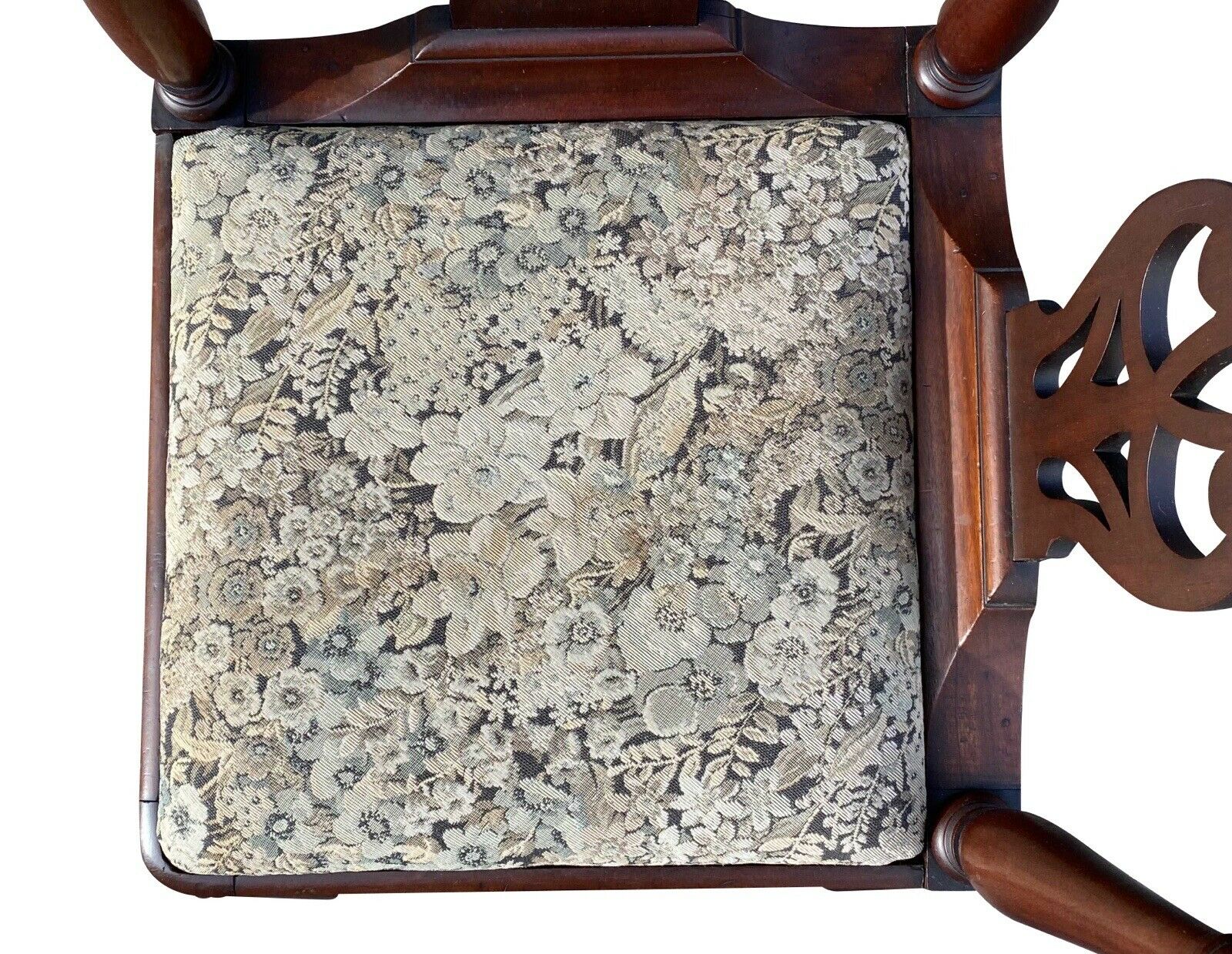 With our highest compliments and utmost honor, Bay Colony Antiques is proud to offer for sale this fantastic 19th century antique Chippendale Mahogany roundabout chair. The chair has a pierced splat, shell carved knees, and wonderfully carved ball & claw feet. These types of chairs were extremely desirable in the 18th century and were often used at desks because they’re very comfortable and the arms can fit under the lid of a writing desk. The chair is in fantastic condition with our only notes being a small repair to the back of the crest and a small repair to one of the splats that can both be seen in our 9th photo. The chair has a multicolor floral seat that’s in great condition free of any rips and holes. The chair measures 29 1/4” wide x 26” deep x 30 3/4” tall. The seat alone measures 15 1/2” wide x 15 1/2” deep with a seat height of 17”.