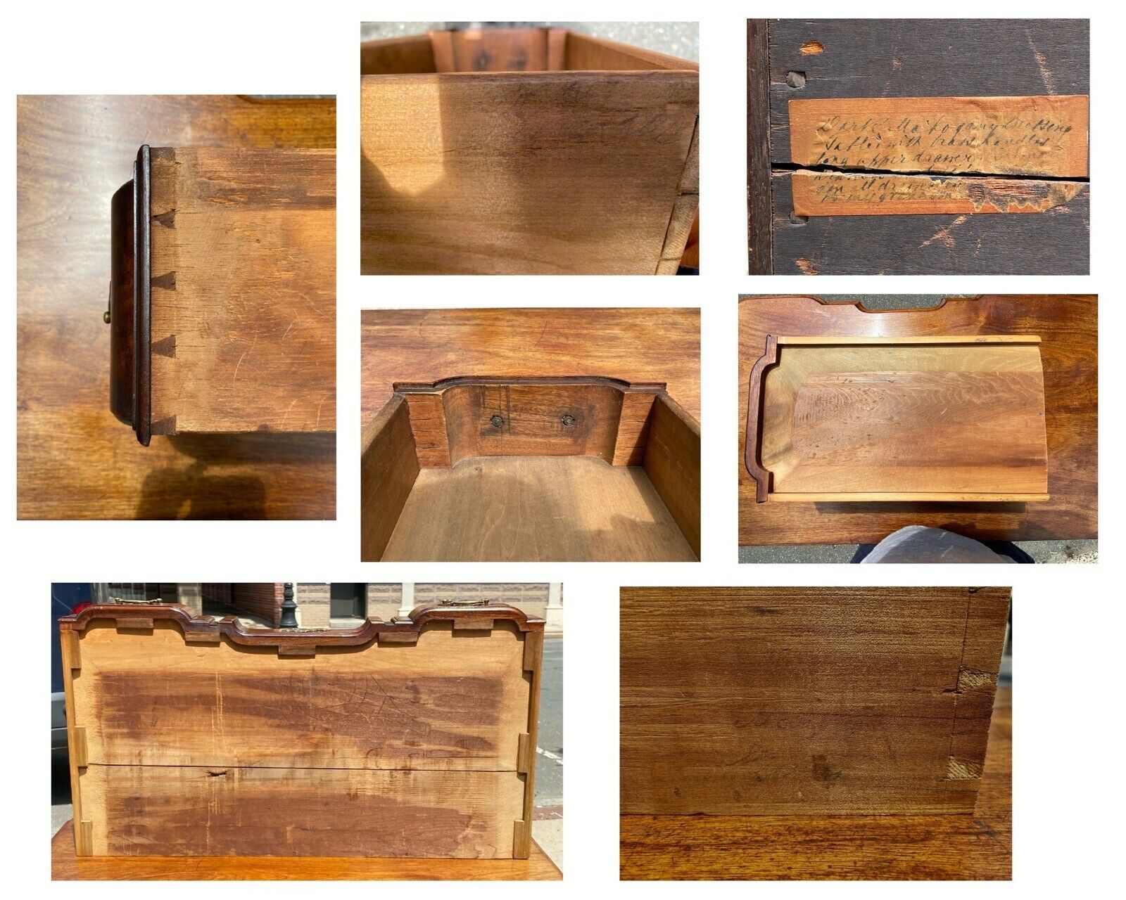 With our highest compliments and utmost honors, Bay Colony Antiques is extreme proud to offer for sale this exceptional 18th century antique Chippendale Mahogany shell carved kneehole desk. We are always in the market for these and most of the time have them sold before we even find them, but this desk is unspoken for and an absolute gem. The desk is crafted from old growth Caribbean Mahogany with a vibrant grain pattern and nice natural luster from the oil density of the wood. Aside from being a beautiful, imported wood that could be used to showcase your wealth, Mahogany is one of the most durable woods for cabinet making. The wood is extremely strong for its density and is resistant to atmospheric moisture and resistant to rotting & insect damage. The desk possesses finely formed block fronts drawers with molded faces and they all retain their original brass pulls. The desk has an elongated upper drawer and 7 below for a total of 8 drawers. The desk has 6 masterfully carved ball and claw legs with shell carvings at the knees and a full bodied shell carving on the center door. We found some old pencil script written on a drawer but were having some trouble reading it. We’re only allowed to upload 12 pictures but if there are any additional photos you may require please feel free to send us a message. The desk has an overhung top that mirrors the form of the case, and the top and base molding enhance the congruity of the design.