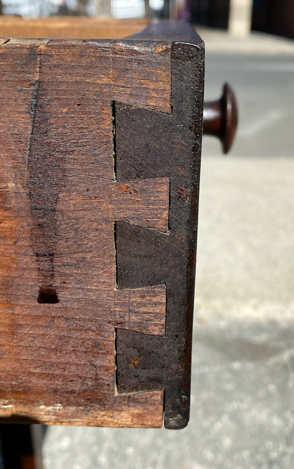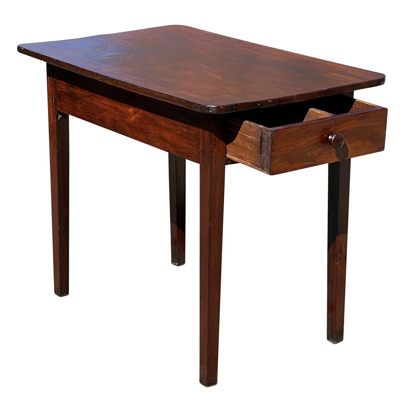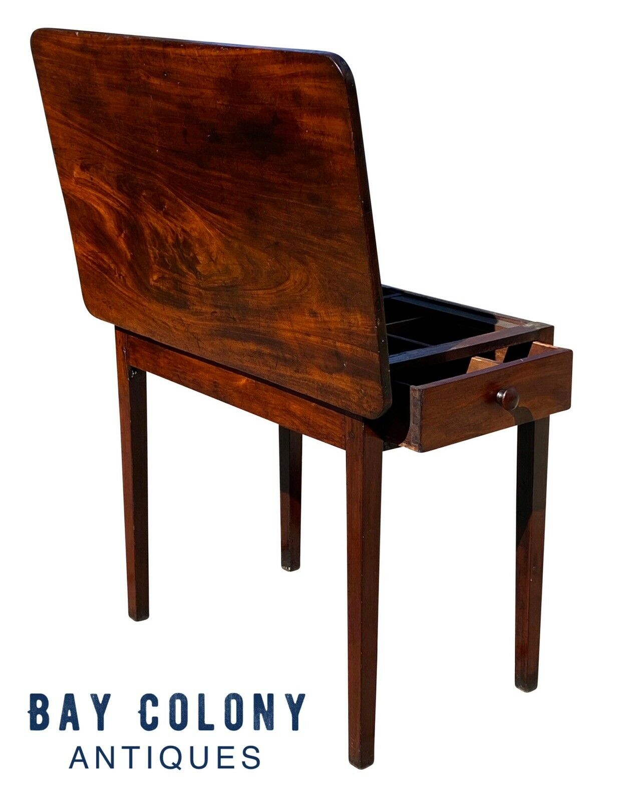 With our highest compliments and utmost honors Bay Colony Antiques is proud to bring to market one of the best 18th century antique sofa tables to surface in years. The tables is crafted from mahogany and is all peg joined with hand chamfered drawer bottoms and dovetailed drawer faces. The table has an impressive single board, solid mahogany top that can be flipped open to give access to the drawer and interior compartment. In the 18th & 19th century a slab of mahogany of this quality was very expensive, second only to rosewood. Caribbean Mahogany is the best in the world with unique mineral deposits and oil density that give it its signature sheen. Caribbean Mahogany was farmed to near extinction levels and thankfully the few forest that remain today are protected. When purchasing modern mahogany furniture you’re getting a different species in the same genus as mahogany but they’re worlds apart. Honduran & West Indian Mahogany are native to parts of Mexico, Central America, and island like Cuba, Jamaica, Puerto Rico, Dominican Republic, etc.. The table is in good condition considering it’s age with our only notes being minor surface scratches and a repair below the drawer box. The repair is old and we chose to leave it alone but if our end client wants the screws removed we’d be happy to have our restorer take them out and properly fill the screw holes. The table measures 21 3/4” wide x 35 1/2” long x 28 1/4” tall. When the top is flipped open the height is 46 1/2” tall.