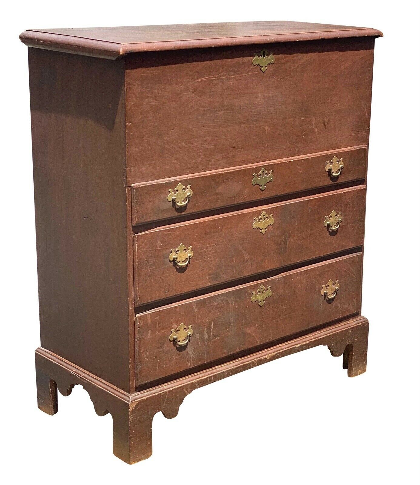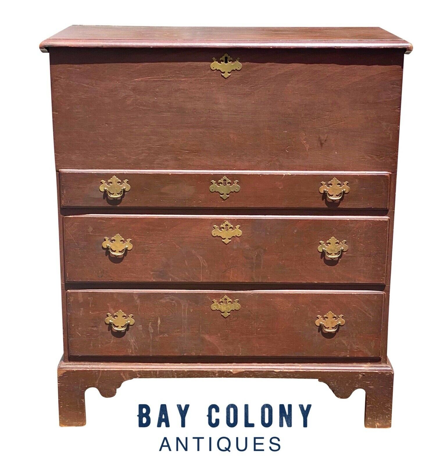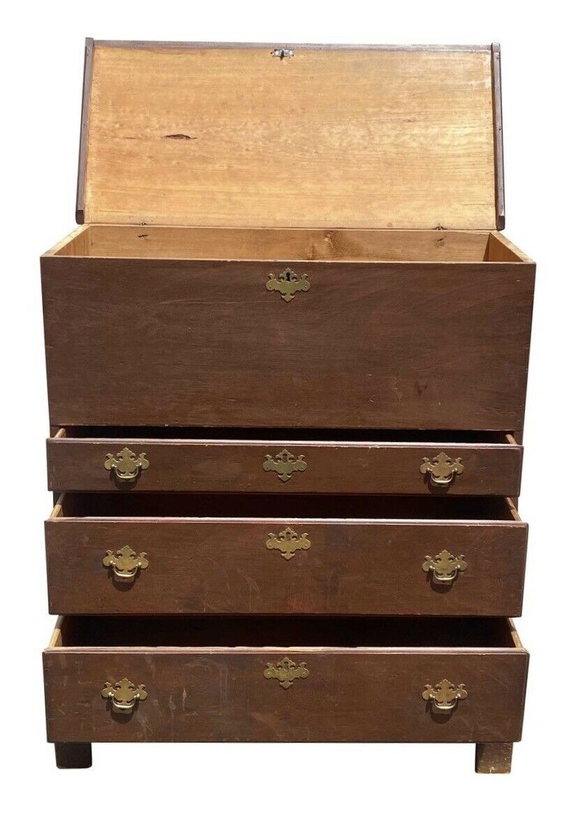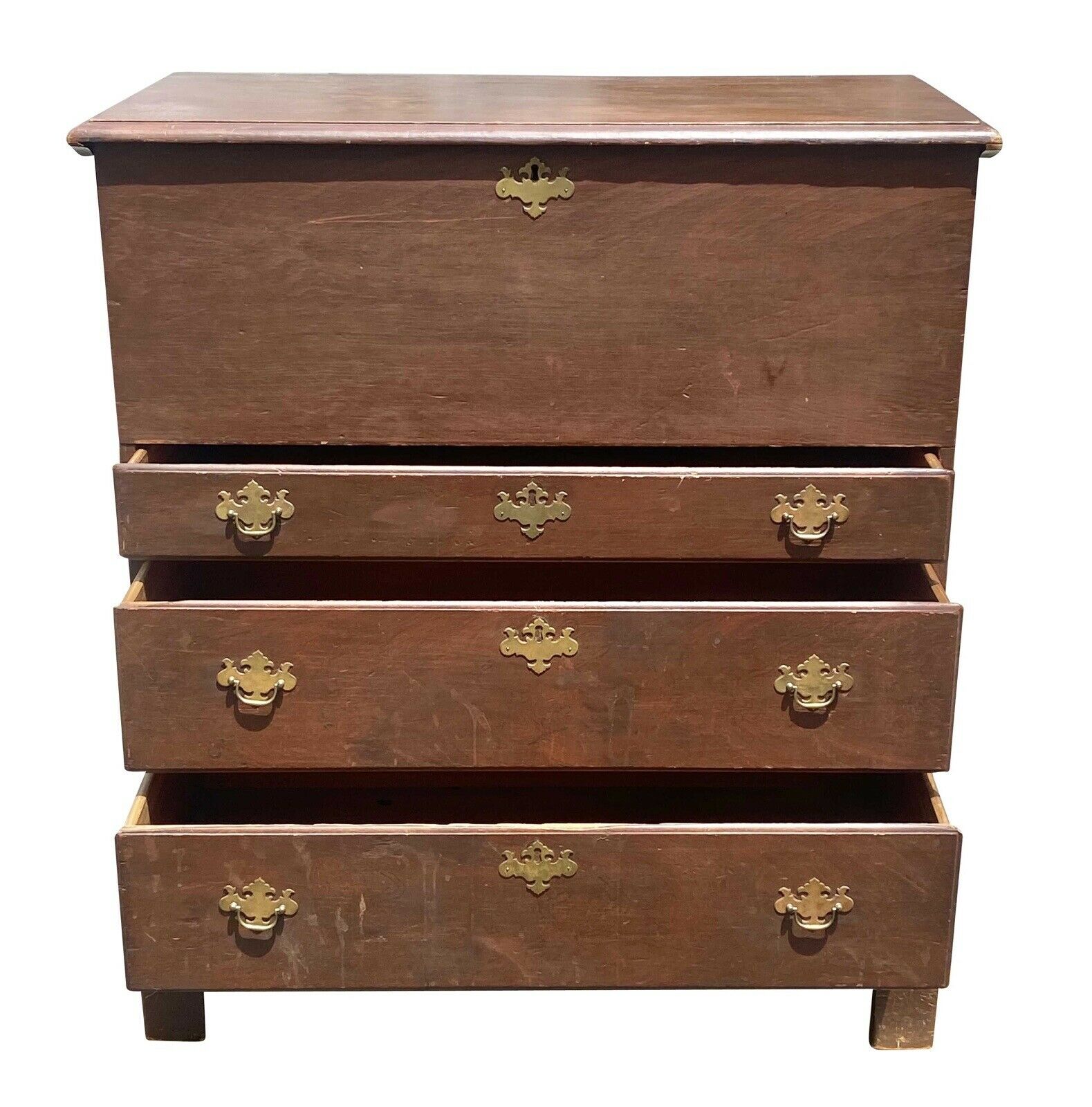 Bay Colony Antiques is pleased to offer for sale this fantastic 18th century grain painted blanket box / chest. The chest has three drawers all with their original brass hardware and the chest retains it’s original hinges, lock, and hasp. The drawers have hand cut dovetails and hand chamfered bottoms and are rich with tool & scribe marks. The chest has a two board back with original rose head nails and the original hinges are still present and work as intended. We photographed this in bright sunlight and the grain painting is a little faded because of it’s age but can be best seen in our side shots. The chest exhibits nice proportions on an elongated bracket base with a great scrolling pattern. The chest measures 37 1/2” wide x 18 1/4” deep x 43” tall. When the lift top is fully open the height is 60 1/4” tall. The upper cavity has useable dimensions of 34 1/2” wide x 15 1/2” deep x 11 7/8” tall.