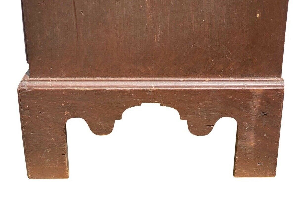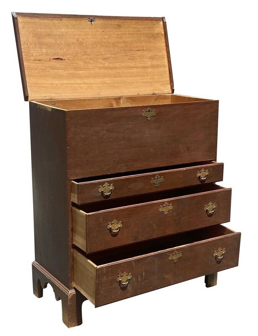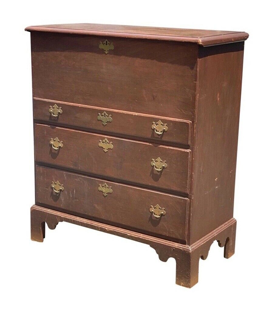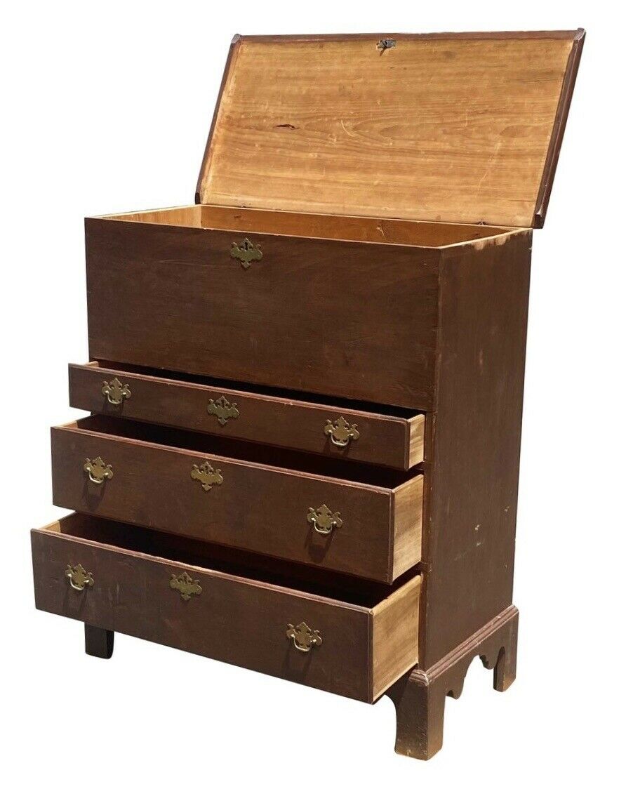 Bay Colony Antiques is pleased to offer for sale this fantastic 18th century grain painted blanket box / chest. The chest has three drawers all with their original brass hardware and the chest retains it’s original hinges, lock, and hasp. The drawers have hand cut dovetails and hand chamfered bottoms and are rich with tool & scribe marks. The chest has a two board back with original rose head nails and the original hinges are still present and work as intended. We photographed this in bright sunlight and the grain painting is a little faded because of it’s age but can be best seen in our side shots. The chest exhibits nice proportions on an elongated bracket base with a great scrolling pattern. The chest measures 37 1/2” wide x 18 1/4” deep x 43” tall. When the lift top is fully open the height is 60 1/4” tall. The upper cavity has useable dimensions of 34 1/2” wide x 15 1/2” deep x 11 7/8” tall.