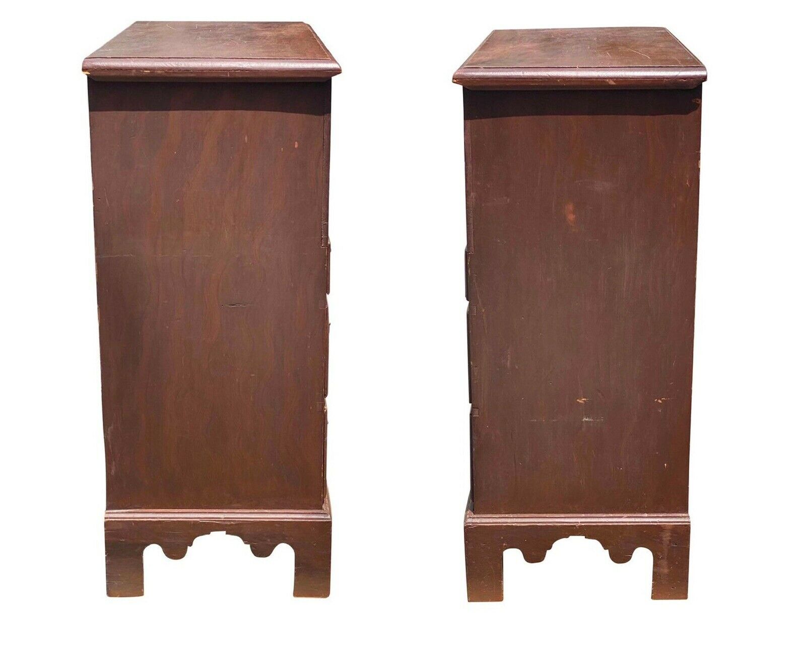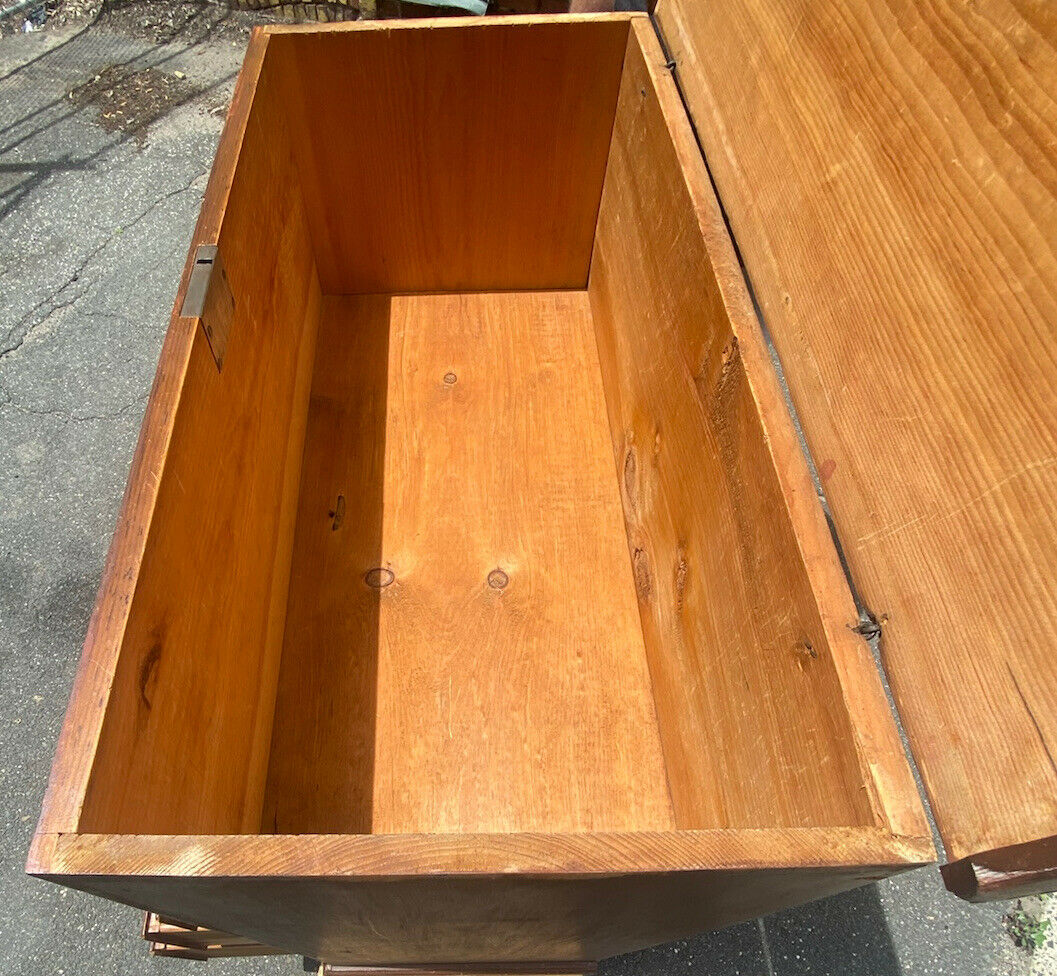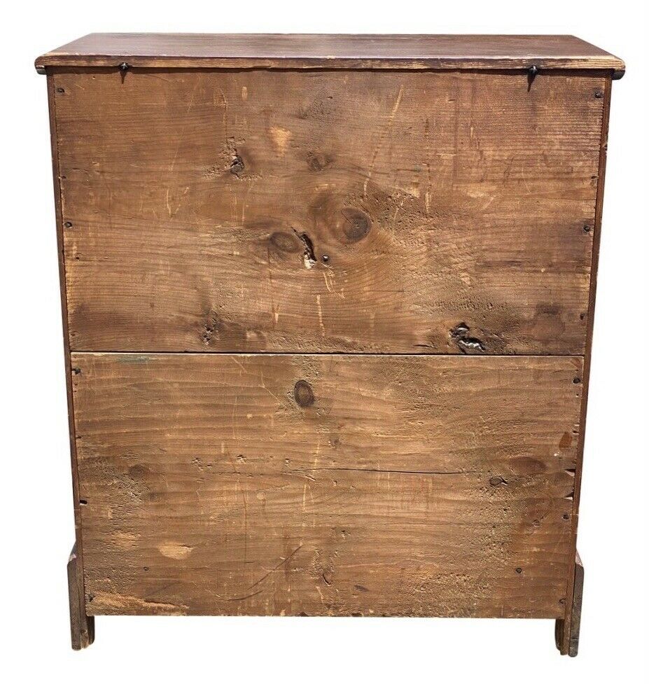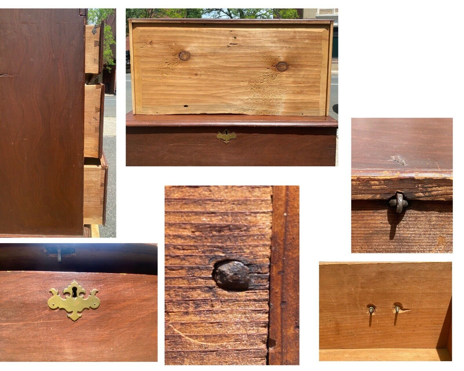 Bay Colony Antiques is pleased to offer for sale this fantastic 18th century grain painted blanket box / chest. The chest has three drawers all with their original brass hardware and the chest retains it’s original hinges, lock, and hasp. The drawers have hand cut dovetails and hand chamfered bottoms and are rich with tool & scribe marks. The chest has a two board back with original rose head nails and the original hinges are still present and work as intended. We photographed this in bright sunlight and the grain painting is a little faded because of it’s age but can be best seen in our side shots. The chest exhibits nice proportions on an elongated bracket base with a great scrolling pattern. The chest measures 37 1/2” wide x 18 1/4” deep x 43” tall. When the lift top is fully open the height is 60 1/4” tall. The upper cavity has useable dimensions of 34 1/2” wide x 15 1/2” deep x 11 7/8” tall.