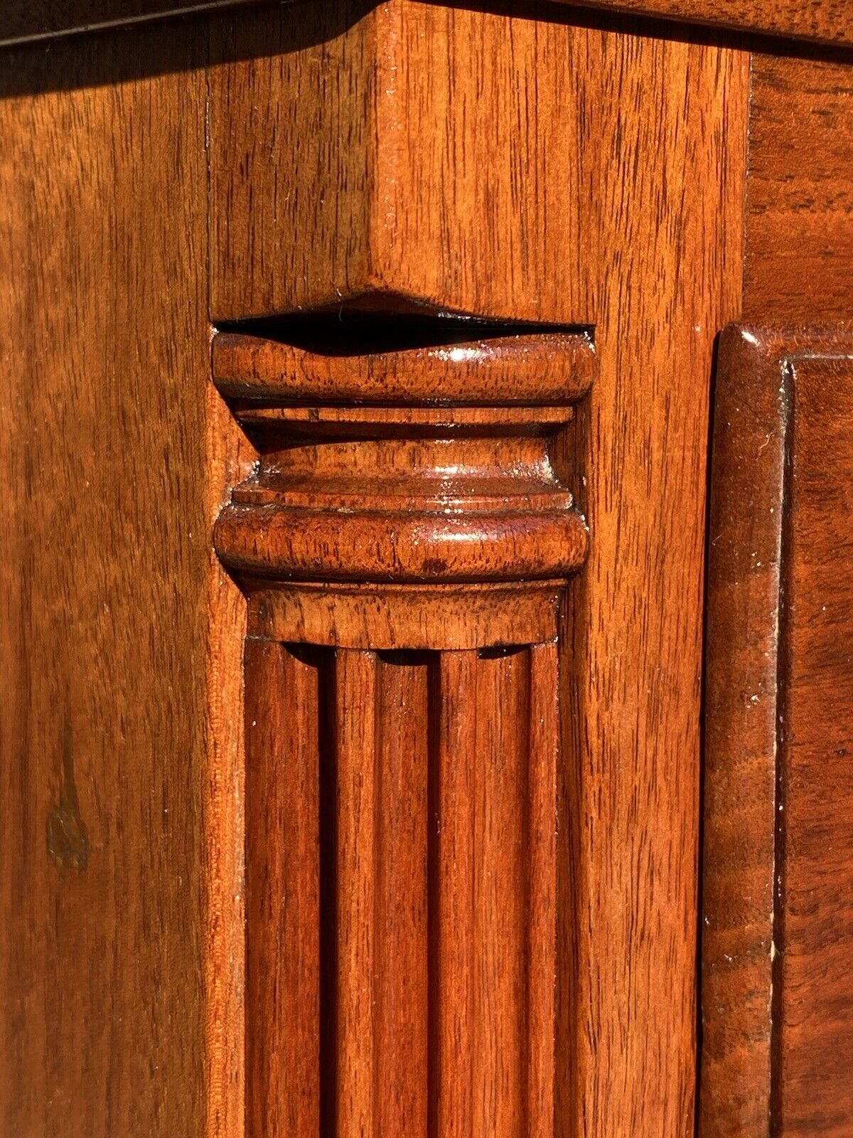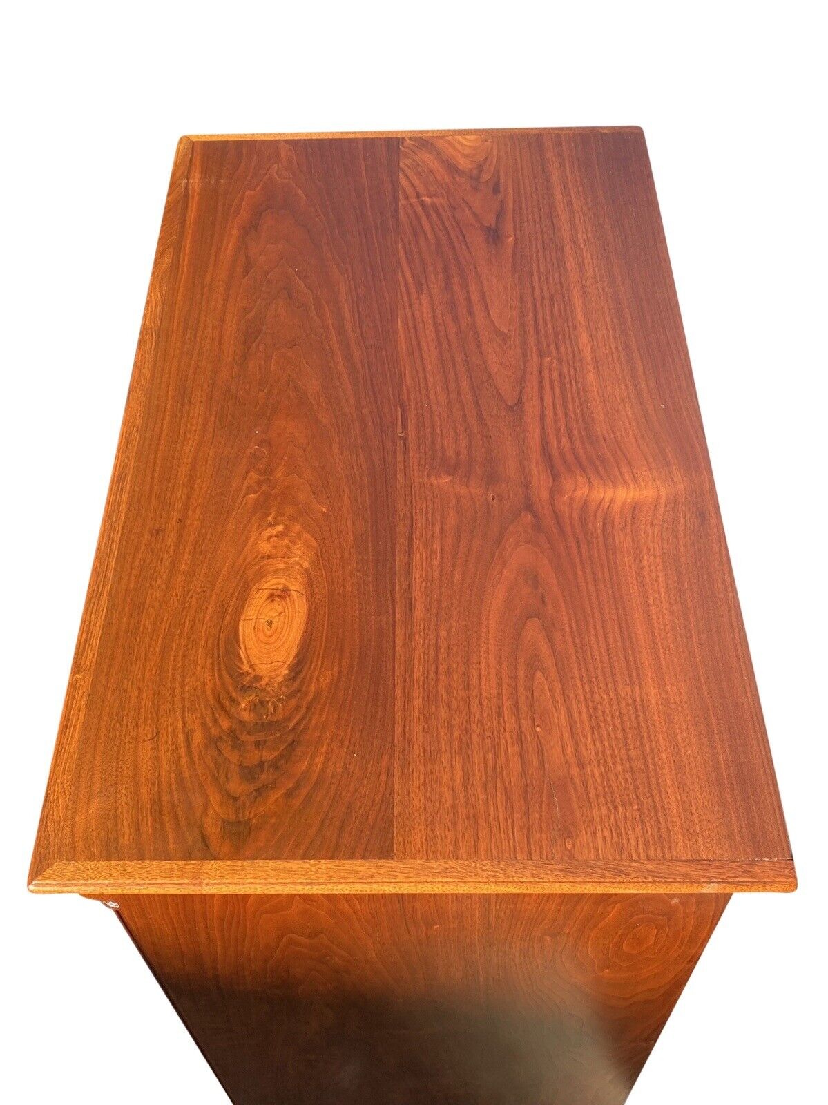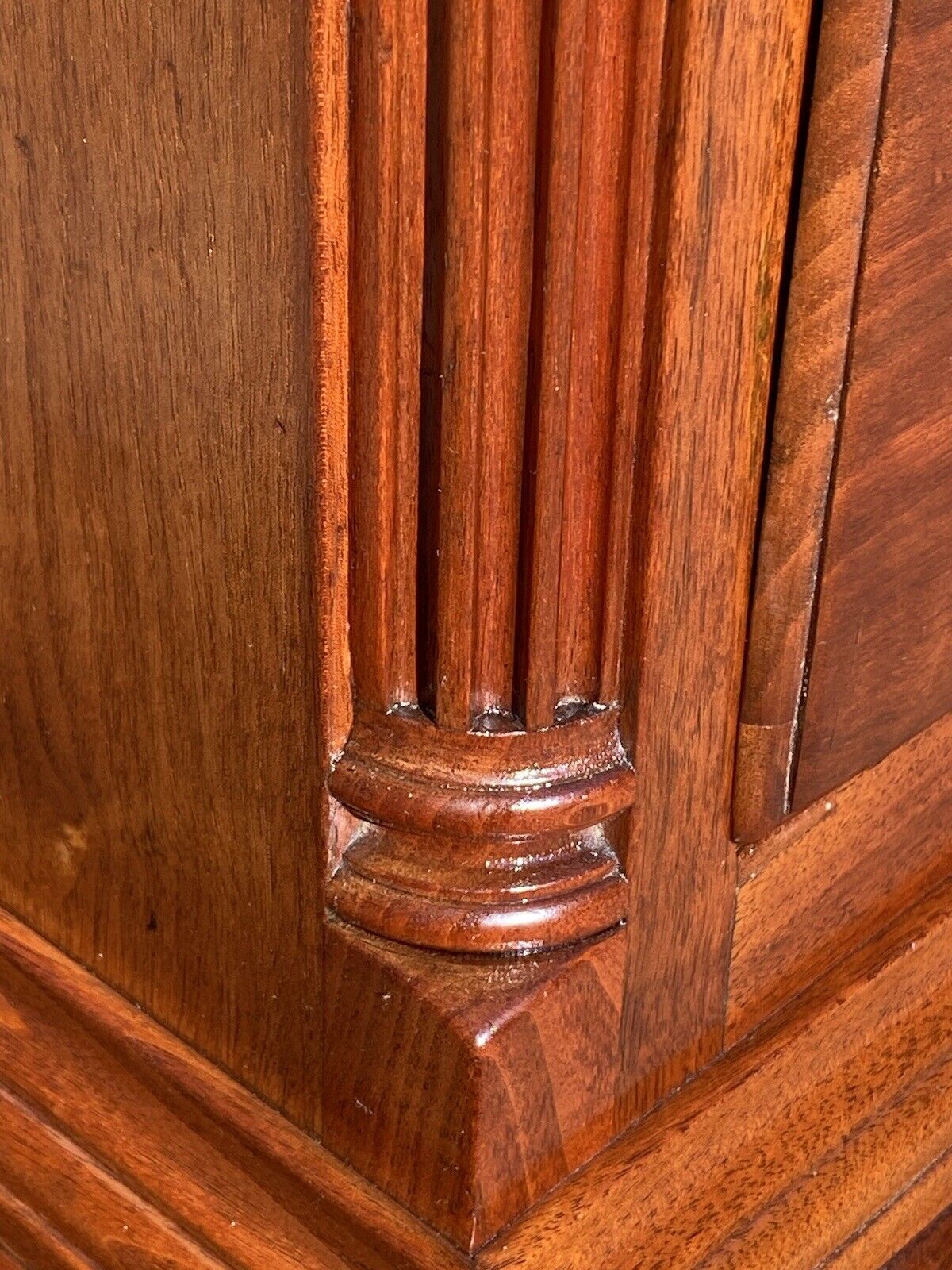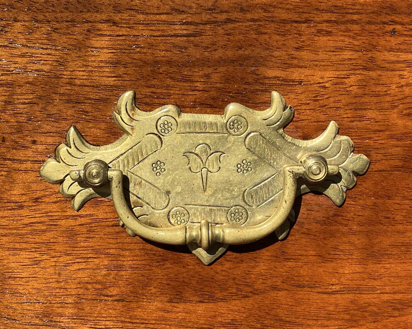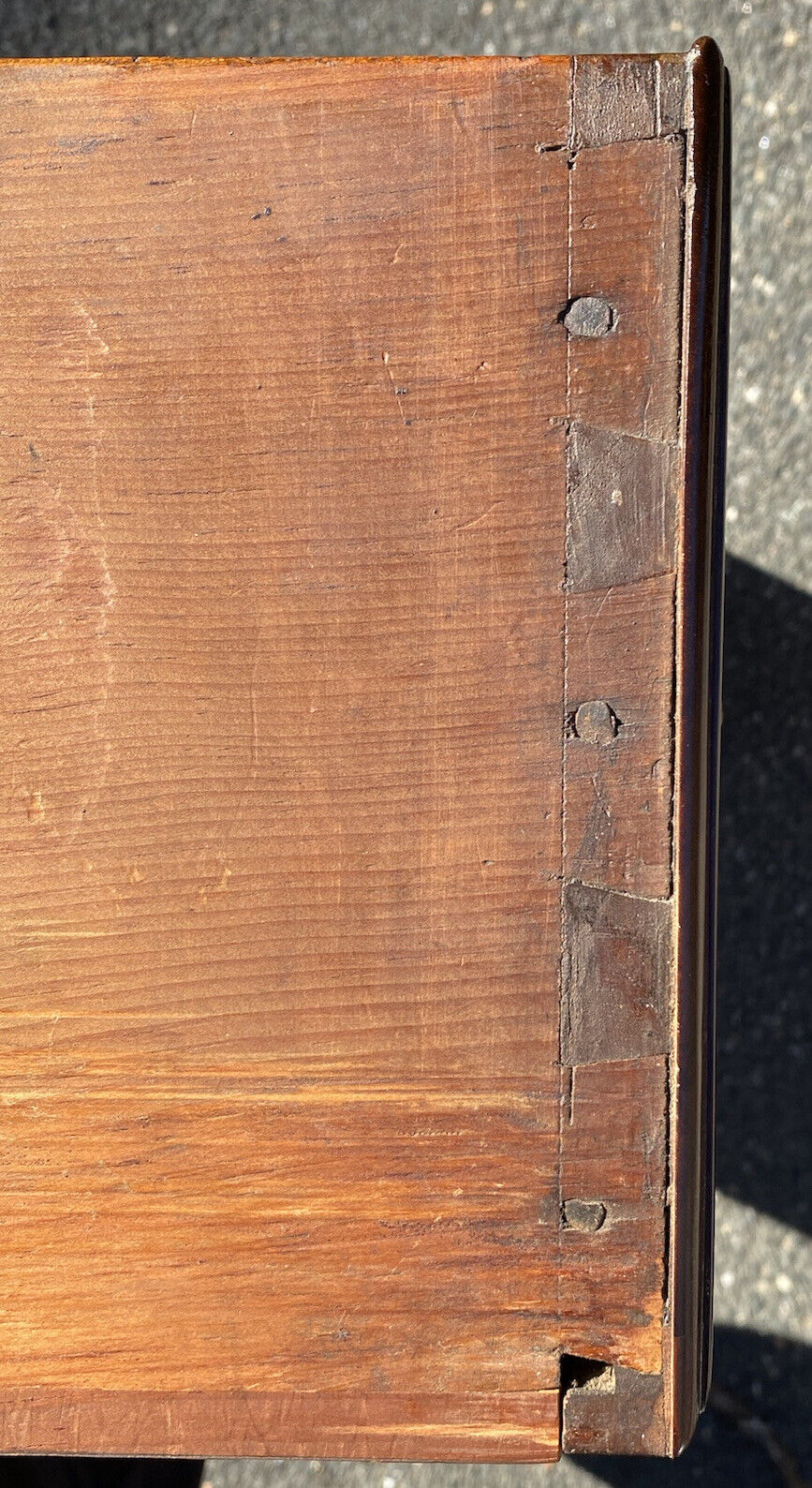 The chest was made from beautiful cuts of figured Cherry with the most select pieces with the most interesting grain reserved for the faces. The drawers have molded edges and are fitted with etched brass hardware similar to the aforementioned chest in the Philadelphia Museum. There’s a small repair to the top right corner of the 1st & 4th drawer that were very well done but we wanted to point them out anyway. The backboards & feet have been replaced but whoever did the maintenance on the chest was extremely talented and performed a museum grade restoration. The drawers are flanked by carved quarter columns and all of the drawers actuate with ease and retain their original locks. The chest was likely made in Pennsylvania, but we wouldn’t be surprised if further research shows it was made in one of the surrounding Mid-Atlantic states. The chest is in wonderful condition and measures 38 1/2” wide x 22 1/8” deep x 43 3/4” tall.