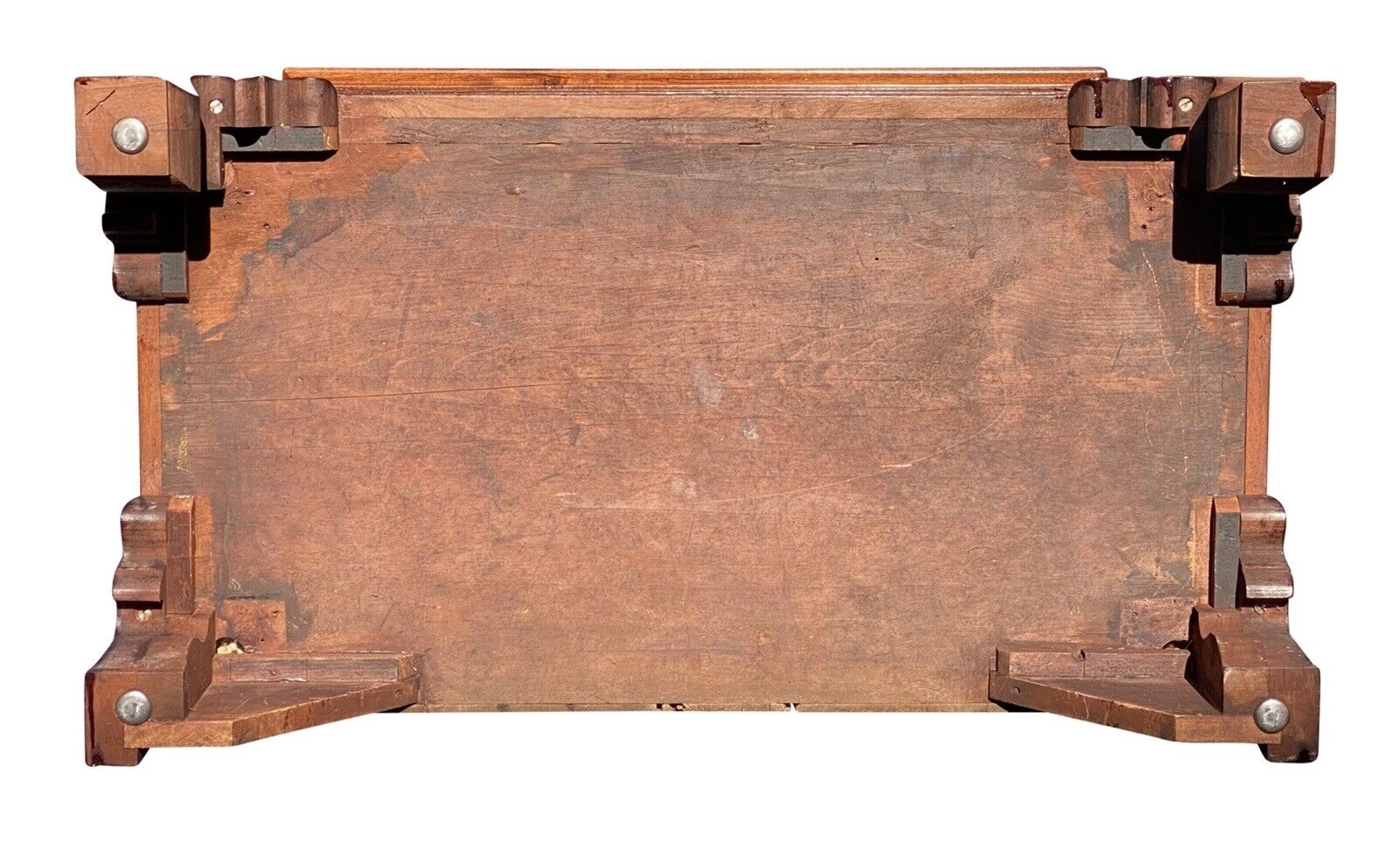 Bay Colony Antiques is extremely proud to offer for sale this phenomenal 18th century antique Chippendale Cherry four drawer bachelors chest. This is without a doubt one of the most stunning & unusual chests we’ve ever handled. We’ve scrutinized our reference material and have found similar chests but nothing quite like it. This is to our knowledge a singular object and we’re beyond excited to offer this to our clients around the world. There’s a similar triple chest in the Philadelphia Museum (item no. 1932-45-101) that could be related.