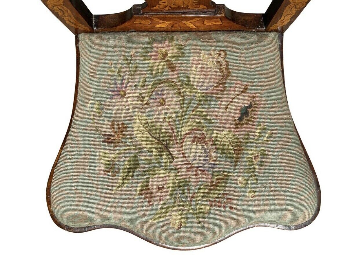 Bay Colony Antiques is proud to offer for sale this wonderful 18th century antique Dutch marquetry inlay side chair. Please take a moment to view the inlay patterns on the front and back as they’re some of the coolest designs we’ve seen in some time. The chair is littered with mythological elements including a north west wind face on the front of crest & a trio of cherubs with trumpets at the back. The chair has impressive floral & vine carvings along the stiles with an ebony ribbon along the back of the legs & inlaid tulips at the front ankles. The chair has carved knees and the entire seat box is decorated with matching inlay with floral panels on the front and back at the base of the splat. The front and back of the splat are decorated with a fantastic pattern with flowers, urns, and birds of paradise. The urns both have grotesque faces hidden in the center and the urn on the front of the splat has some kind of creature holding it up. We believe this is either an Atlas type figure or a depiction of a Melusine. Melusines depicted in North Western European / Lowland culture represent the duality of nature and also the cleansing aspect of water. The chair has a floral needlepoint seat and compliments the chair nicely with softer shades of green and pink. Marquetry furniture like this is susceptible to veneer chips and most have their fair share of fills and repairs. The chair is free of any structural repairs but has had some putty repairs, mostly around the seat box. Any veneer hits you see in the pictures will be properly repaired by our woodworker and we’ll ask him to try to better color match the existing repairs even though they're easy to glance over. There’s a small piece of veneer missing on the back crest where the cherubs are and we noticed the wood is backed with old German text. This was either done simply as a backer for the veneer or it could have been deliberately added for good fortune. We saw the word Vader peeking through so it may be a bible verse or just a coincidence. The chair measures 21” wide x 19 1/2” deep x 44 1/2” tall with a seat height of 18 1/2”.