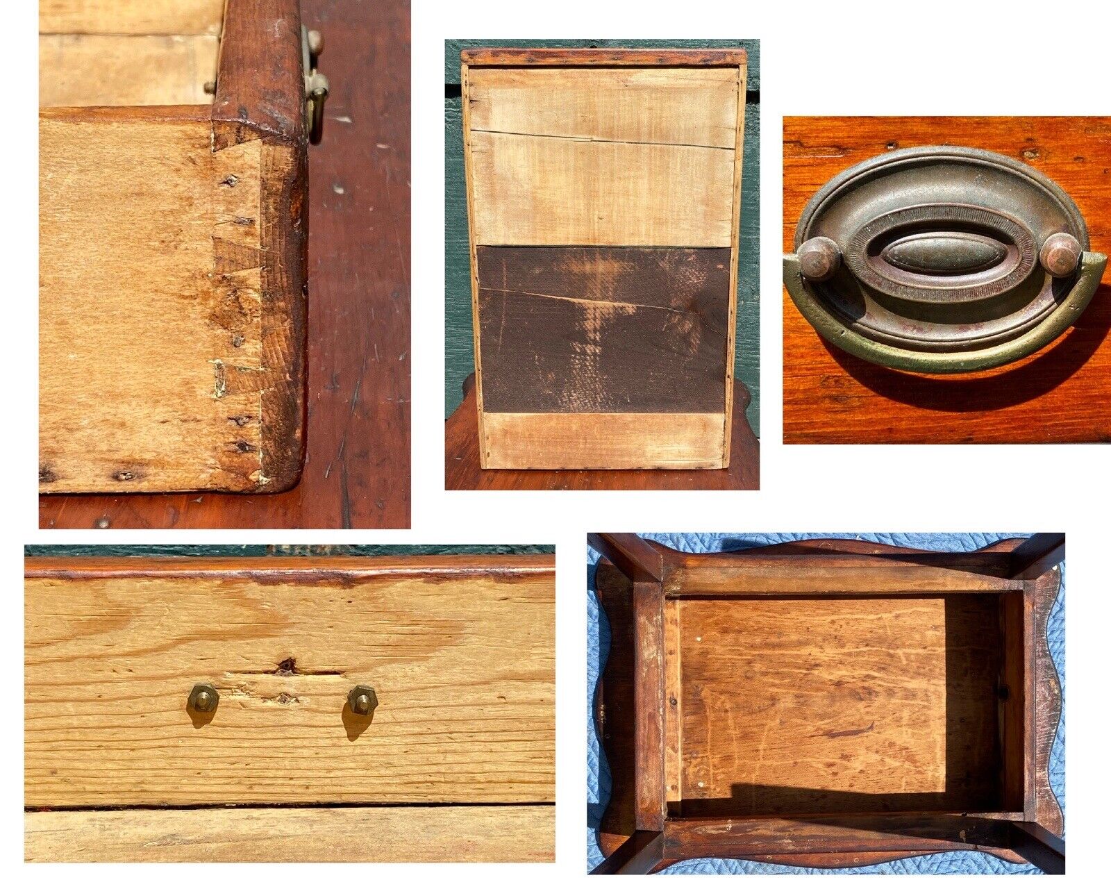 With our absolute highest compliments and utmost honors, Bay Colony Antiques is proud to offer for sale this extremely desirable 18th century antique New England Hepplewhite table. While it may not be as flashy as a Mahogany masterpiece from Boston or Philadelphia this table is an important piece of Early American furniture and was probably made out in our area around Deerfield, Hadley, or Wethersfield. American scalloped top tables like this were first made in Wethersfield and the design later spread North through the CT River Valley and into Eastern CT. We suspect the table was originally painted but there’s no evidence to support our claim. The table is made from old growth, New England Pine that has developed a nice patina over the years. Historic Deerfield, The Five colleges, and local house museums hold the best collections from the area. For our clients who haven’t visited Historic Deerfield, we would highly recommend a visit if you’re a fan of our site. The table is in wonderful condition with our only notes being minor surface wear, the brass pull is a later addition, & the drawer panel has a replaced board. The Five college collection has a similar table dated CA 1770 and that’s exactly where we have this dated as well. The table measures 22 1/2” wide x 32” deep x 26 1/4” tall.