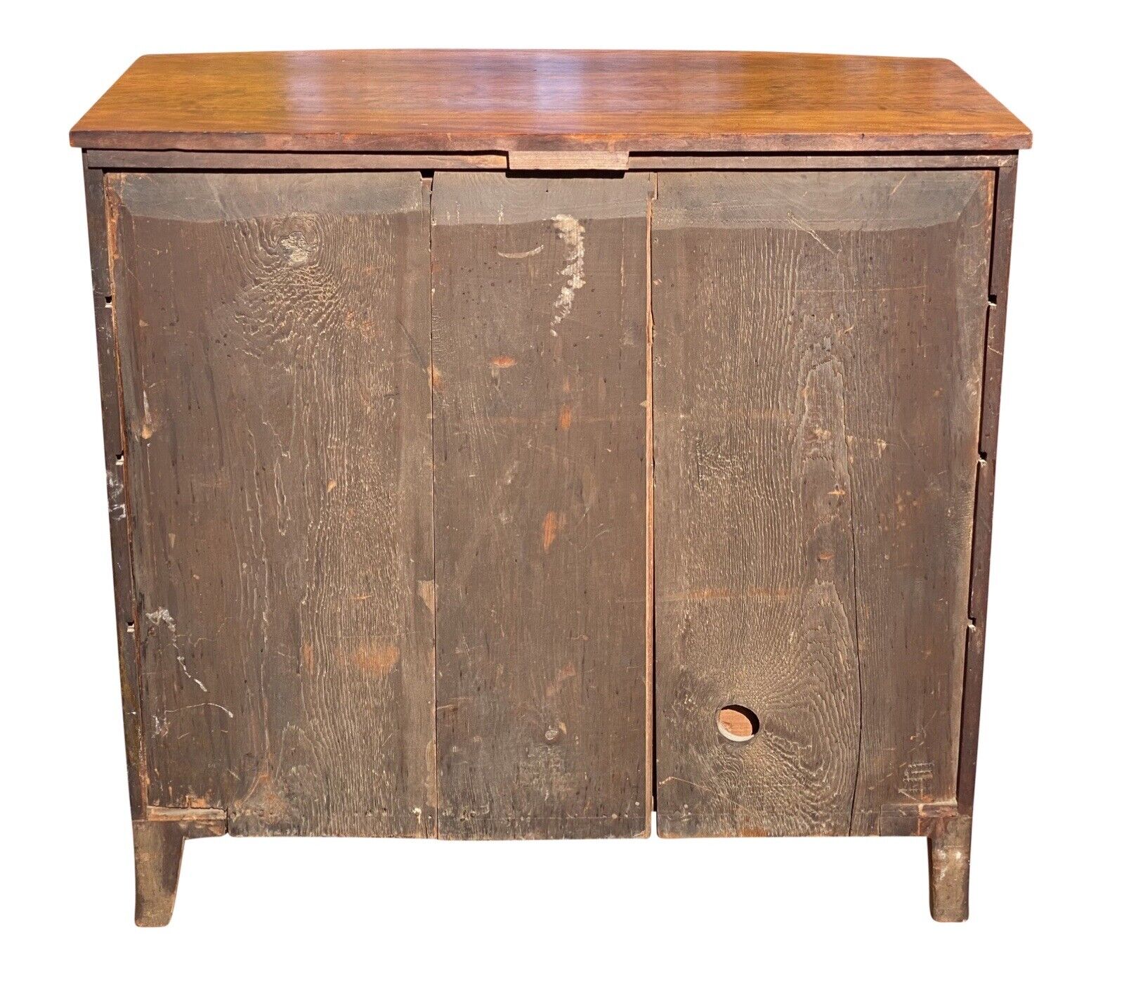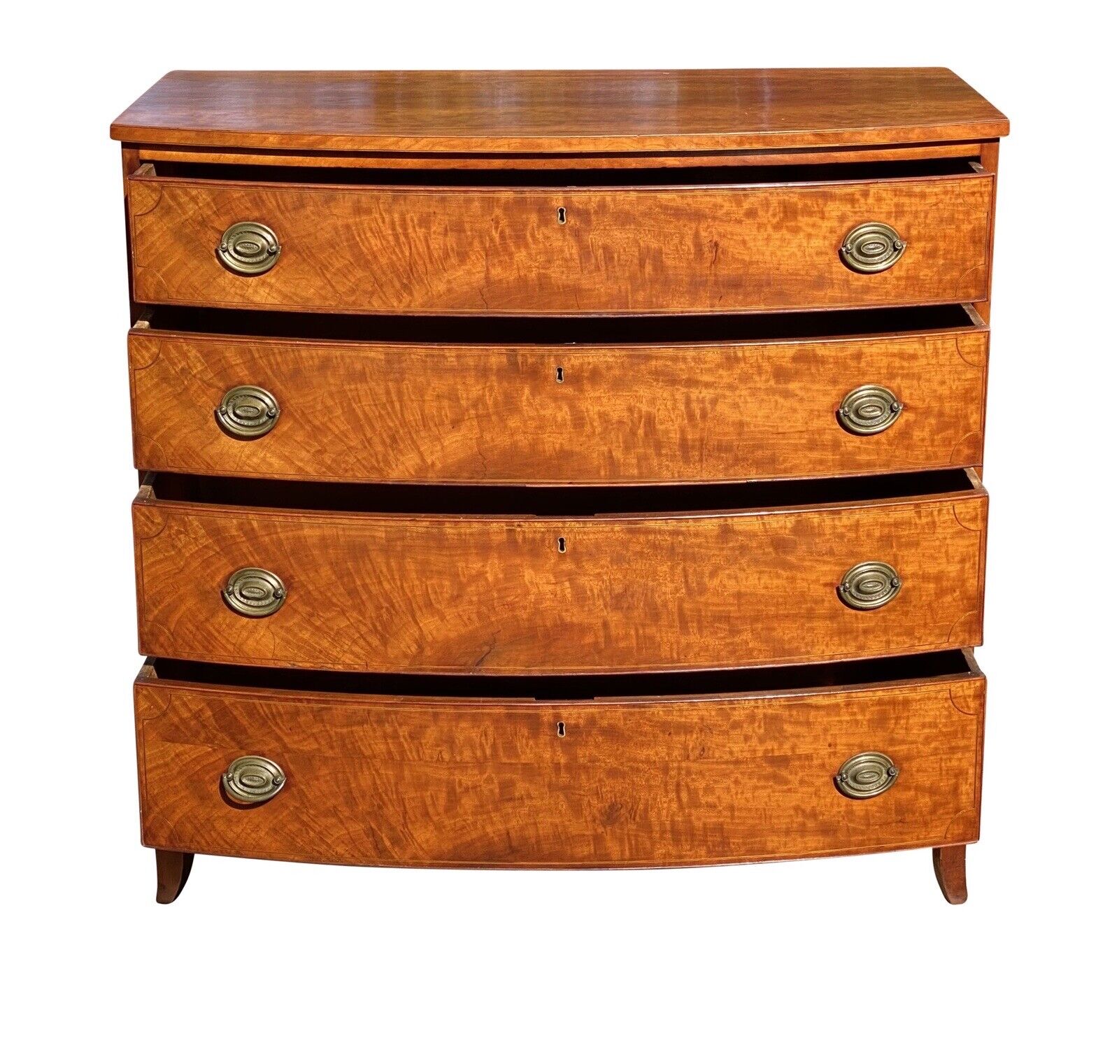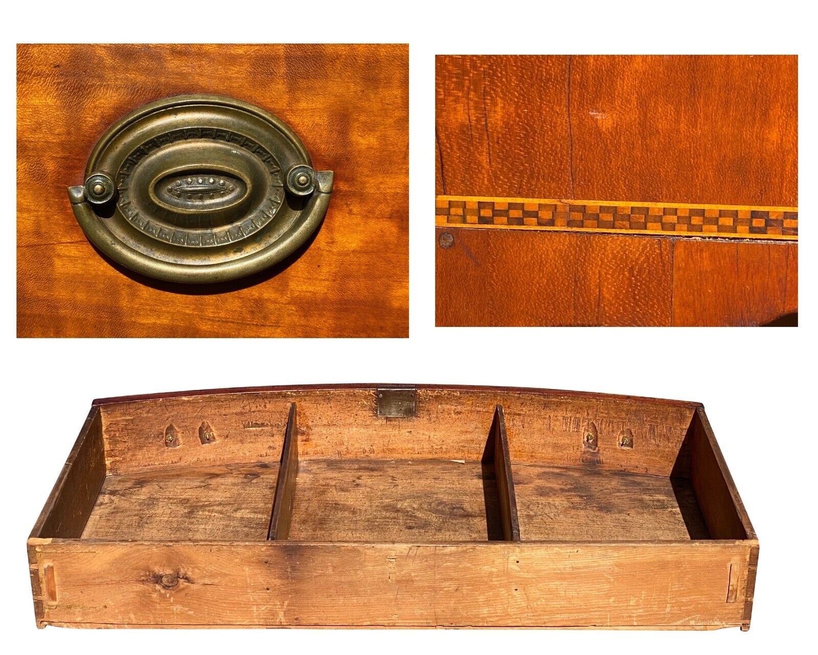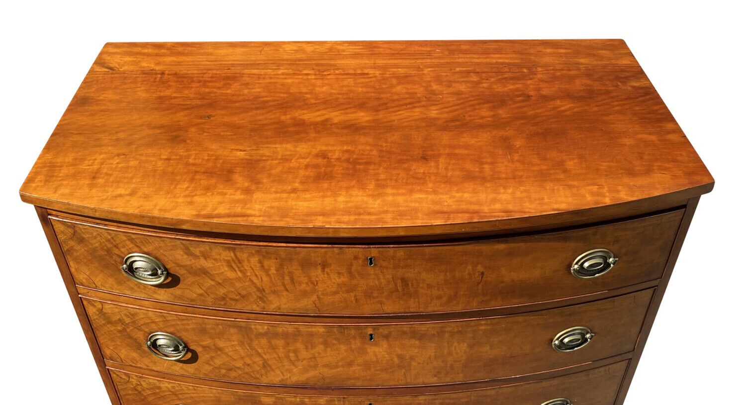 With our highest compliments and utmost honors, Bay Colony Antiques is extremely proud to offer for sale this fantastic late 18th / early 19th century antique Mahogany bow front dresser. We’ve been bothered by not having as many bow fronts in our inventory because they’ve always been a fundamental part of our business. We’ve encountered a fair amount, but not many that we felt were worthy of offering to our clients. Our patience has paid off and we’re very excited to offer this to our clients around the globe. The chest has a spectacular presence and the Mahogany used for the faces represents the absolute highest grade of the imported wood. The drawers have a variegated wood line inlay around the edges with cut out corners and embossed brass pulls. The chest has elongated French feet with a scalloped apron further decorated with a complex geometric inlay. The drawers are constructed with blind dovetails and have New England White Pine secondaries. The uppermost drawer is compartmentalized, and the brasses appear to be original as the faces have not been re drilled. The chest is in very good condition with our only notes being minor surface wear & a couple of well-done veneer repairs. The chest measures 41 1/2” wide x 24” deep x 39 1/8” tall. This is without a doubt one of the finest and most noteworthy bow fronts we’ve encounter in quite some time and would recommend this without hesitation to even our most discriminatory collectors.