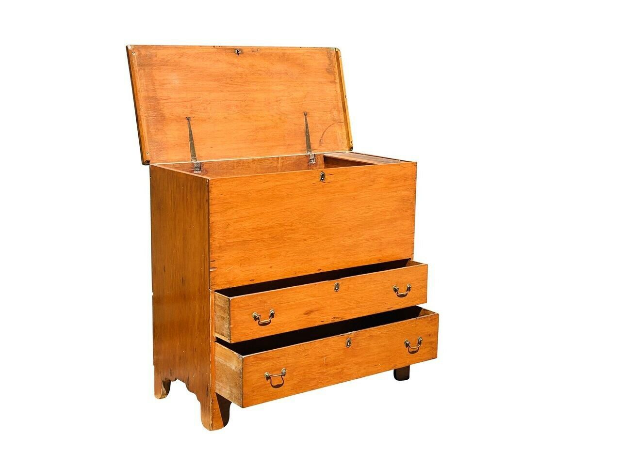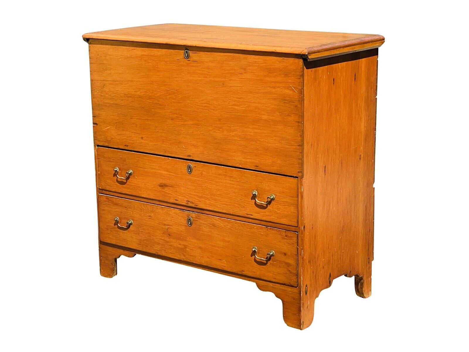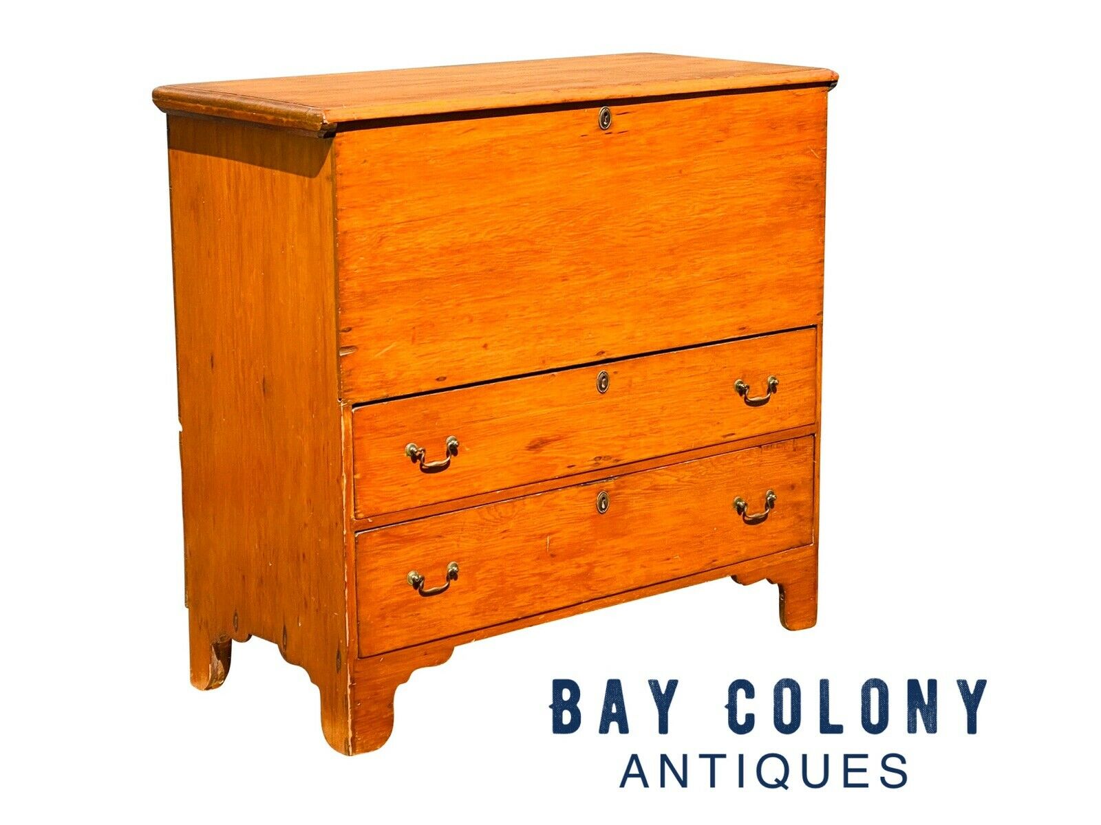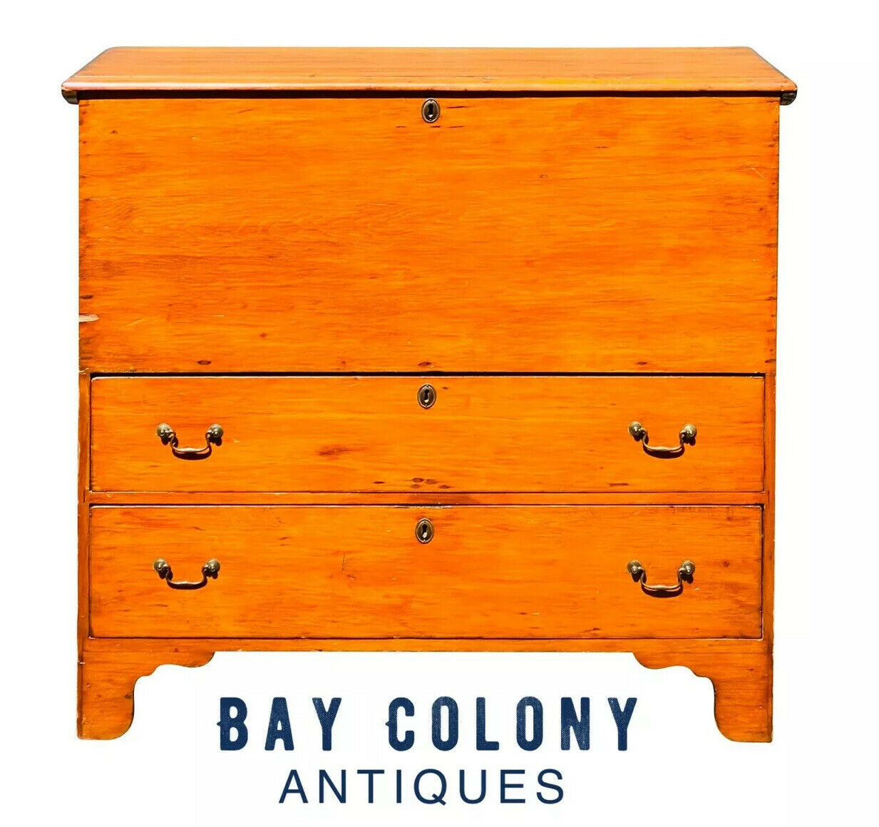 It's our utmost pleasure to offer for sale this wonderful 18th century antique New England pumpkin pine blanket box. From an upstate Vermont estate this box is in fantastic condition. The box is crafted from old growth New England Pine and retains it's original strap hinges & brass hardware. The upper section of the box retains it's original lock and hasp and has a lift top candle till inside the box. The two lower drawers feature all hand cut dovetail construction with hand chamfered bottoms & decorative brass escutcheon plates. One lock is missing from the chest on the upper drawer. The box stands tall on bracket feet with nice cut out sides. When old iron nails have been in place this long black oxidation marks can be seen around the nail heads. The chest exhibits wonderful proportions measuring 42 1/4" wide x 19 1/4" deep x 40" tall.