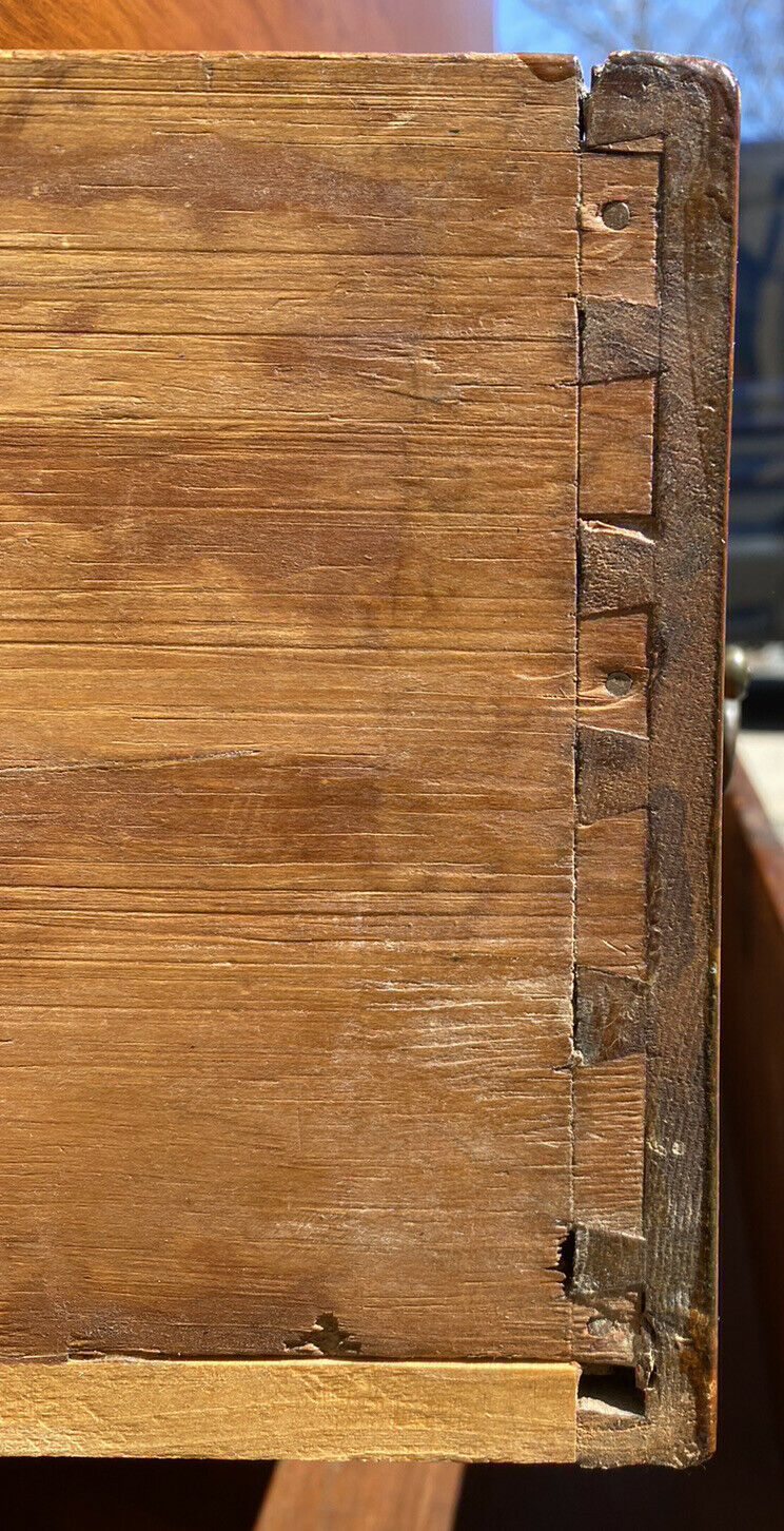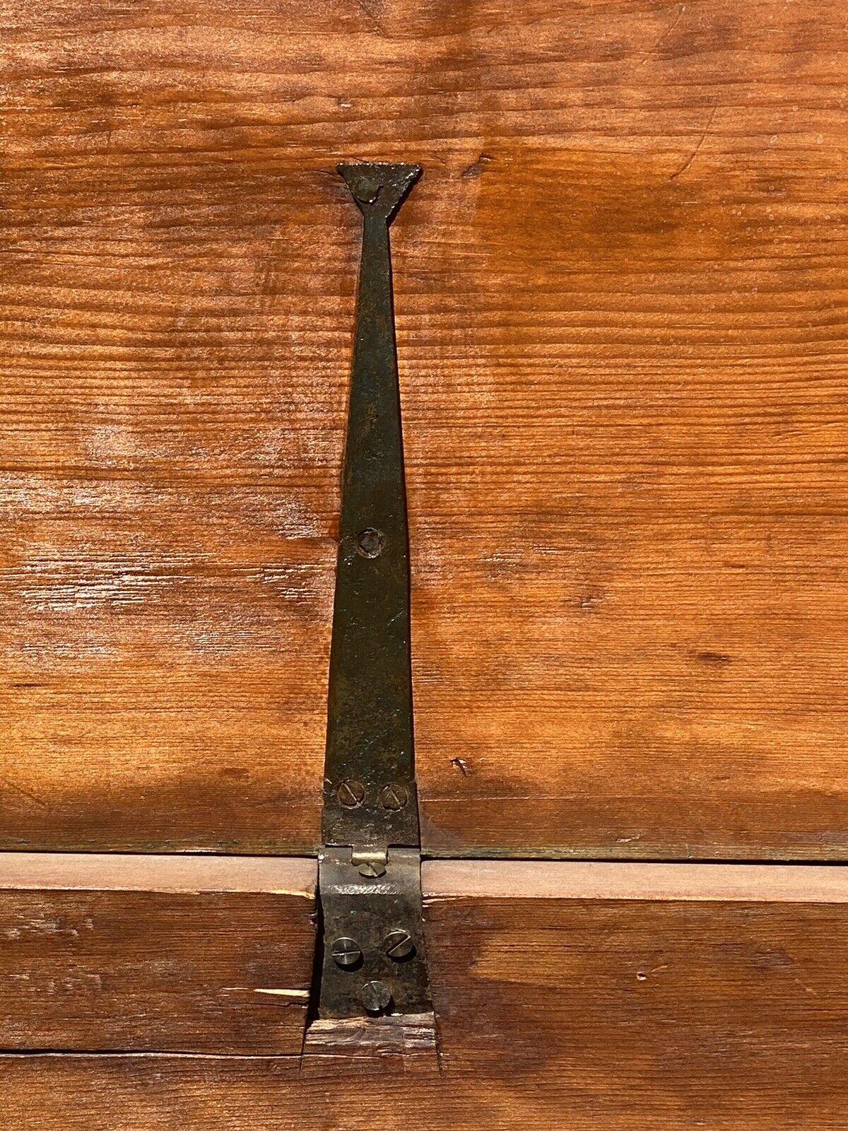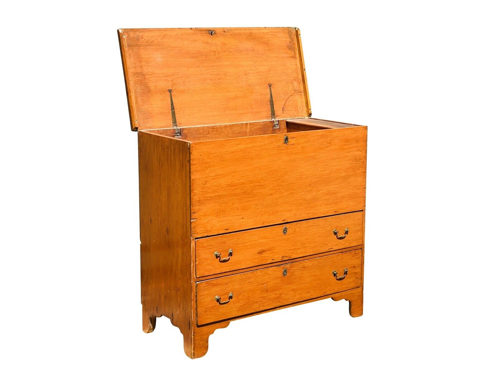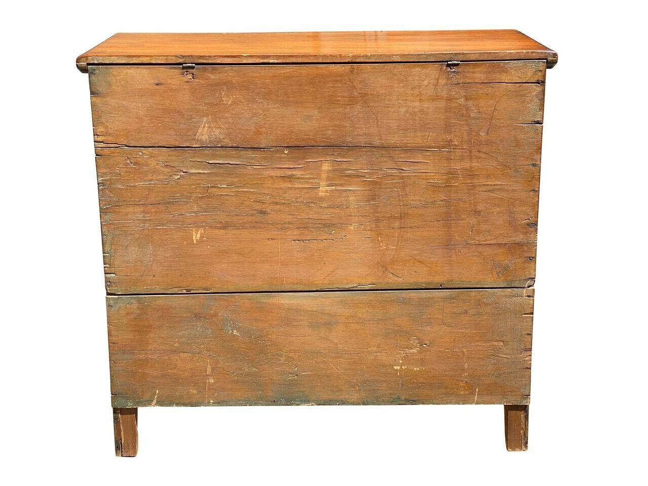 It's our utmost pleasure to offer for sale this wonderful 18th century antique New England pumpkin pine blanket box. From an upstate Vermont estate this box is in fantastic condition. The box is crafted from old growth New England Pine and retains it's original strap hinges & brass hardware. The upper section of the box retains it's original lock and hasp and has a lift top candle till inside the box. The two lower drawers feature all hand cut dovetail construction with hand chamfered bottoms & decorative brass escutcheon plates. One lock is missing from the chest on the upper drawer. The box stands tall on bracket feet with nice cut out sides. When old iron nails have been in place this long black oxidation marks can be seen around the nail heads. The chest exhibits wonderful proportions measuring 42 1/4" wide x 19 1/4" deep x 40" tall.