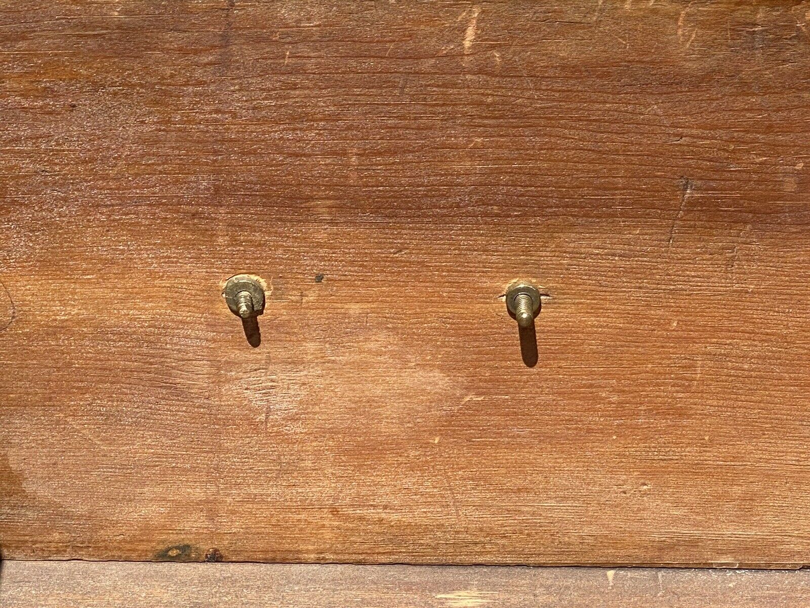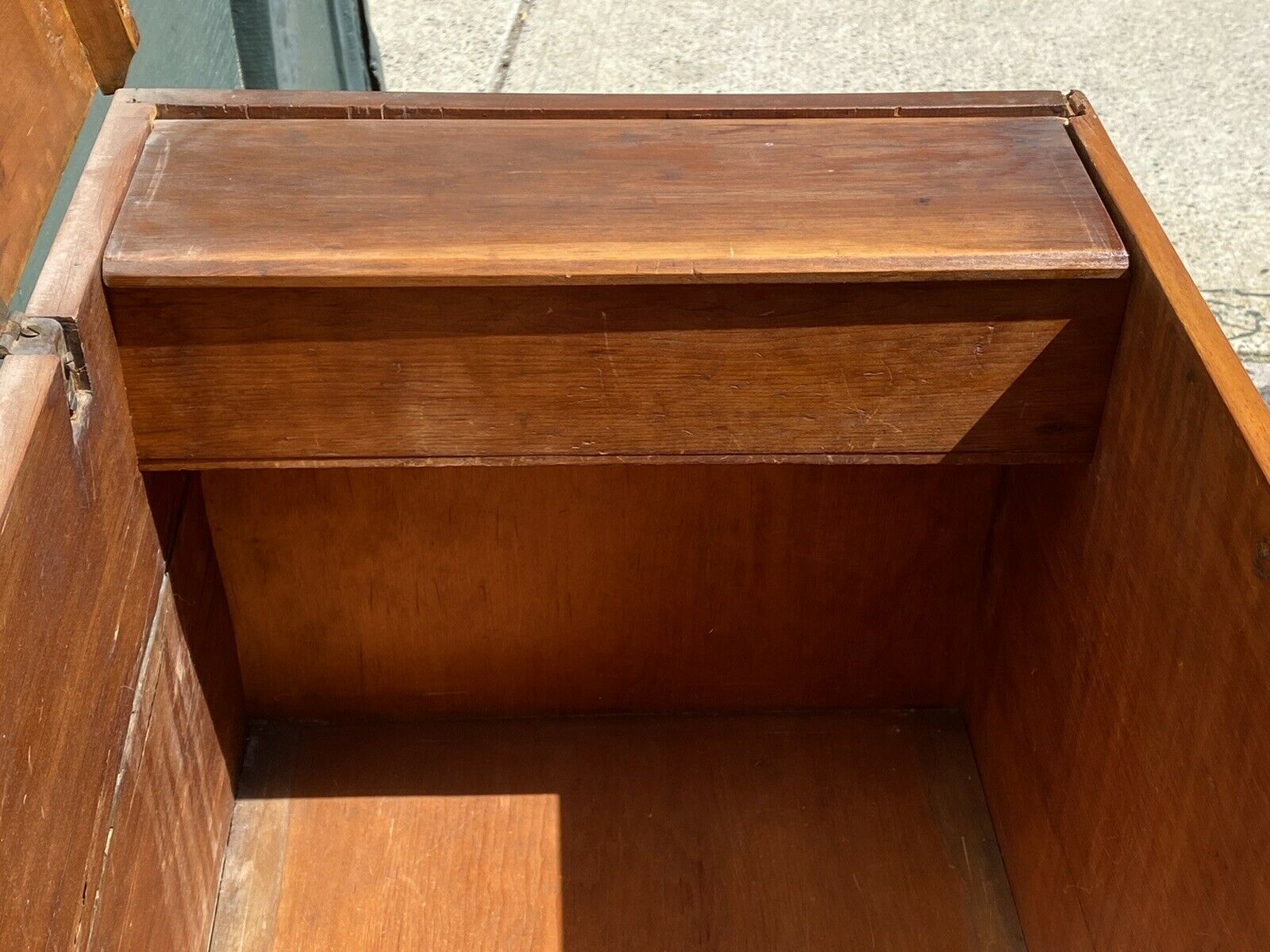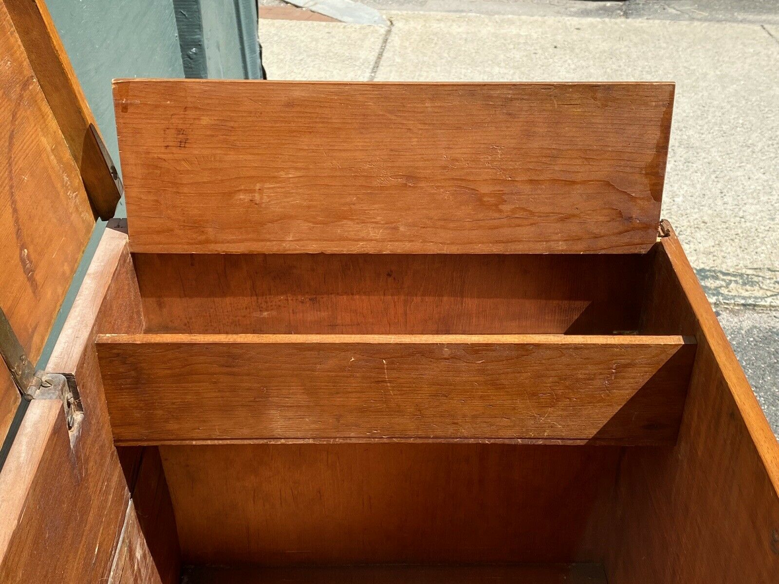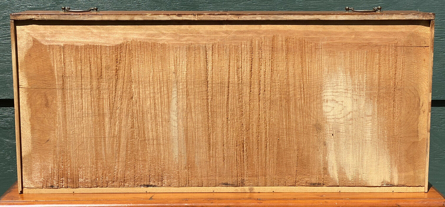 It's our utmost pleasure to offer for sale this wonderful 18th century antique New England pumpkin pine blanket box. From an upstate Vermont estate this box is in fantastic condition. The box is crafted from old growth New England Pine and retains it's original strap hinges & brass hardware. The upper section of the box retains it's original lock and hasp and has a lift top candle till inside the box. The two lower drawers feature all hand cut dovetail construction with hand chamfered bottoms & decorative brass escutcheon plates. One lock is missing from the chest on the upper drawer. The box stands tall on bracket feet with nice cut out sides. When old iron nails have been in place this long black oxidation marks can be seen around the nail heads. The chest exhibits wonderful proportions measuring 42 1/4" wide x 19 1/4" deep x 40" tall.