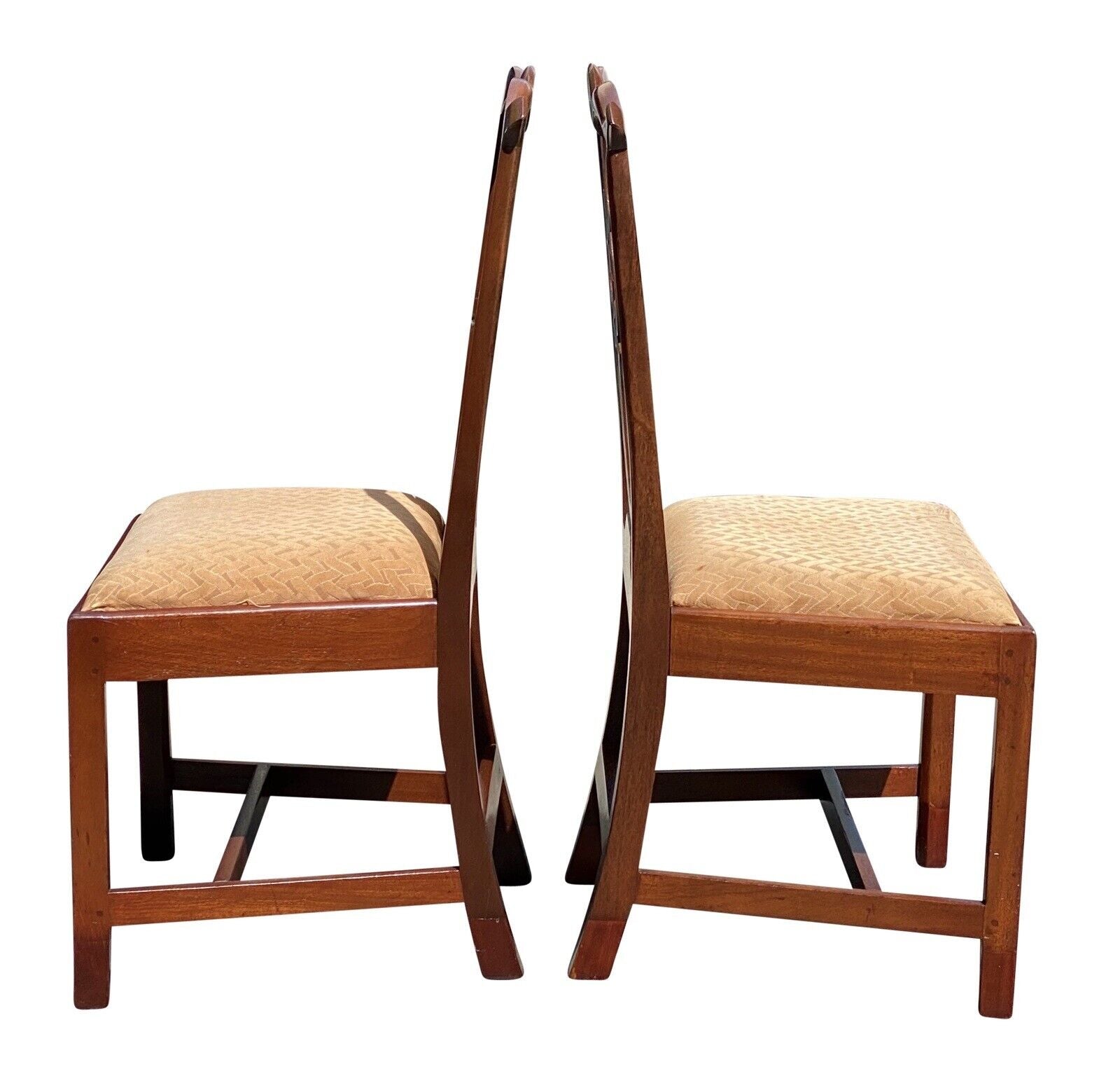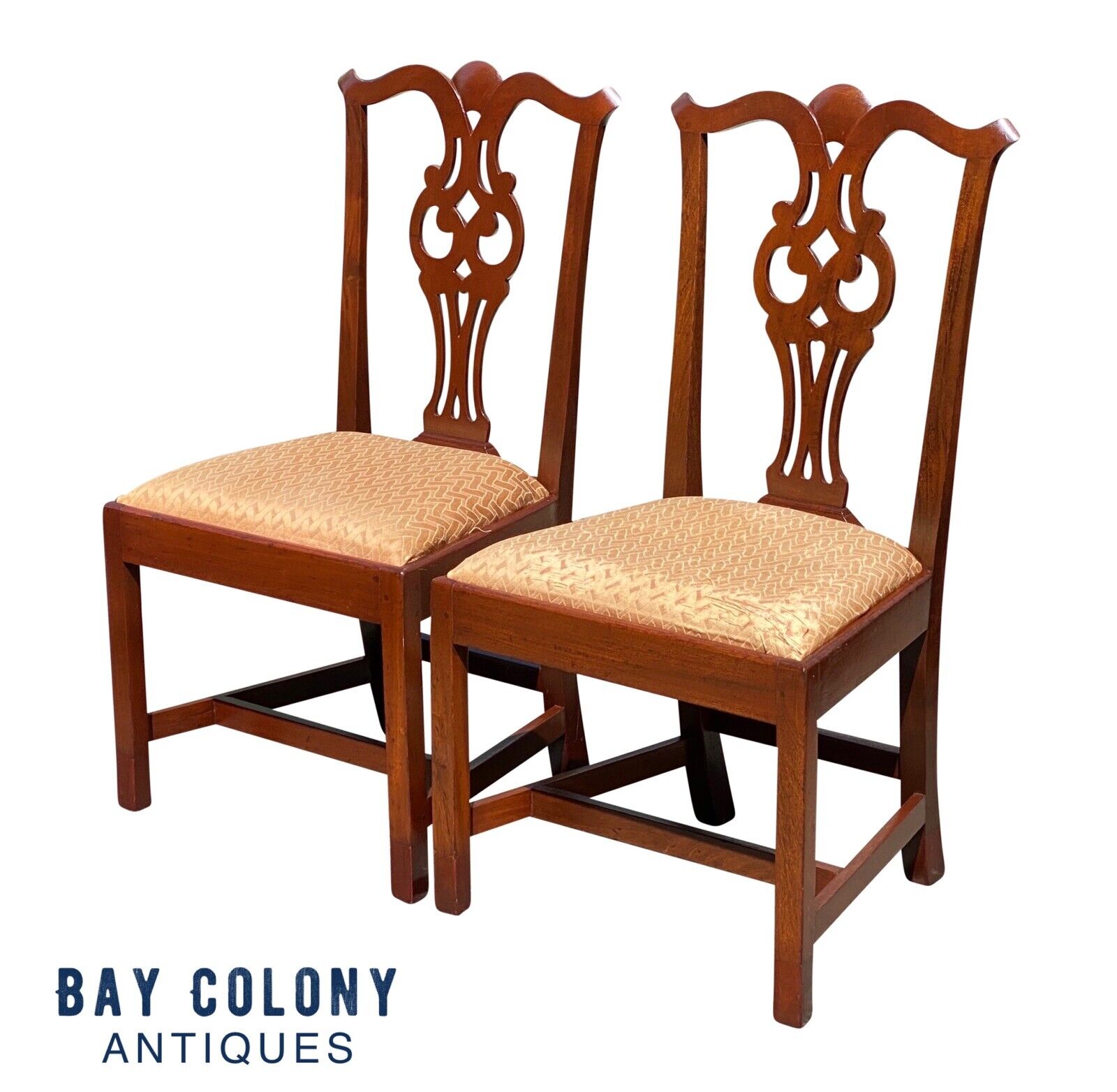 Bay Colony Antiques is proud to offer for sale this fantastic pair of 18th century antique Mahogany Salem MA dining chairs. We’ve attached a picture from Sack’s Fine Points of Furniture showing a nearly identical splat pattern from a Salem MA cabinet making shop. Salem was one of America’s most prolific cabinet making cities and was home to over 100 cabinet shops by the turn of the 19th century. The chairs have a desirable heart and diamond pattern on the splats. The chairs have a Cupid’s bow crest rail with a lobed center. The seats have an interlaced design and are in relatively good condition with some loose fabric on the right chair. The chairs have slip seats that can be easily removed and should only cost about $20 a seat after you purchase the fabric. The frames are in great condition with our only notes being minimal surface wear & an old restoration to one of the crests. The chairs measure 20 3/4” wide x 18 3/4” deep x 38 1/2” tall with an 18” seat height.