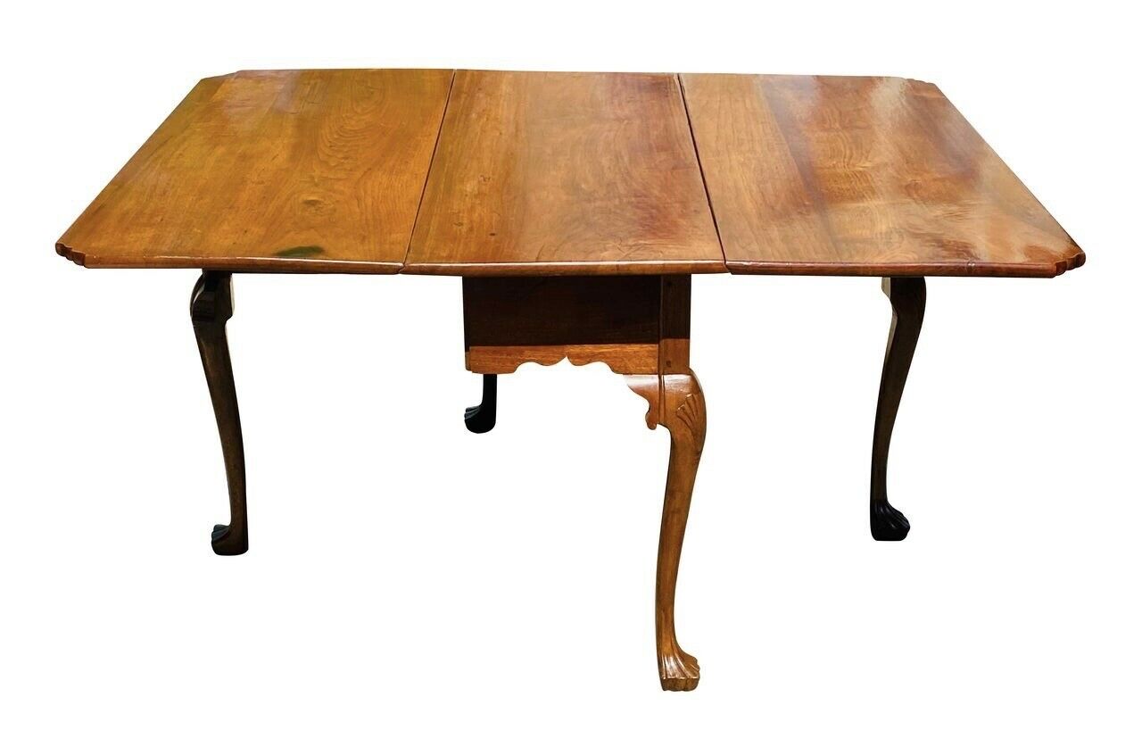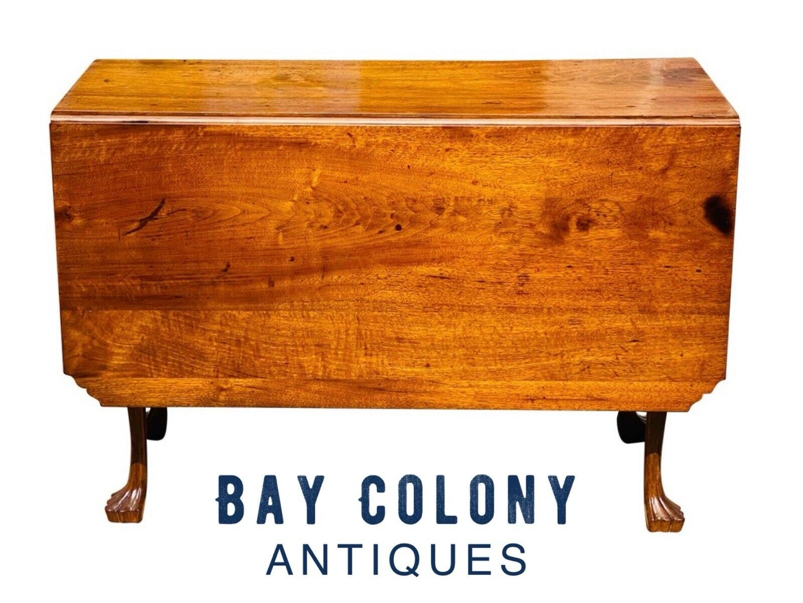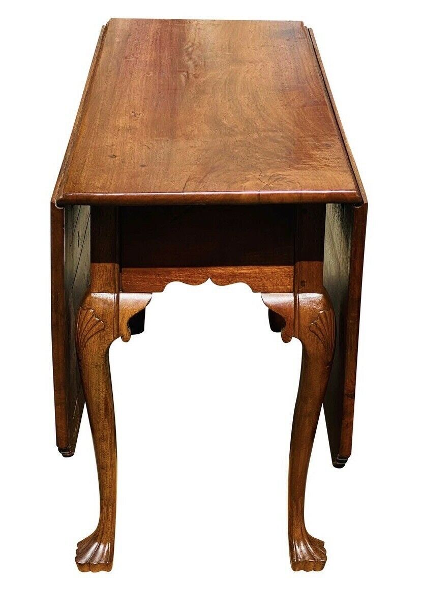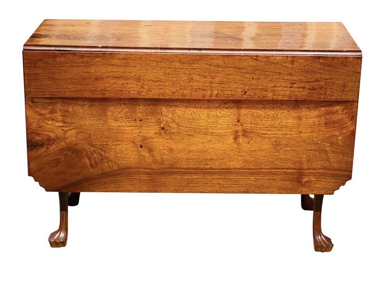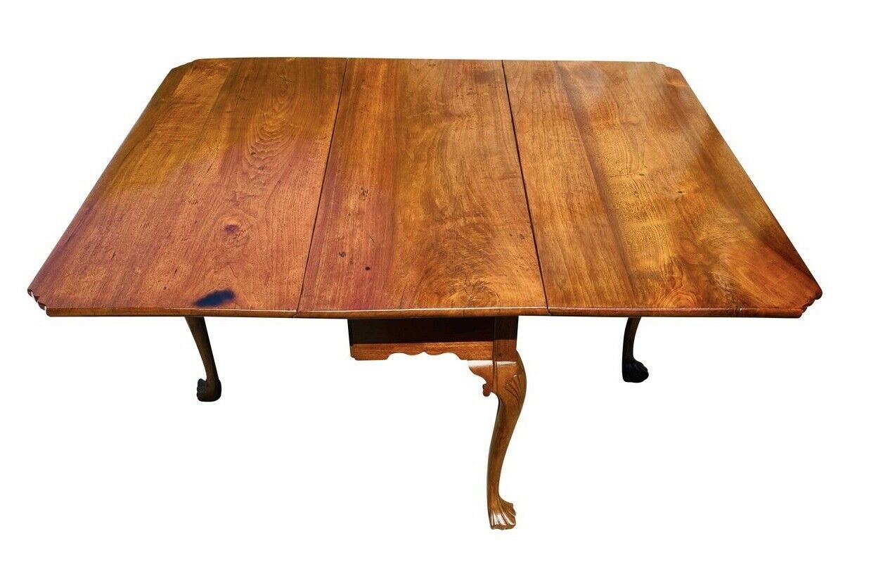Bay Colony Antiques is proud to offer for sale this magnificent 18th century antique Pennsylvania Walnut Chippendale drop leaf dining table. Philadelphia Furniture and Philadelphia Chippendale in particular is one of the most iconic & desirable disciplines of American cabinet making. Philadelphia was home to some of the most celebrated American cabinet makers such as John Elliot, Benjamin Randolph, Thomas Affleck & William Savery. The table exhibits nice proportions & has a really nice scrolled out table box, cabriolet legs with shell carved knees, & superbly executed triffid carved feet. Trifid carved feet are a rare decoration popular in top tier Philadelphia cabinet shops. These Trifid feet are well balanced and have a lot of character with a shallow double curve between the toes & an elongated webbing running up to the ankle. The table has a dovetailed table box with a cupids bow cut out and the leaves are supported with a swinging gate leg on each end. The table has finely formed cabriolet legs with shell carvings at the knee and the table is nice and sturdy and has been well maintained over the years. The table is crafted from high grade American Walnut which was abundant in the region and easy to work with which made it a quick favorite among early cabinet makers. The table leaves can be opened and closed easily and have pinched corners that further enhance it's elegance & charm. The table is in great condition with our only notes being replaced hinges, minor surface wear & discolorations, and an old age split that was properly stabilized with a biscuit. The table measures 18" wide x 42" long x 28" tall. When the leaves are locked up the top measures 53 1/2" wide x 42" long.
