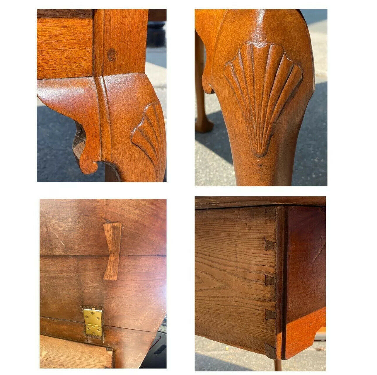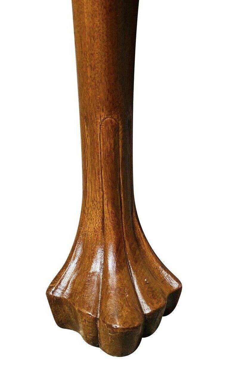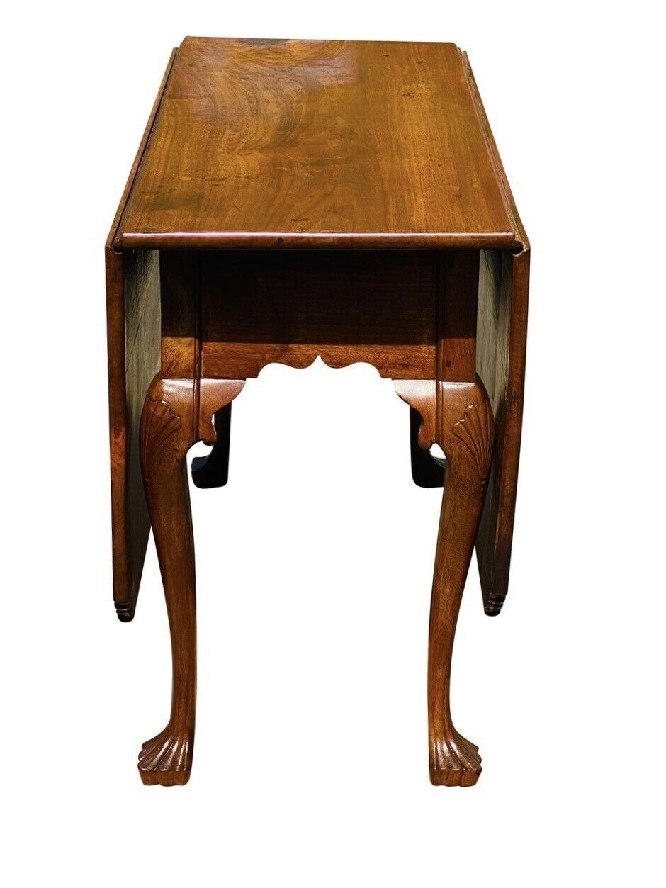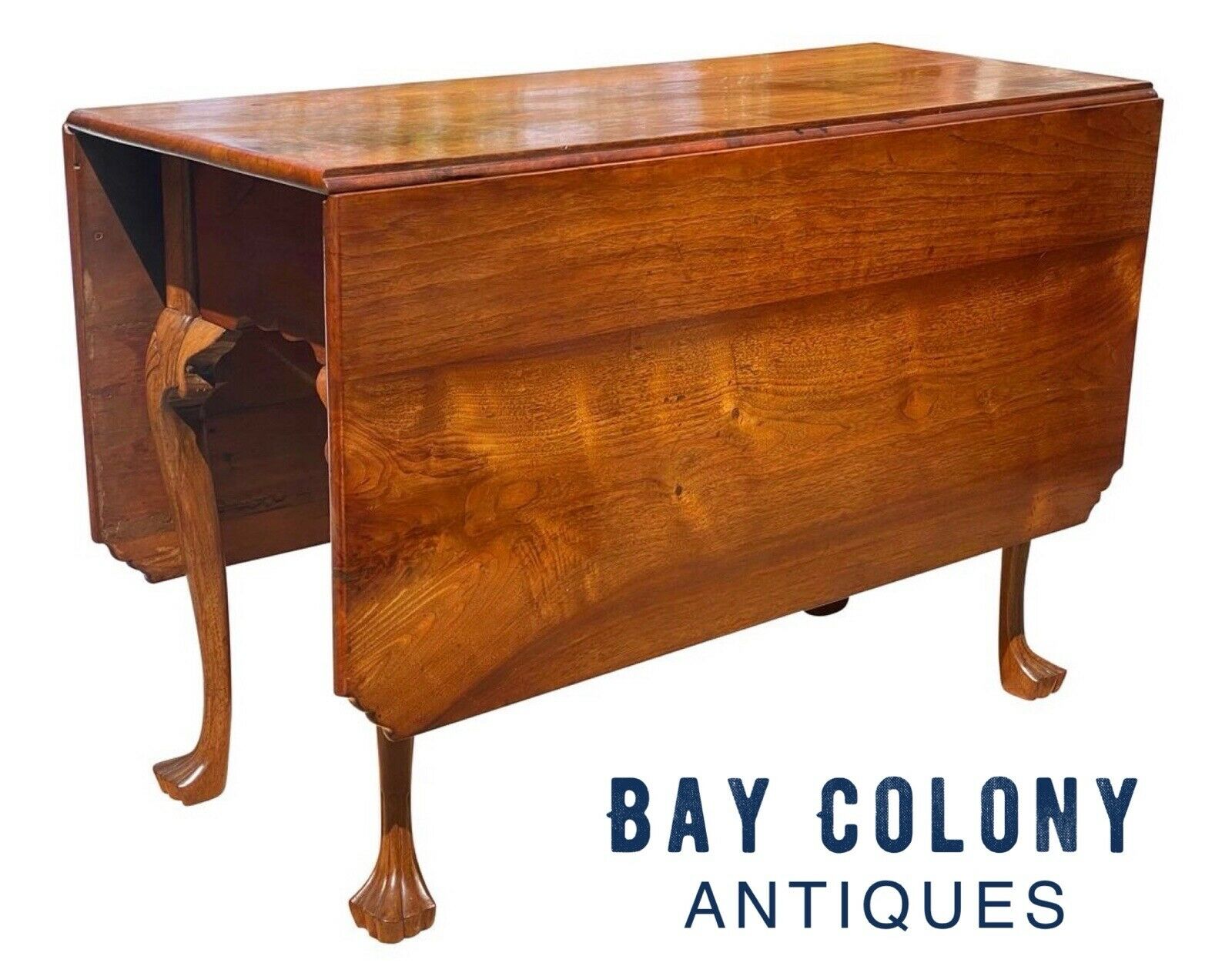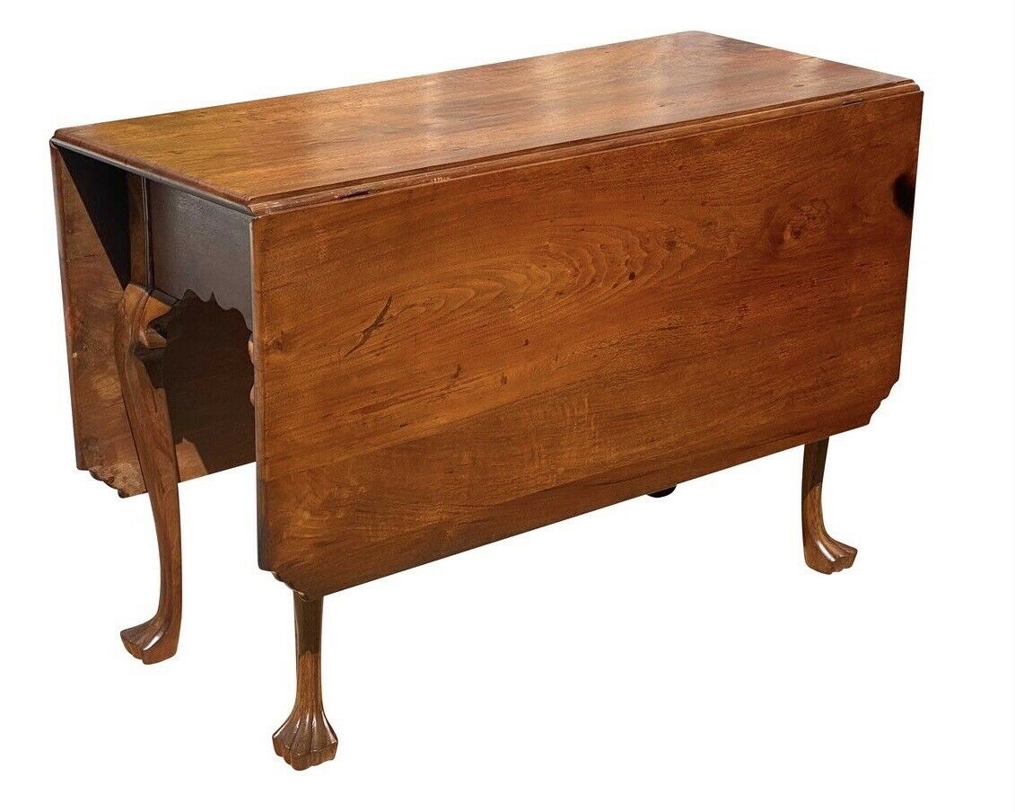Bay Colony Antiques is proud to offer for sale this magnificent 18th century antique Pennsylvania Walnut Chippendale drop leaf dining table. Philadelphia Furniture and Philadelphia Chippendale in particular is one of the most iconic & desirable disciplines of American cabinet making. Philadelphia was home to some of the most celebrated American cabinet makers such as John Elliot, Benjamin Randolph, Thomas Affleck & William Savery. The table exhibits nice proportions & has a really nice scrolled out table box, cabriolet legs with shell carved knees, & superbly executed triffid carved feet. Trifid carved feet are a rare decoration popular in top tier Philadelphia cabinet shops. These Trifid feet are well balanced and have a lot of character with a shallow double curve between the toes & an elongated webbing running up to the ankle. The table has a dovetailed table box with a cupids bow cut out and the leaves are supported with a swinging gate leg on each end. The table has finely formed cabriolet legs with shell carvings at the knee and the table is nice and sturdy and has been well maintained over the years. The table is crafted from high grade American Walnut which was abundant in the region and easy to work with which made it a quick favorite among early cabinet makers. The table leaves can be opened and closed easily and have pinched corners that further enhance it's elegance & charm. The table is in great condition with our only notes being replaced hinges, minor surface wear & discolorations, and an old age split that was properly stabilized with a biscuit. The table measures 18" wide x 42" long x 28" tall. When the leaves are locked up the top measures 53 1/2" wide x 42" long.