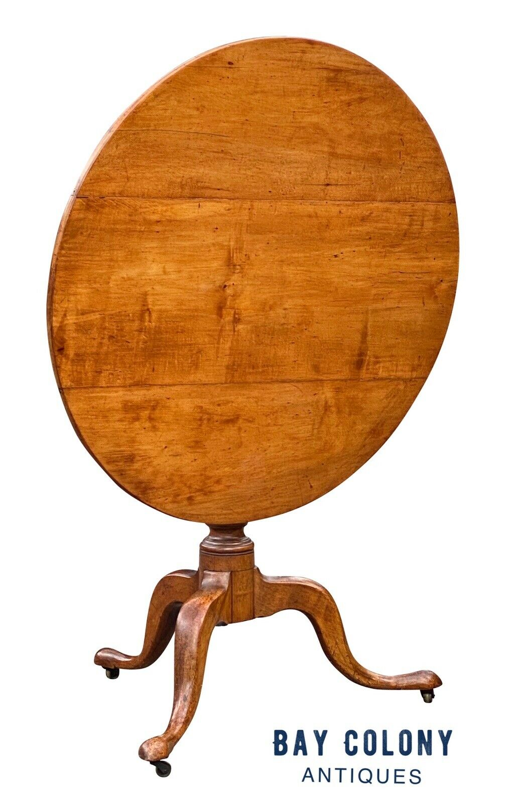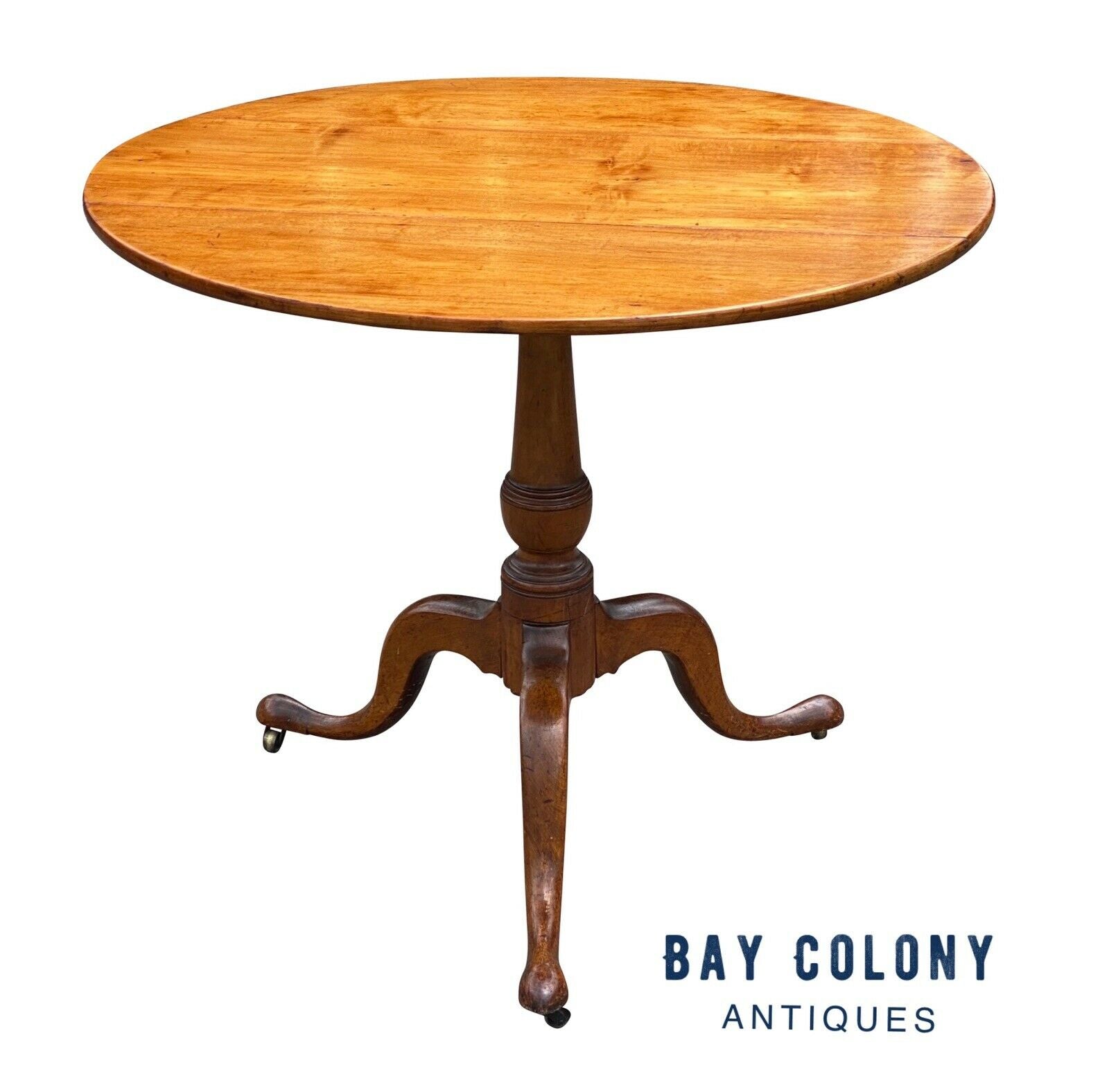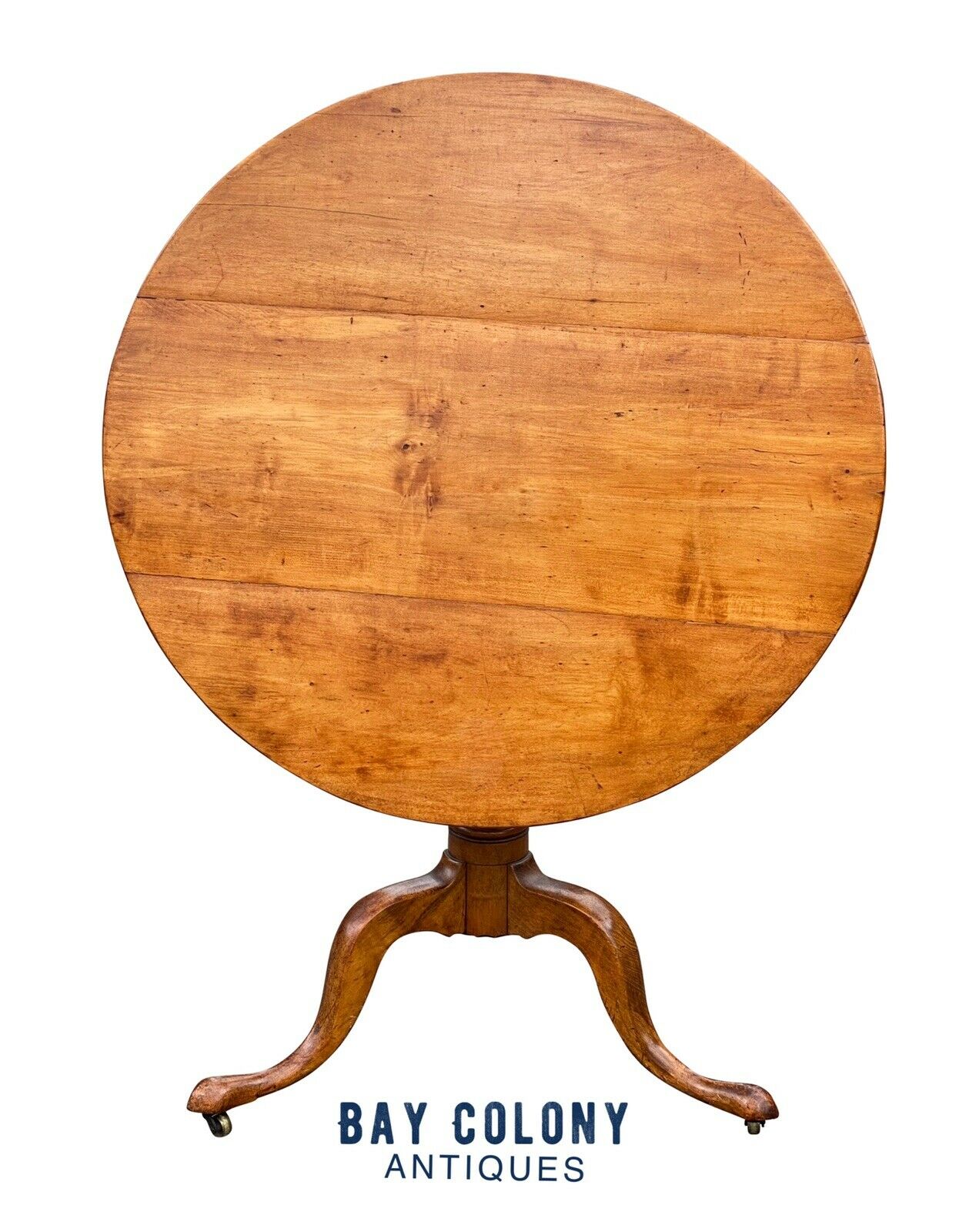 Bay Colony Antiques is proud to offer for sale this wonderful 18th century antique New England Pear wood tilt top tea table. Not many people think of Pear wood when it comes to cabinet making but it is actually very durable yet still workable. Pear wood generally has a straight grain, and its uniformity makes it suitable for projects where you wouldn’t want a busy grain with large arches like Cherry or Walnut. Pears were not native to the Americas but were brought here by early colonists. In addition to providing delicious fruit, pears were one of the preferred fruits to ferment into an alcoholic beverage called Perry. The table has a three board top and a well proportioned column but the legs absolutely steal the show. The cabriolet legs are finely formed with a slender ankle and terminate with slipper feet. What we find most intriguing is how dramatic the angle of the curve is and how the knees plateau at a near 90 degree angle before the final flare at the end that connects to the column. When the top is locked down like in our gallery photo the table has a 33 3/4” diameter and is 28 1/4” tall. When the top is flipped up the table measures 33 3/4” wide x 25” deep x 46 1/2” tall.
