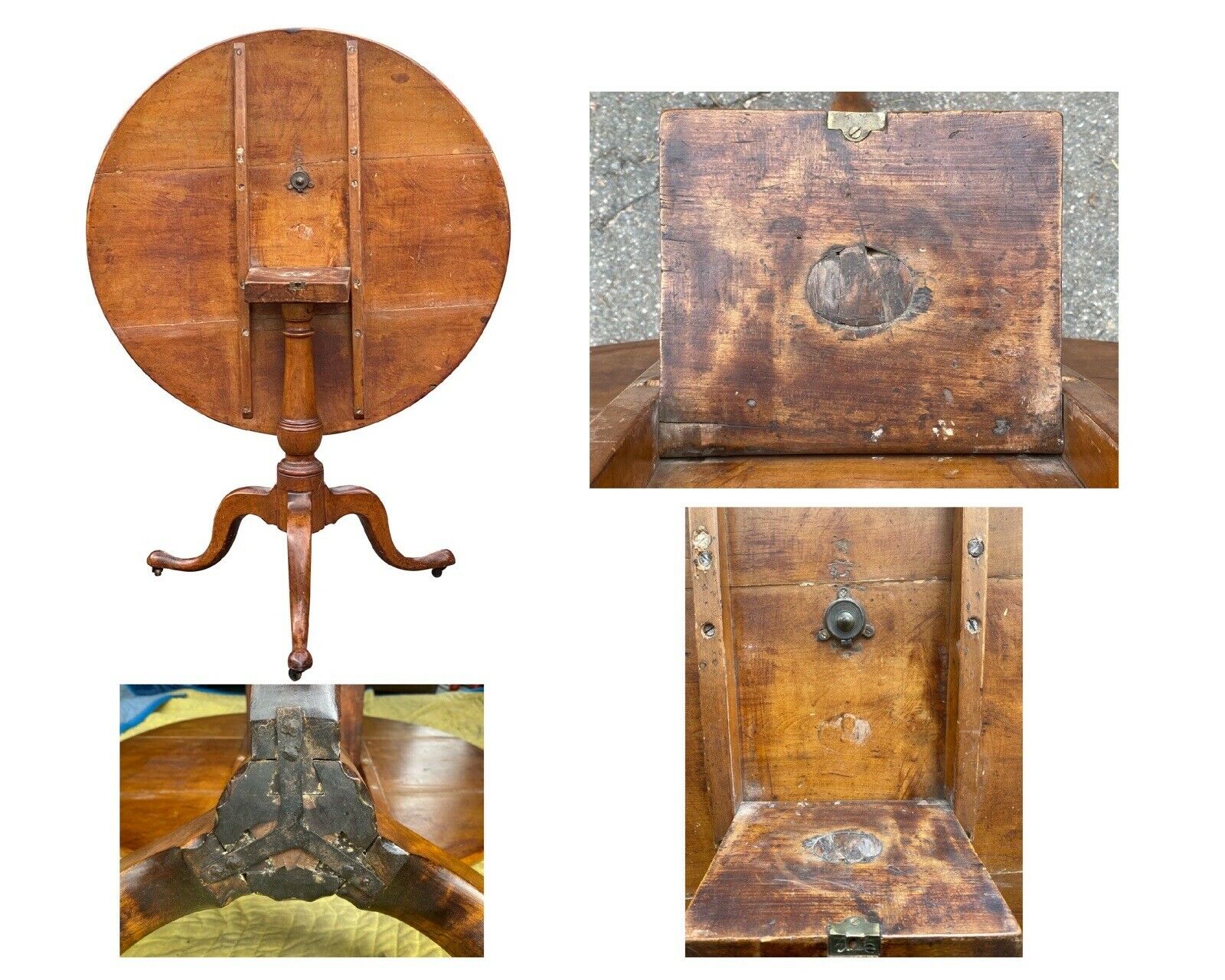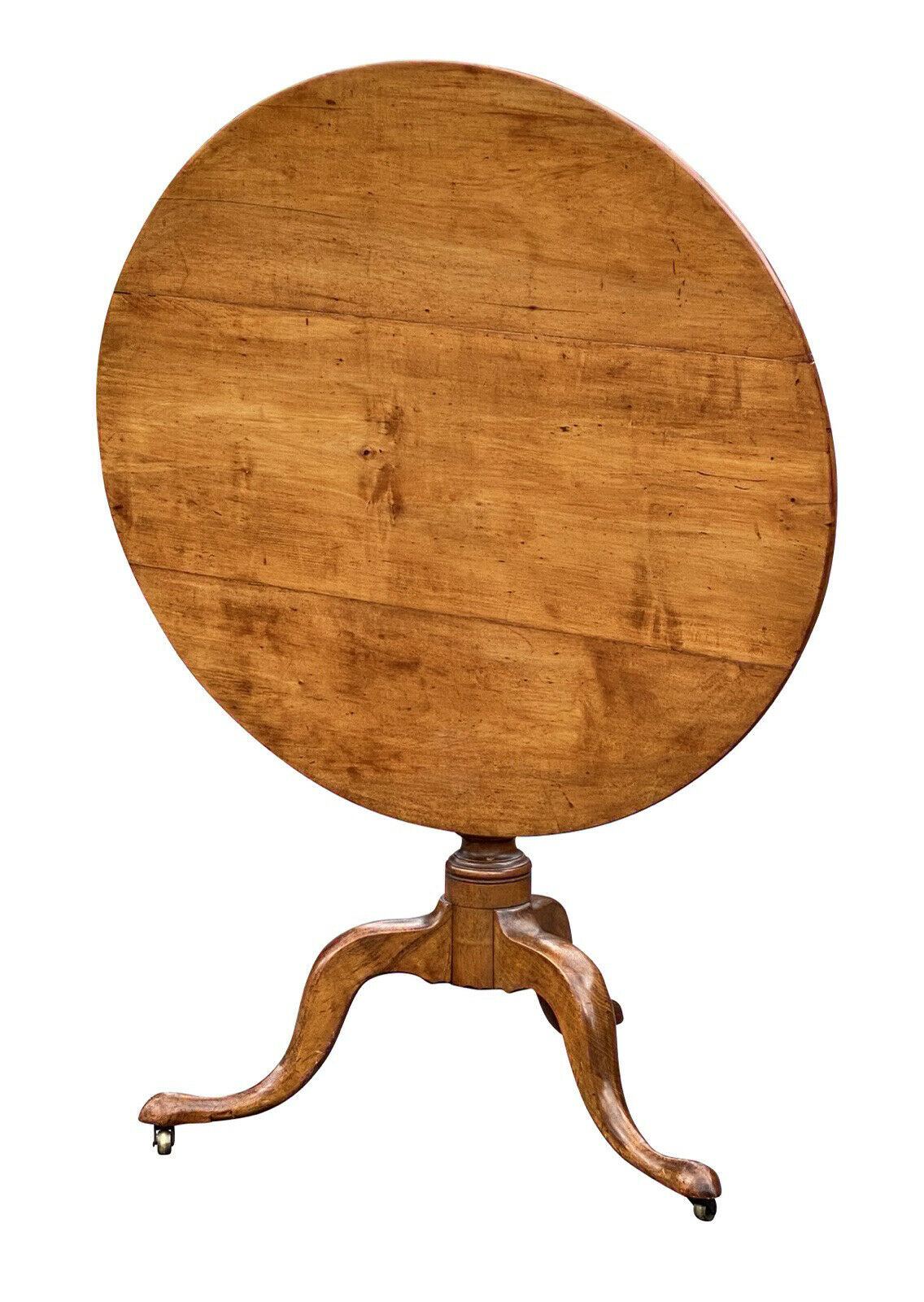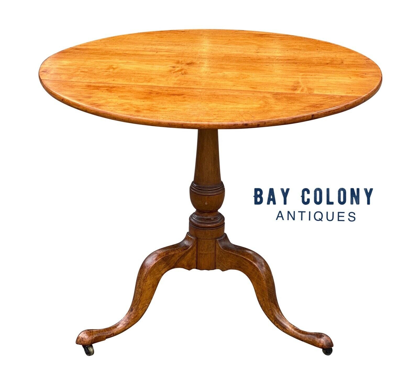 Bay Colony Antiques is proud to offer for sale this wonderful 18th century antique New England Pear wood tilt top tea table. Not many people think of Pear wood when it comes to cabinet making but it is actually very durable yet still workable. Pear wood generally has a straight grain, and its uniformity makes it suitable for projects where you wouldn’t want a busy grain with large arches like Cherry or Walnut. Pears were not native to the Americas but were brought here by early colonists. In addition to providing delicious fruit, pears were one of the preferred fruits to ferment into an alcoholic beverage called Perry. The table has a three board top and a well proportioned column but the legs absolutely steal the show. The cabriolet legs are finely formed with a slender ankle and terminate with slipper feet. What we find most intriguing is how dramatic the angle of the curve is and how the knees plateau at a near 90 degree angle before the final flare at the end that connects to the column. When the top is locked down like in our gallery photo the table has a 33 3/4” diameter and is 28 1/4” tall. When the top is flipped up the table measures 33 3/4” wide x 25” deep x 46 1/2” tall.