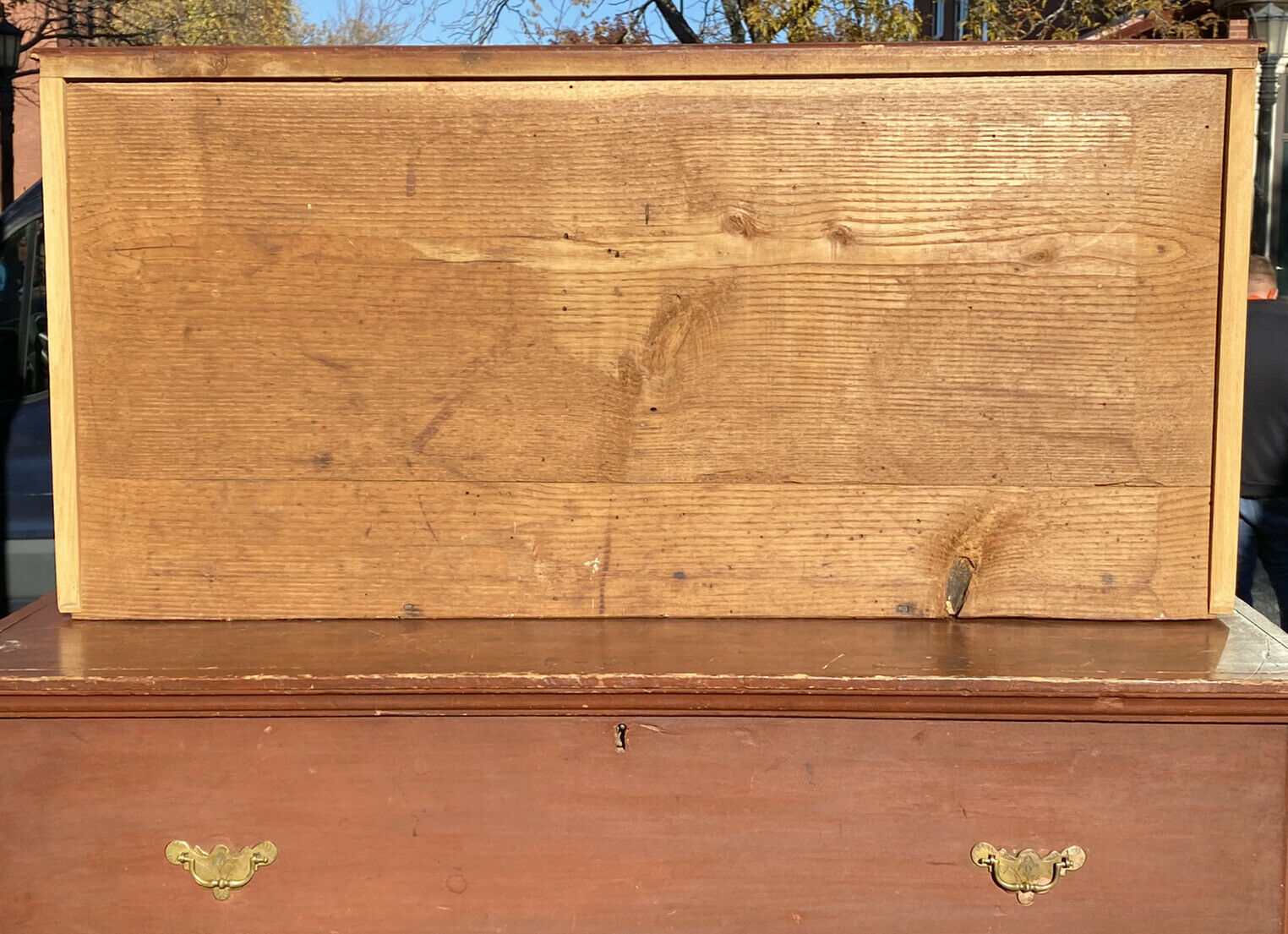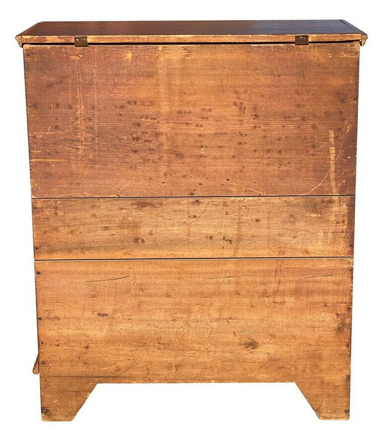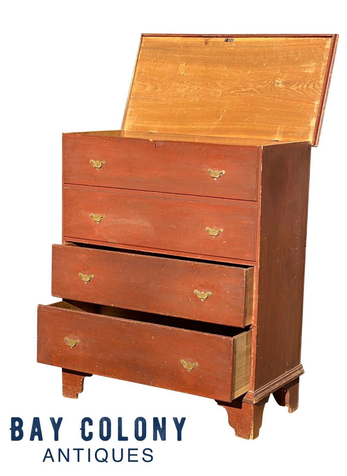 Bay Colony Antiques is delighted to offer for sale this choice 18th century antique Queen Anne period 2 drawer blanket box. This is a wonderful, unadulterated New England box with 2 simulated upper drawers, original brass hardware, original iron lock & hasp, original leather hinges, & original red wash surface. The box is crafted from old growth, native pine with fantastic early construction like hand cut dovetailed drawers & base, and hand chamfered drawer bottoms. The chest measures 39 1/4" wide x 19 1/2" deep x 47" tall. When the lid is fully open the height is 64 1/2". The chest is in fantastic condition & would make a nice addition to any early American collection.