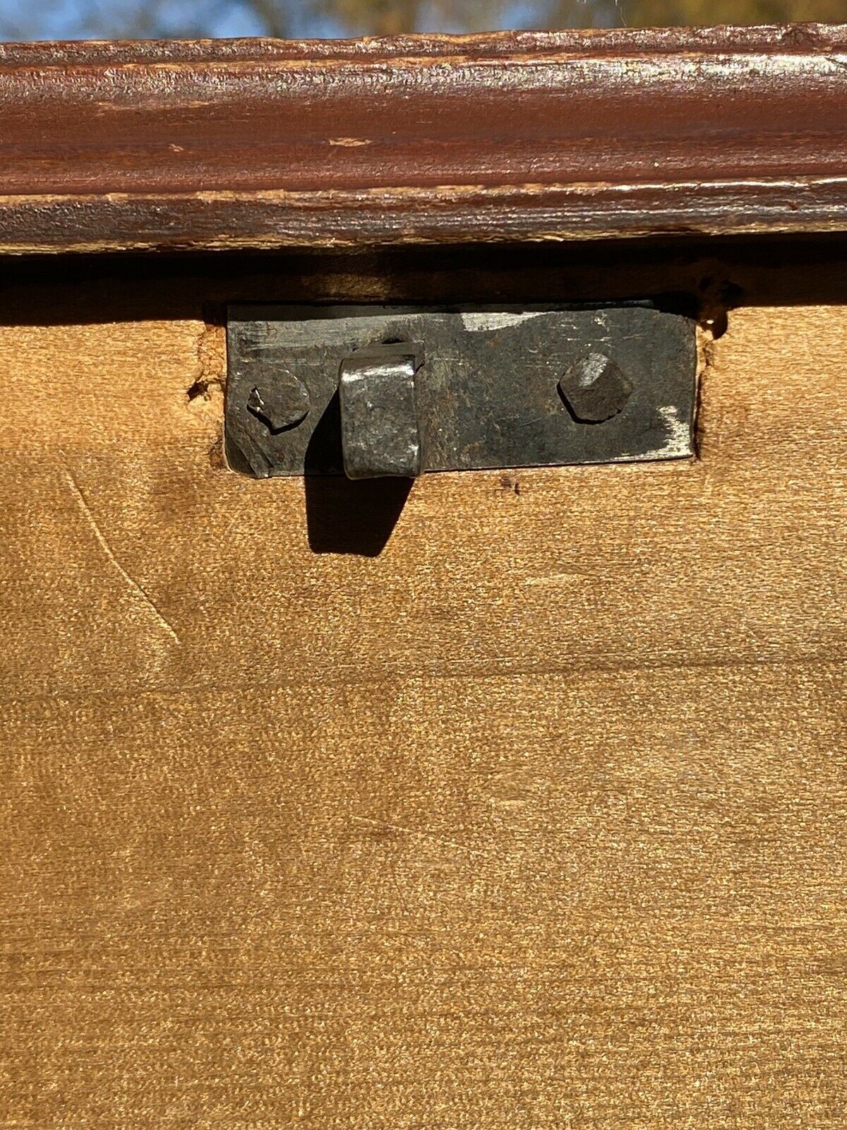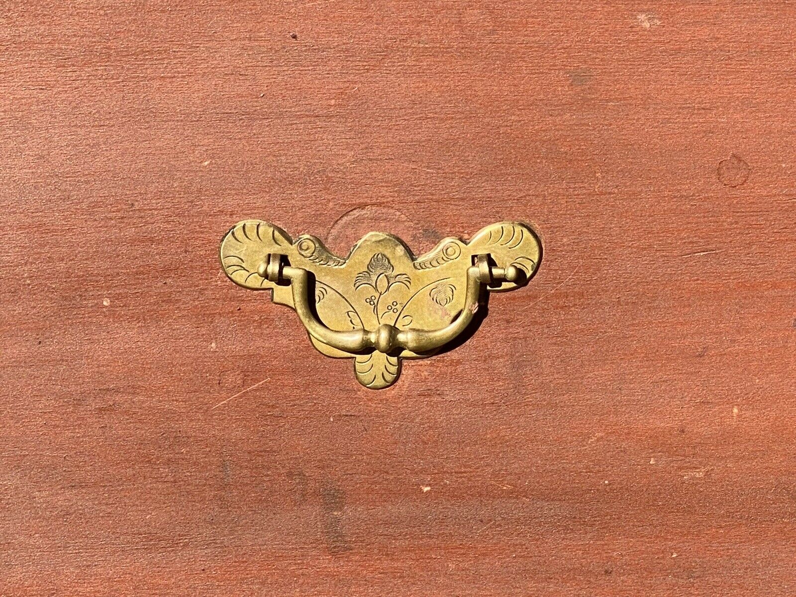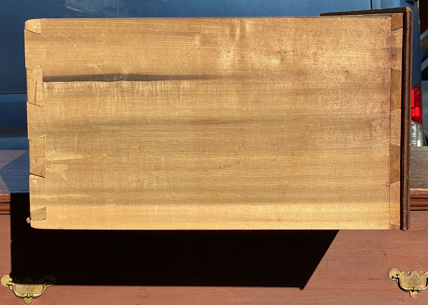 Bay Colony Antiques is delighted to offer for sale this choice 18th century antique Queen Anne period 2 drawer blanket box. This is a wonderful, unadulterated New England box with 2 simulated upper drawers, original brass hardware, original iron lock & hasp, original leather hinges, & original red wash surface. The box is crafted from old growth, native pine with fantastic early construction like hand cut dovetailed drawers & base, and hand chamfered drawer bottoms. The chest measures 39 1/4" wide x 19 1/2" deep x 47" tall. When the lid is fully open the height is 64 1/2". The chest is in fantastic condition & would make a nice addition to any early American collection.