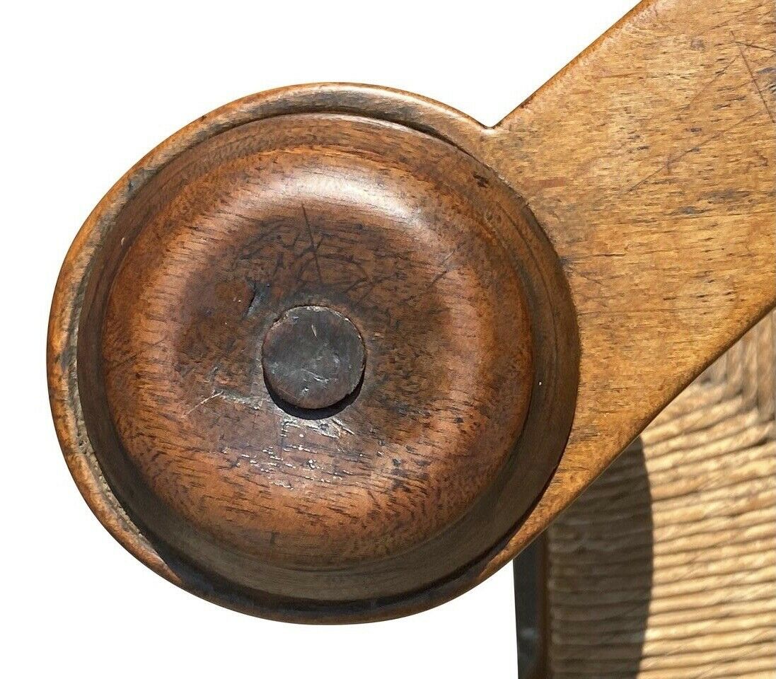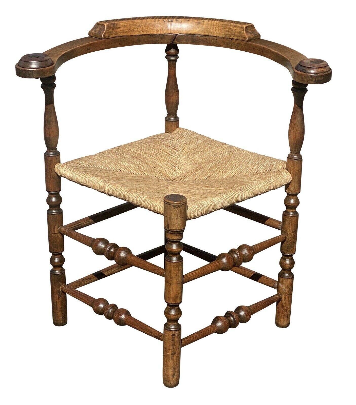 With our highest compliments and utmost honors, Bay Colony Antiques is proud to bring to market this fantastic 18th century antique Queen Anne Tiger Maple corner / roundabout chair. We encounter a fair amount of early Queen Anne & Chippendale roundabout chairs but only purchase a select few each year. When this chair was made it wouldn’t have excited many people as they were traditionally crafted in Mahogany or Walnut with complex splats & either pad or ball & claw feet. This is a country made piece by a skilled cabinet maker who must have been familiar with the trendy new design but didn’t have the experience or a sufficient enough market to perfect it. The chair has a rush seat that’s completely useable and intact and features simple turnings on the legs with bulbous stretchers. We absolutely adore this chair and would recommend it without any hesitation to even the most discriminatory furniture collectors. When the chair was originally made this would have been a cheap alternative to one made in a formal cabinet making shop. Because so few were made like this and this chair is most likely one of a kind, the opposite is now true and this Tiger Maple example is considerably more valuable than it’s Mahogany or Walnut counterparts. With that being said, that doesn't hold true for all maple chairs in this style but this example is a cut above the rest with the nice turning patterns at the base & turned arm caps. The chair measures 29” wide arm to arm x 25” deep x 29 1/4” tall with a seat height of 18” tall.