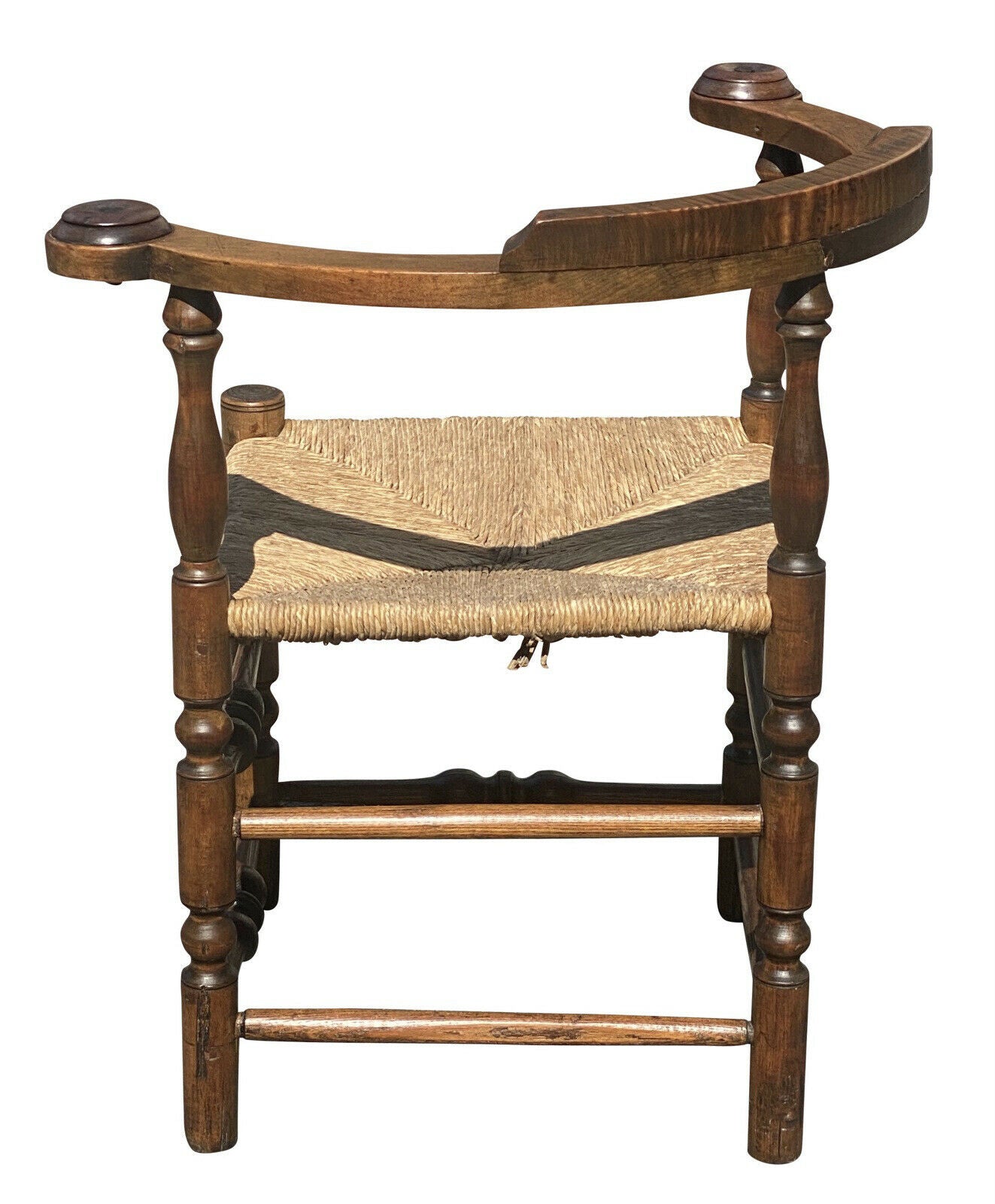 18TH C ANTIQUE QUEEN ANNE TIGER MAPLE ROUNDABOUT / CORNER CHAIR W/ RUSH SEAT