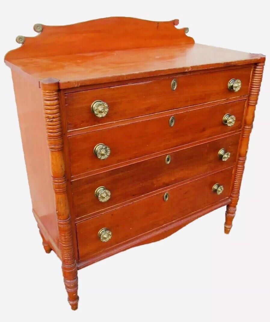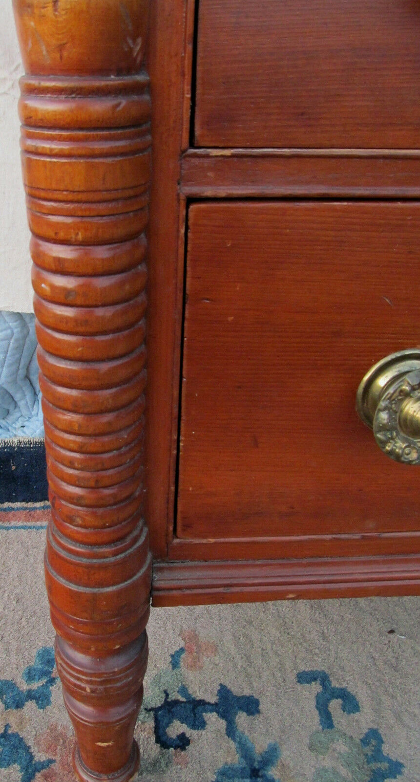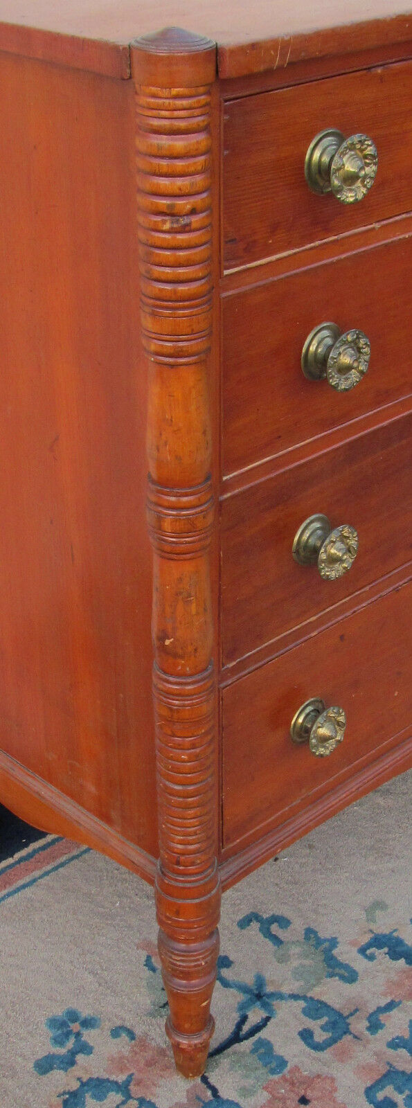 With our highest compliments we are delighted to offer you this handsome 18th Century New Hampshire Sheraton period dresser in pine with maple ring turned columns and turned legs. This is a superb example of the New Hampshire side of the North Shore American furniture movement. It stands right out with masterfully turned columns, graceful aprons on its front and sides, doublewave formed back gallery and original period pulls. This dresser has dovetailed pine plank base construction with lovely deeply chamfered pine drawer panels and back panels. The case has cockbead molding around all of the drawer openings. We received it less one brass rosette on the gallery. We note an old small restoration on one side of the gallery missing the rosette and possibly one drawer panel replaced with a chamfered oak panel. We disclose anything that comes to our attention and try to be as careful as possible when it comes to important period antiques. We are in no way certain this was not originally done by the maker and it is not uncommon to see such events occurring. This panel we mention is certainly of the proper age where we have a question if it was replaced or not. This is an important piece of American furniture worthy of any good collection being sold at a very fair no miss price. This chest is 40" long, 19 1/2" wide (deep) and 40 1/2" tall with an additional 6" high back gallery.