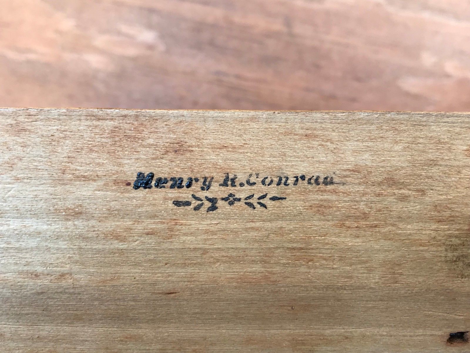 We are delighted and honored to offer for sale this wonderful late 18th century Chippendale period blanket box with the absolute best ochre paint decorated surface in an attractive golden brown color way. This 6 board blanket box is an absolute case study in early joinery techniques and is refreshingly unaltered. The chest retains it's original hand forged iron hasp and crab lock. The interior is fitted with a lift top candle till with two drawers below. The box is branded "Frank R Conrad" and "Henry R Conrad" on the interior. A convenient wooden shuttle can be used to prop open the molded lid for easier access. There's no evidence of snipe or strap hinges being in place on this early chest. We believe the old barrel hinges to be true and original with no evidence of them being moved. This chest is adorned with very handsome embossed ring pulls and heavy brass escutcheon plates. The drawers employ a molded edge design with hand hewed drawer bottoms rich with tool marks.