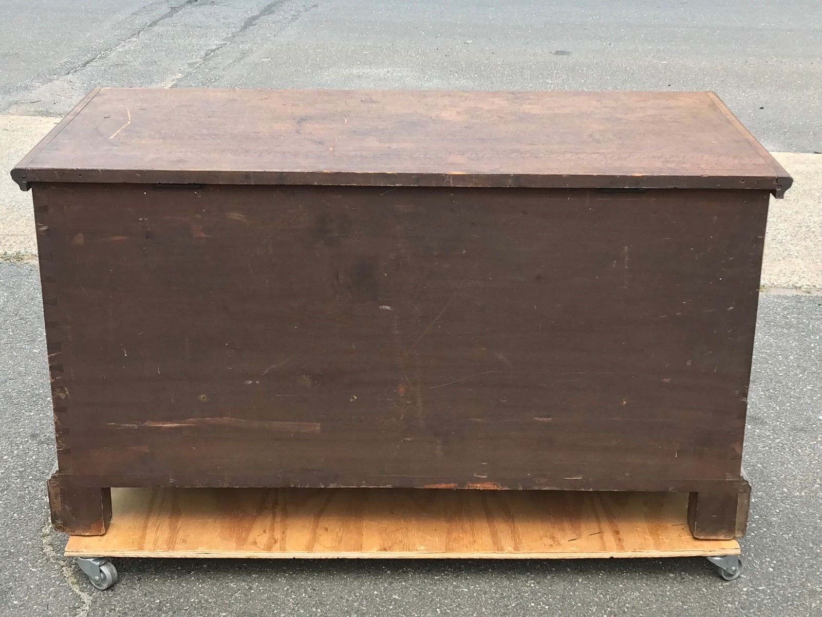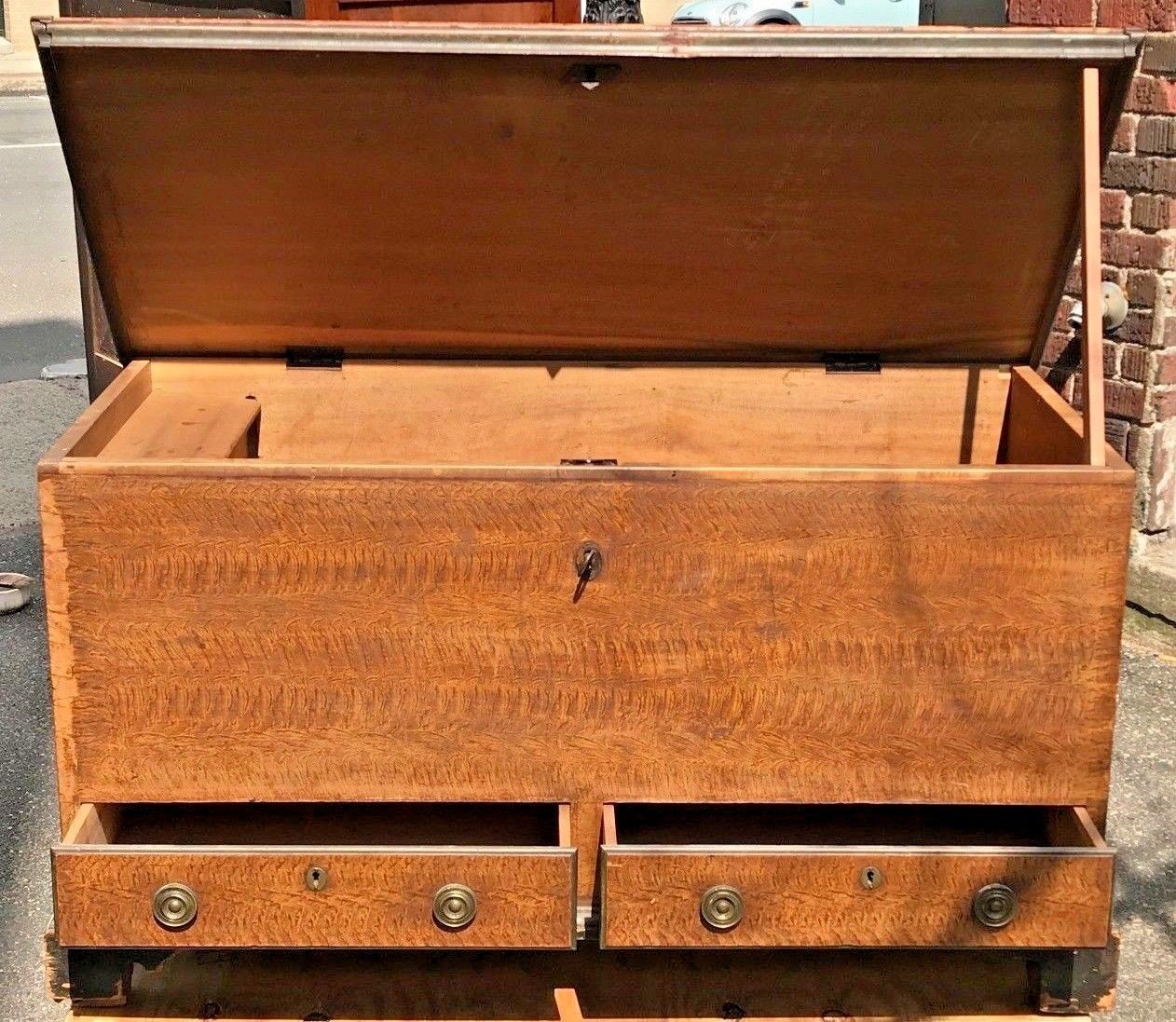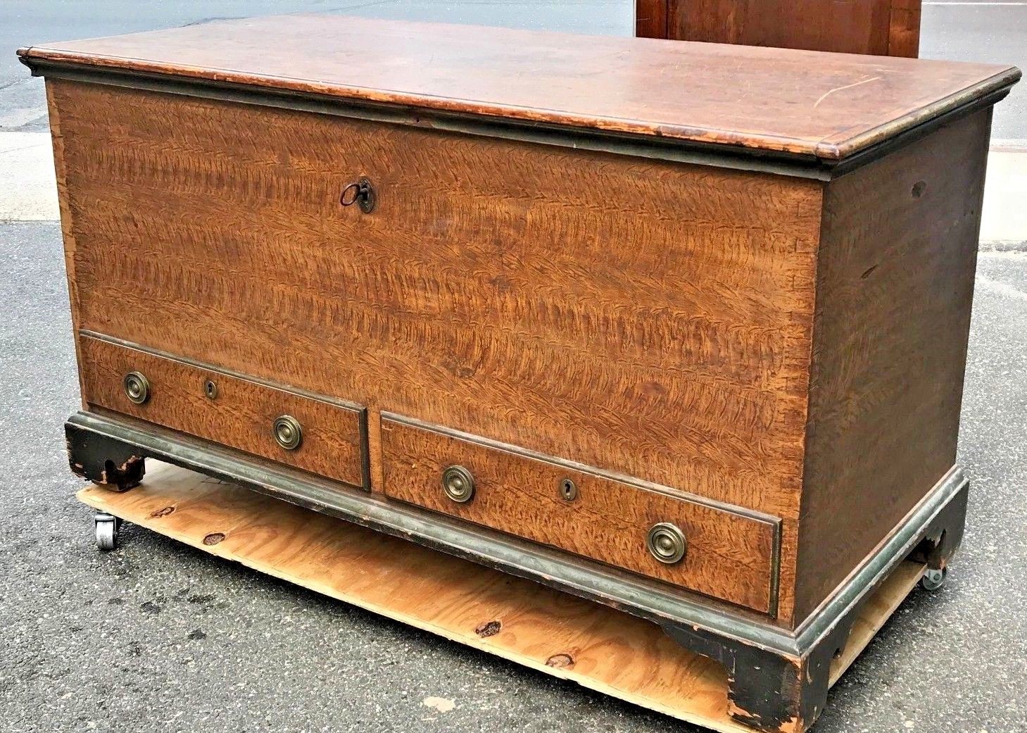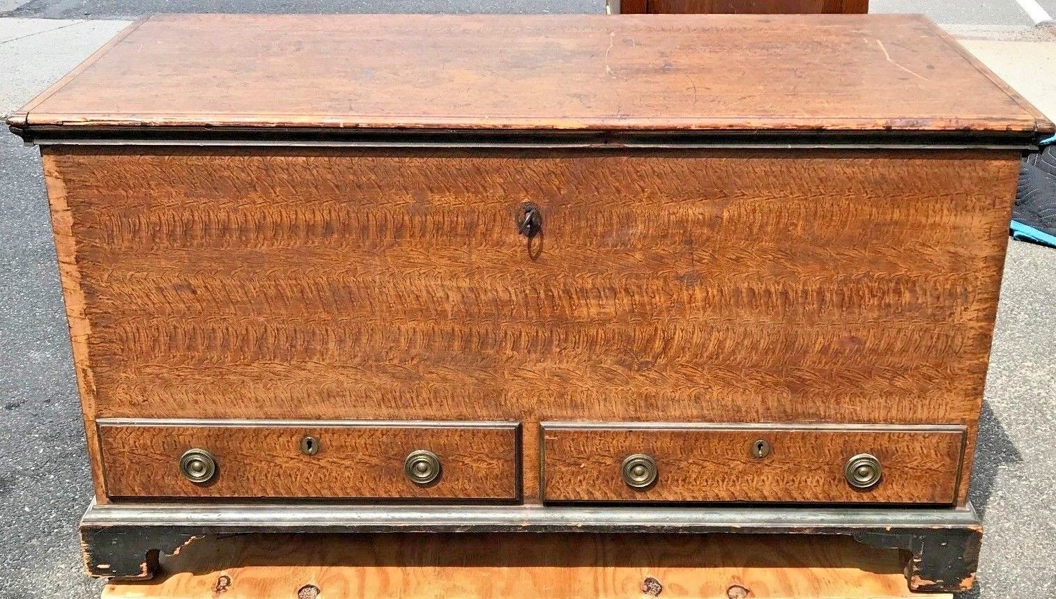 The painted surface is absolutely delightful. Decorated surfaces have long been practiced in cabinetmaking. Early pigments were created with various earthen elements like vermilion, iron oxide, and lead. Making the pigments was a laborious and dangerous task for early artisans of the period. This rare ochre painted grain surface is exceptionally well done by a talented and practiced hand. The chest stands on a bracket base with small decorative spurs furthering the symmetry and congruity of the box. We note a small, about 1" portion of the left bracket foot is missing. We have our restoration expert correcting the matter on this significant piece. The chest is a generous 50" wide x 24" deep x 28" tall. When the lid is fully extended at the highest point the height is 49 1/2".