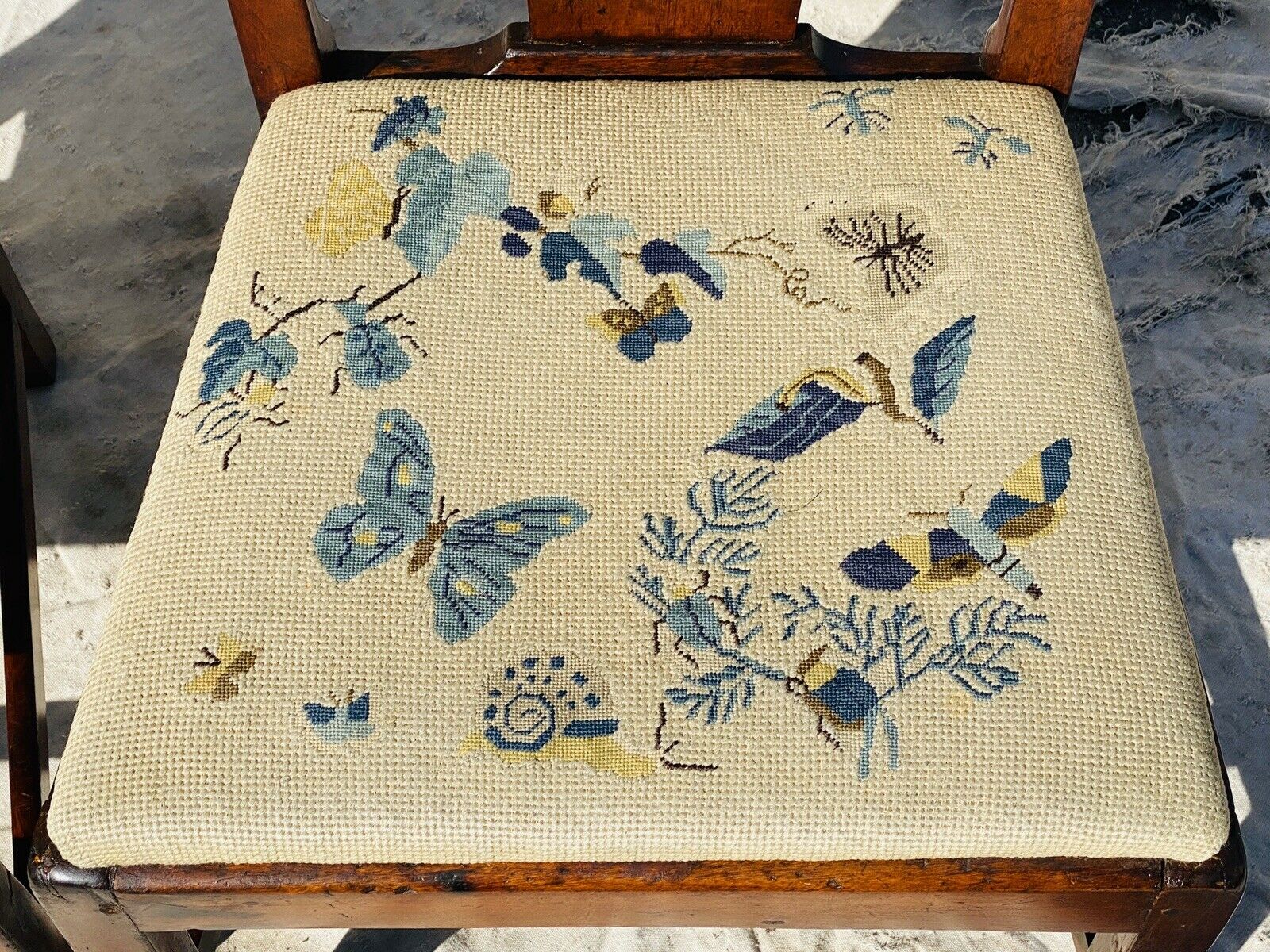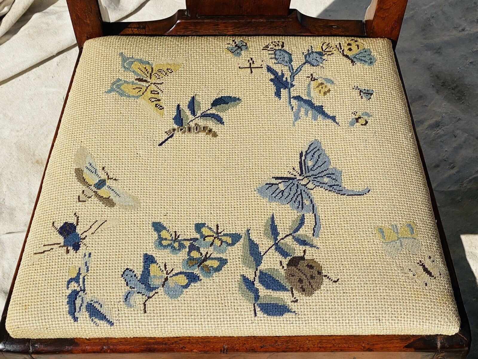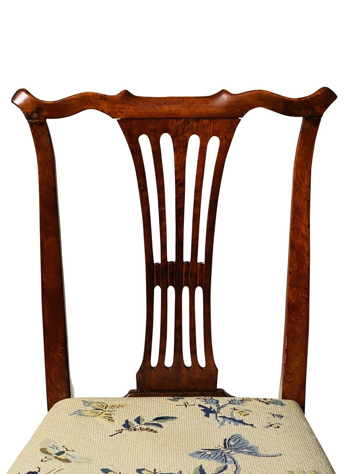 We're pleased to offer for sale this great 18th century pair of mahogany Chippendale period side chairs. These are 200+ year old chairs in good condition for their age. The previous owners had the front & rear legs properly restored on one of the chairs. The chairs exhibit nice proportions and are a cut above most with pierced carved splats, wonderfully formed cupids bow crest & great needlepoint seats. The seats are exceptionally cute decorated with ladybugs, butterfly, bees & vegetation on a cream colored field.