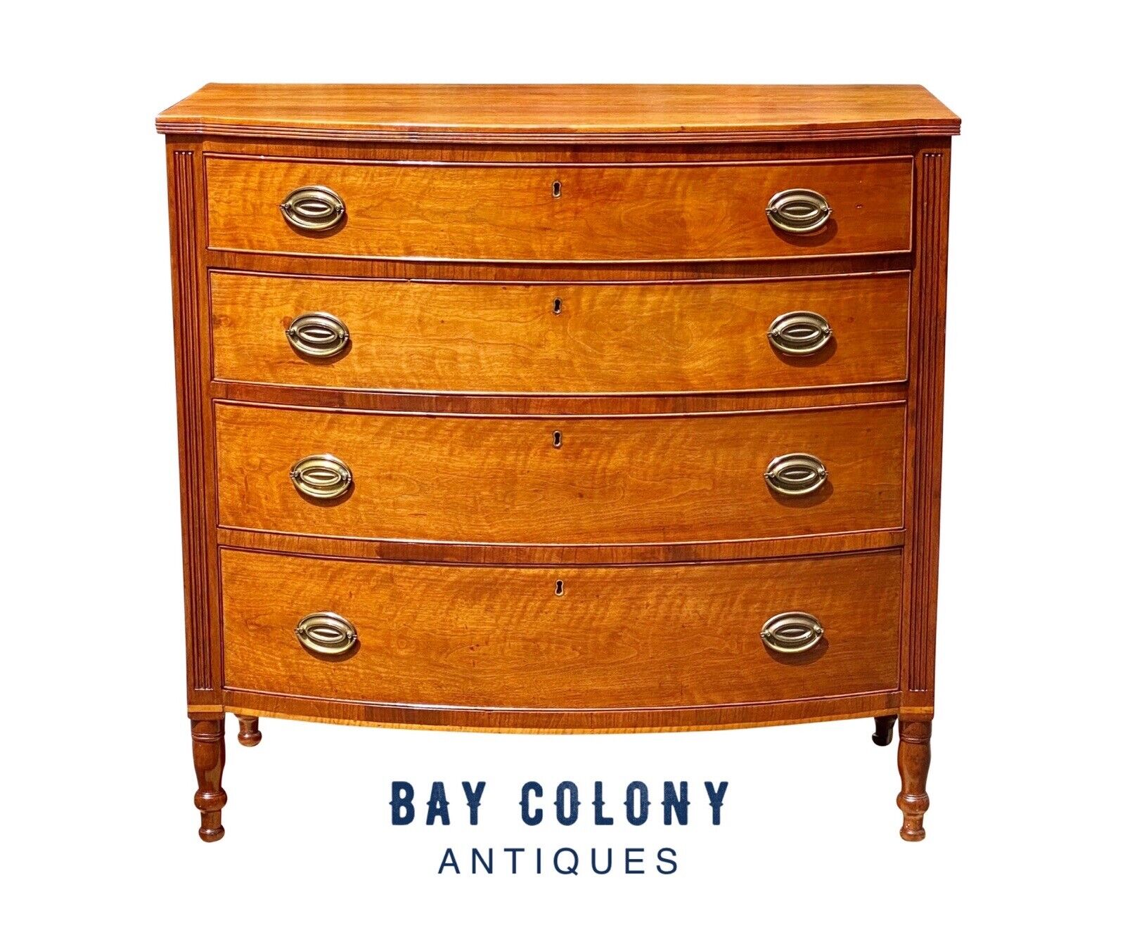 The chest has a shaped top that conforms to the case and has 4 graduated drawers. The brasses have been replaced, but that’s not unusual because a lot of these began their lives with wood pulls. During the late 18th century when the chest was made the majority of brass hardware used in the US was imported from England. Transatlantic trade was still a risky venture and brass hardware was not always available. The drawers have New England White Pine secondaries & were constructed with hand cut dovetails and hand chamfered panels. The drawer faces showcase an attractive figured Cherry which was one of the most desirable native lumbers & was prevalent in the area. Mahogany was still very expensive and because it had to be imported from the Caribbean it wasn’t regularly available outside of major port cities with an established cabinet making market like Boston, Philadelphia, or New York. The drawers were further decorated with cock bead molding & are flanked by reeded panels. There’s a light wood inlay along the apron and the chest rests on four turned legs that we absolutely adore because the majority of bow fronts from the area have French feet.