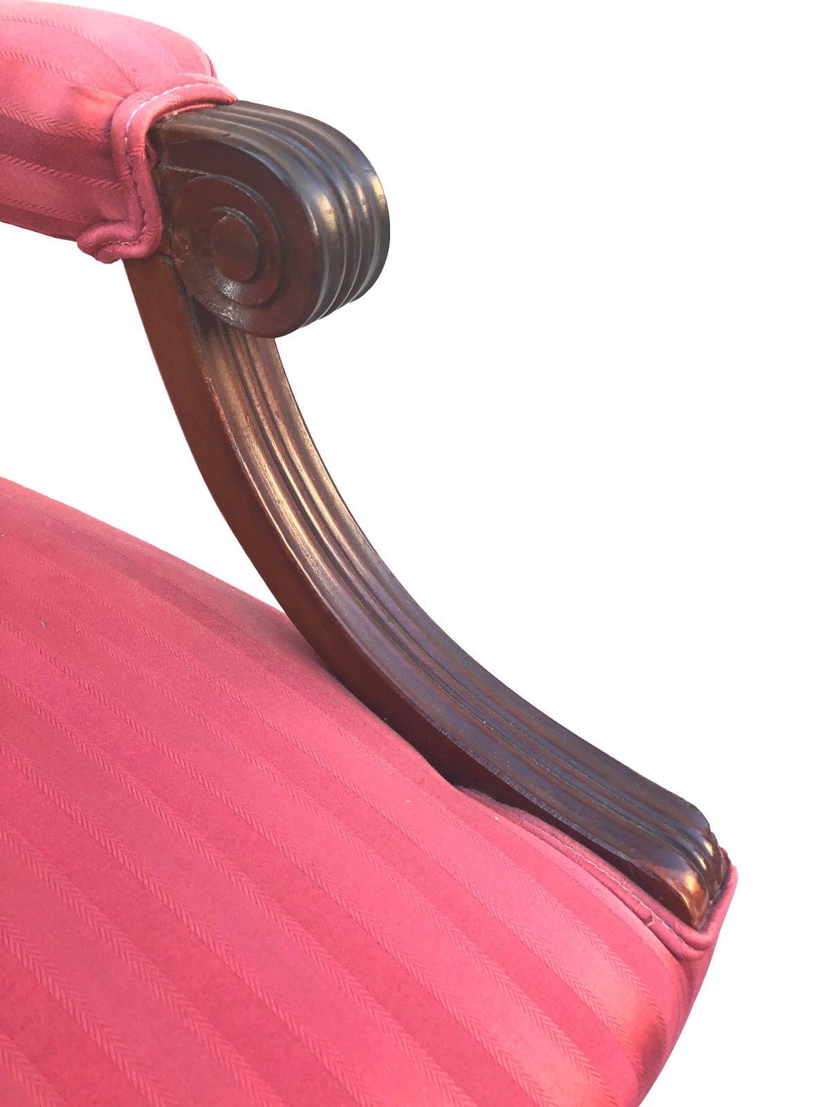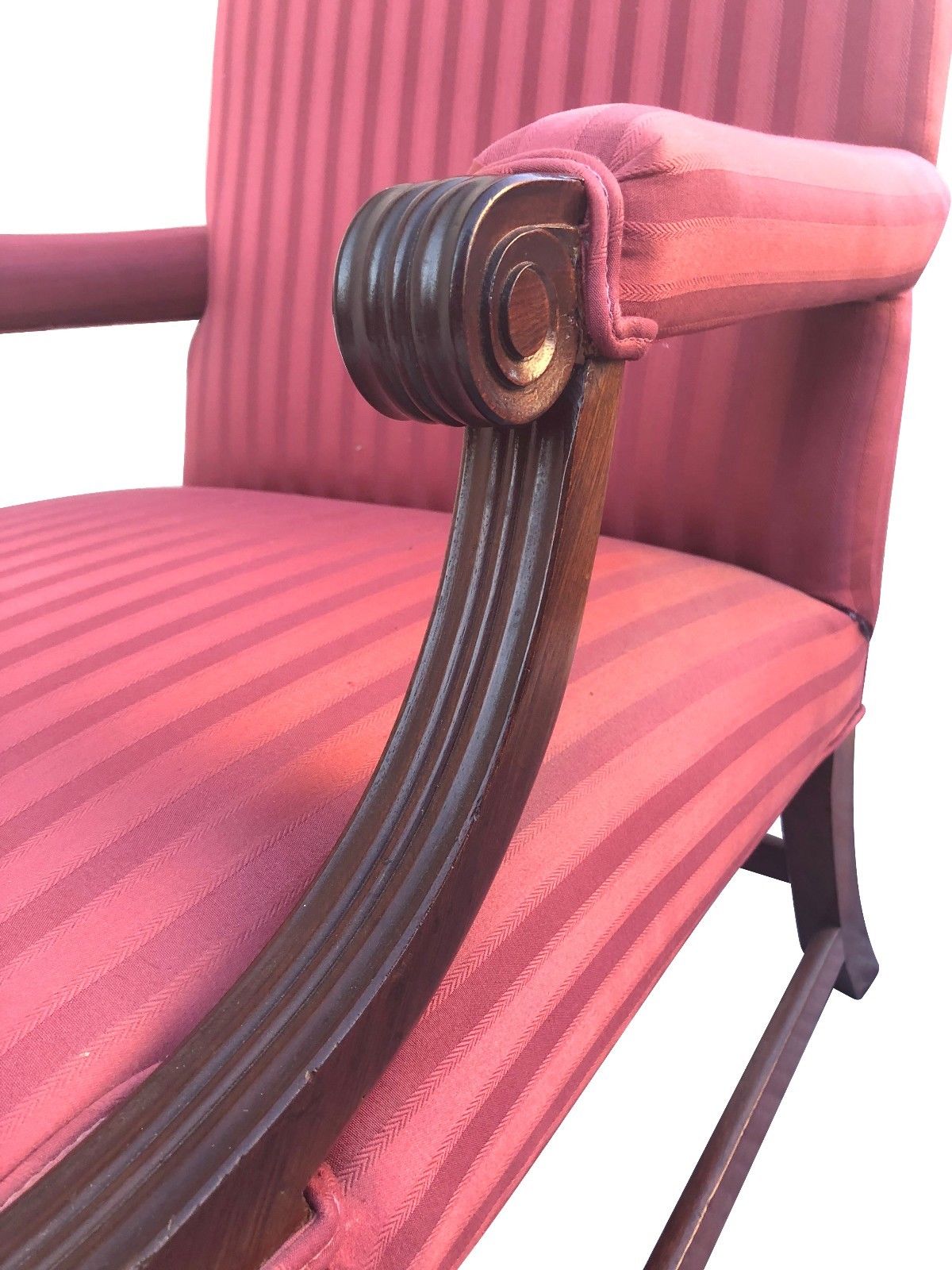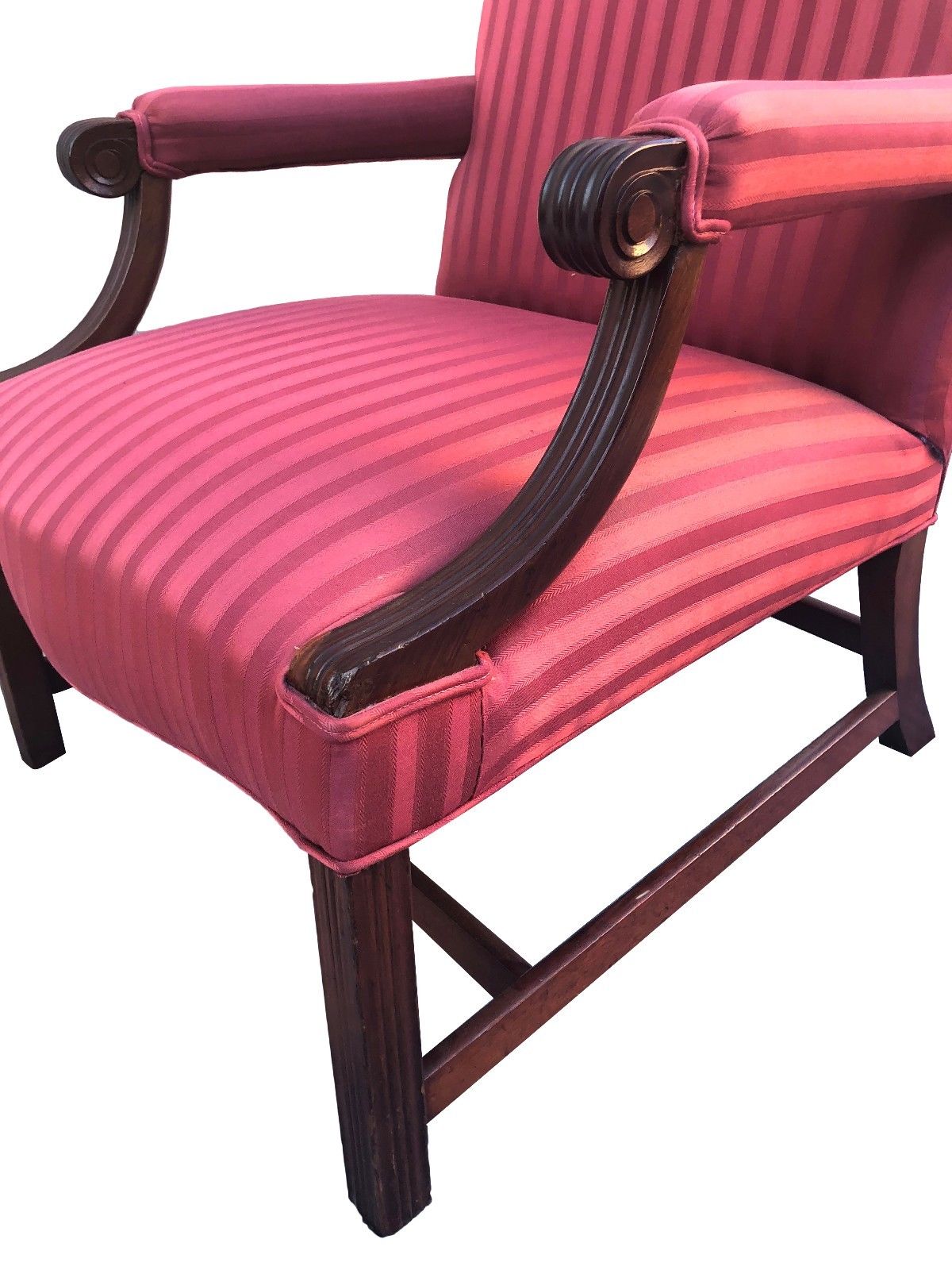 Bay Colony Antiques is delighted to offer you this very high quality 18th century Chippendale Lolling Chair. Refereed to as "Library Chairs" in the Thomas Chippendale Directory this chair is appointed in a very tasteful and expensive fabric, carved rolled arms with Marlborough front legs and splayed rear legs it is 38" tall, 27 1/2" wide, 30 1/2" deep with a 16" high seat.