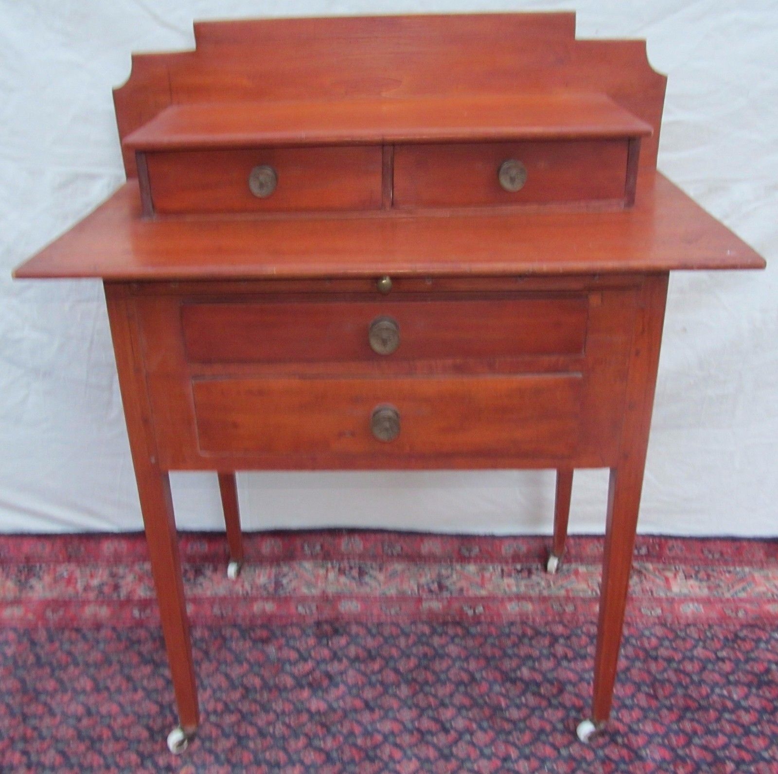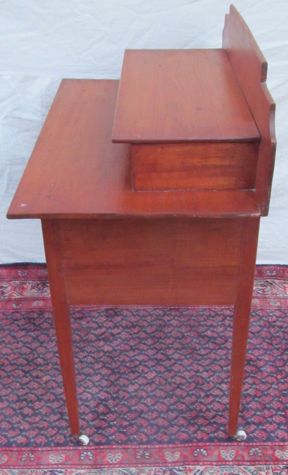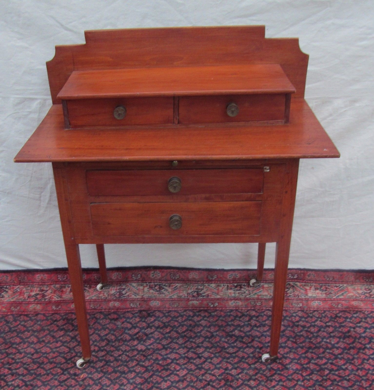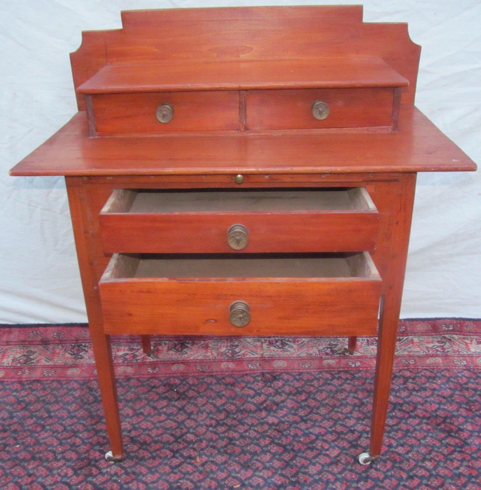 With our utmost pleasure, we are delighted to offer you this very interesting 18th Century New England Hepplewhite pine server. It possesses a stepped back gallery, twin upper 1/2" drawers, a pull out work tab over two full sized drawers, nicely tapered legs, original porcelain caster wheels and fantastic period Republic Eagle brasses, with 13 stars representing the original colonies of America. It is in a red paint finish that we believe is original having a later white paint wash scrubbed away. We note some great peg fastening. The pegs have been left proud and each leg has four separate pegs on each the inner and outer sides of the legs. It is 30 1/2" long, 18" wide, 28" tall to the work surface, 32" tall to the top of deck and 38" tall to the back of the galleries top.