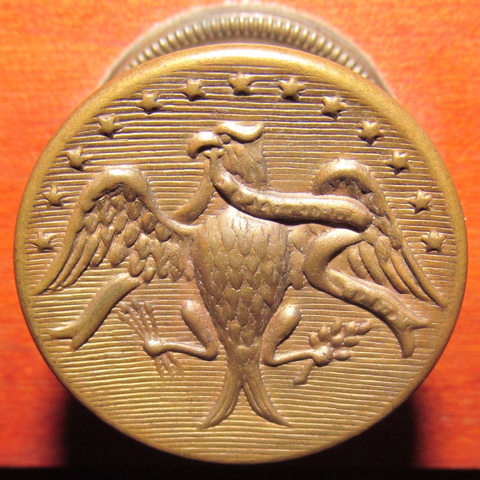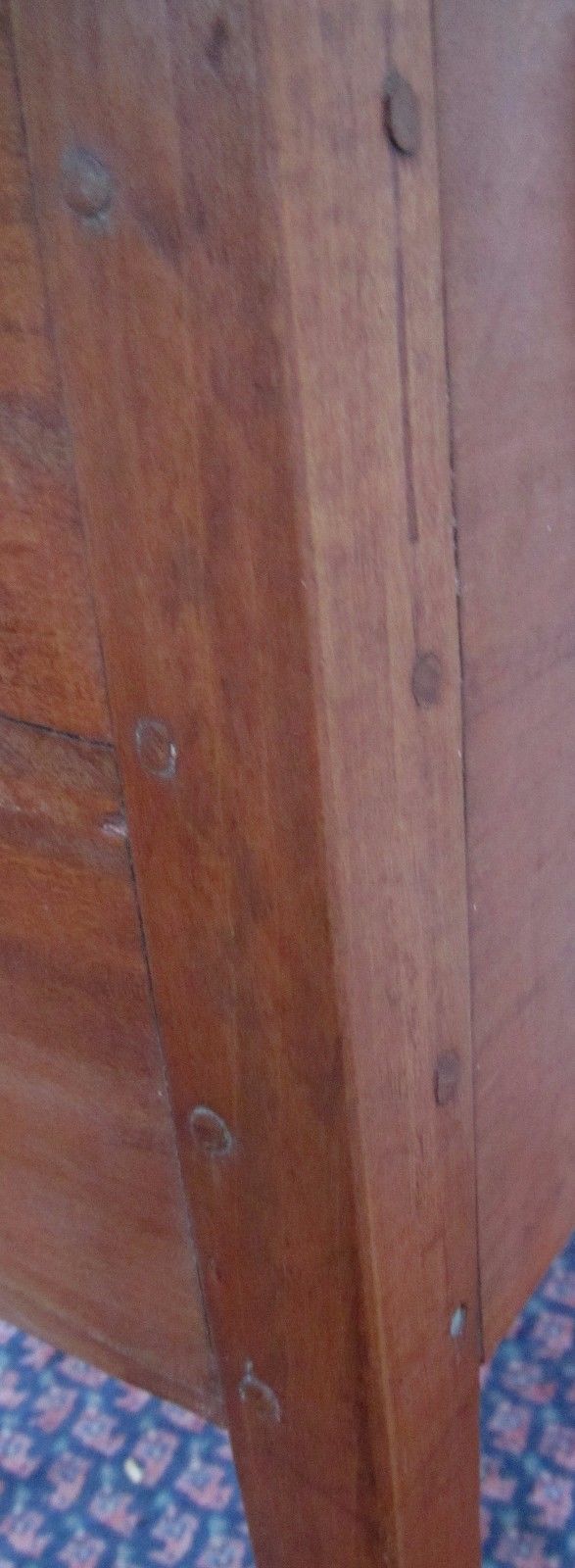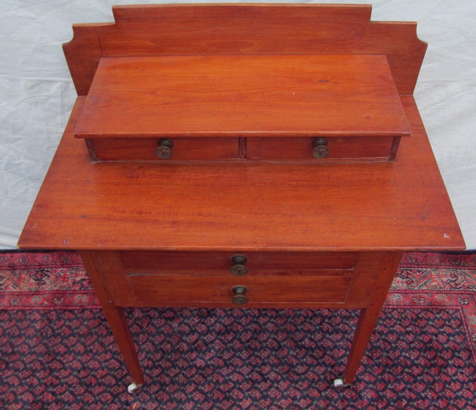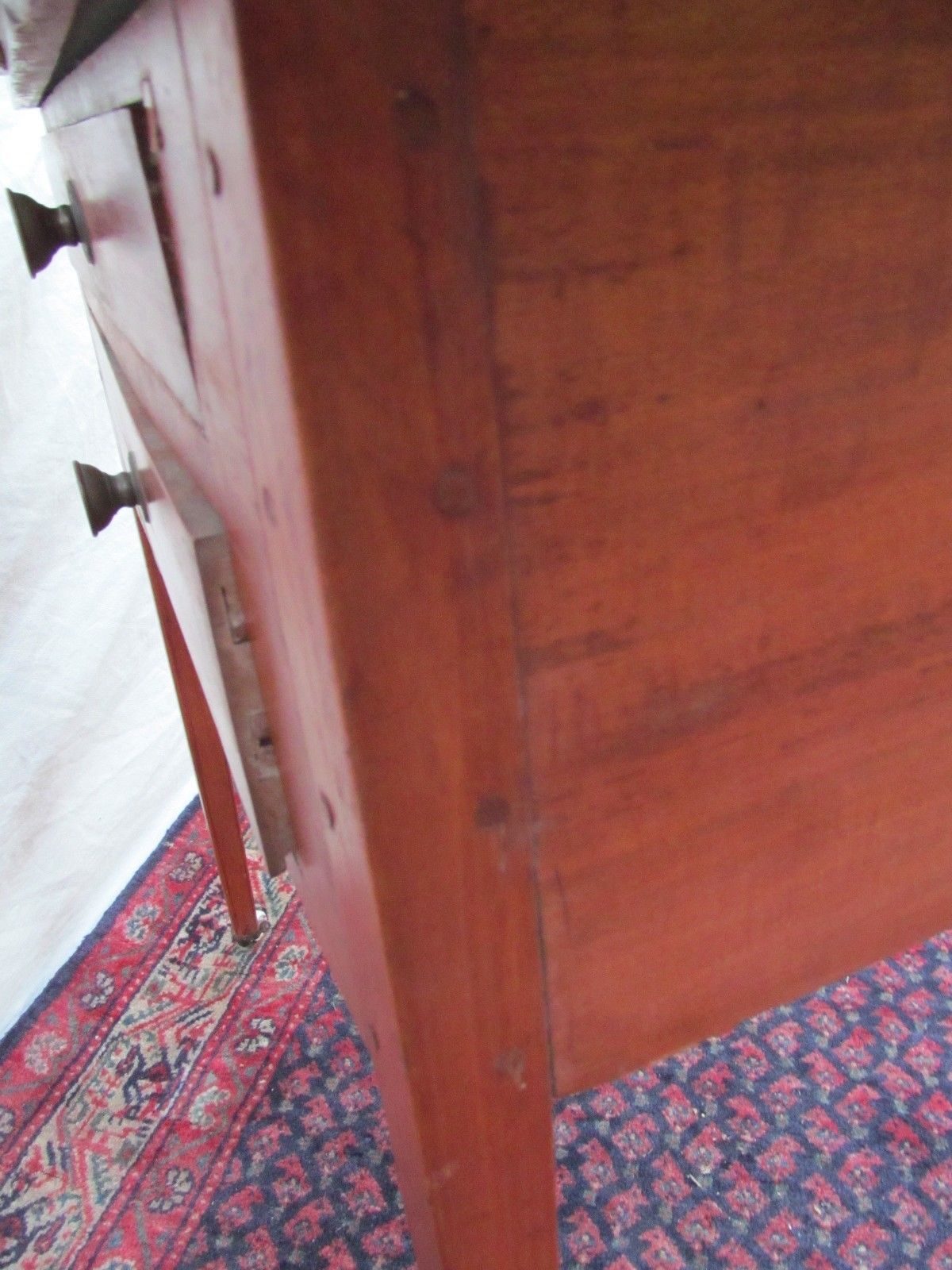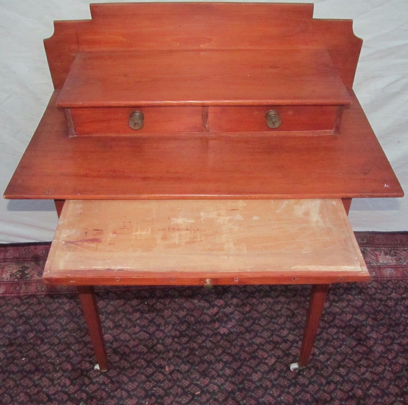 With our utmost pleasure, we are delighted to offer you this very interesting 18th Century New England Hepplewhite pine server. It possesses a stepped back gallery, twin upper 1/2" drawers, a pull out work tab over two full sized drawers, nicely tapered legs, original porcelain caster wheels and fantastic period Republic Eagle brasses, with 13 stars representing the original colonies of America. It is in a red paint finish that we believe is original having a later white paint wash scrubbed away. We note some great peg fastening. The pegs have been left proud and each leg has four separate pegs on each the inner and outer sides of the legs. It is 30 1/2" long, 18" wide, 28" tall to the work surface, 32" tall to the top of deck and 38" tall to the back of the galleries top.