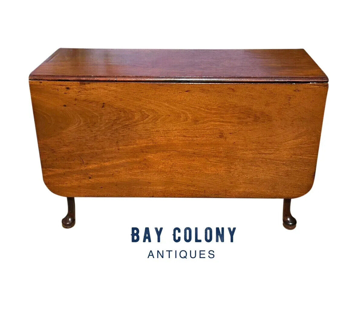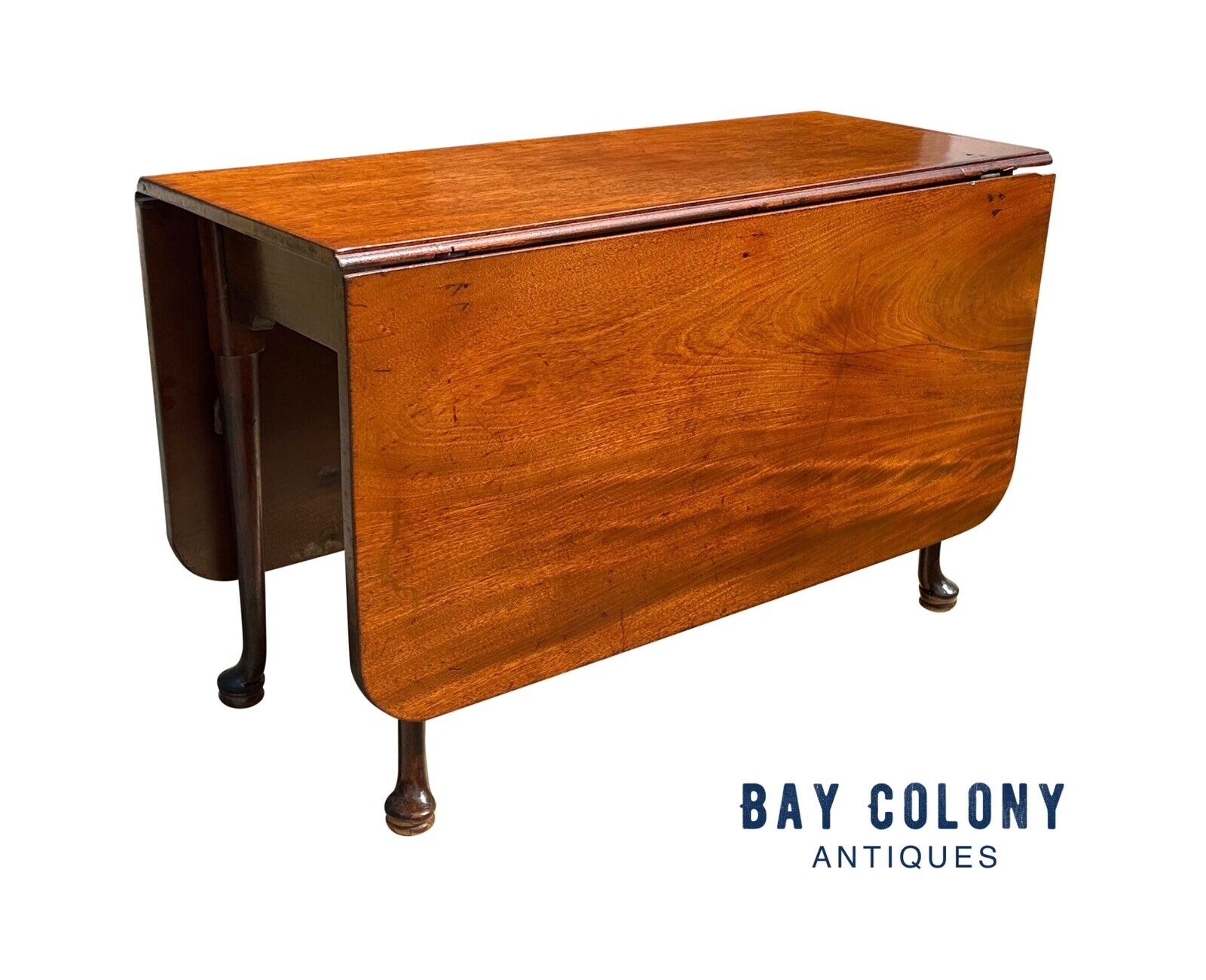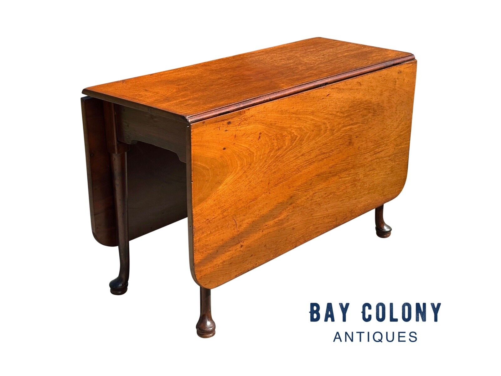 Bay Colony Antiques takes the utmost pleasure in offering one of the absolute finest early American drop leaf dining tables to be found anywhere in the American antiques market. We have treasured many dropleaf tables throughout generations of continued operation and now have the privilege of offering one of the most significant that we have ever encountered in any of the collections we have studied or contributed to. While many dropleaf tables have been produced in America and England since the Queen Anne period first began in the mid 18th century there are very few surviving examples that embody the craftsmanship or stature of the table we now offer at present. The earliest known examples of the American Queen Anne dropleaf form table originated near the northeastern coastal cities around Boston, Massachusetts in the late 1750's until they were commonplace through the middle of the Queen Anne era in the late 1760's. The design traveled down the colonial states and westward into rural communities through the end of the Queen Anne period as they transition into the popular Chippendale and federal forms of the revolutionary war period until the turn of the 19th century. The specimen we have brought forth is unquestionably of Boston origination and most certainly a product of the early Queen Anne period sometime throughout the 1750's or 1760's. As is our practice with the majority of the early furniture that we offer for sale we have expanded the potential of the tables origins to as late as the 1780's only in an effort to guarantee consensus amongst all honest and true scholars of important American furniture. Our experience in the field of historical New England furniture gives us a perspective very few others have acquired and we have learned to always err to caution especially when reasonable and fair minded questions may be raised. The table is constructed of the absolute finest grade of exotic Santo Domingan mahogany available anywhere in the world during this era which was nearly exclusive to Boston and the surrounding wealthy port cities. The richness and density of the wood is unique to all other variations of mahogany grown worldwide and can only fully be appreciated with the table in front of you particularly with respect to how heavy and substantial the table is to handle. The top and leaves are masterfully book matched from the same matching mahogany lumber and are hinged by the original iron forged hardware mortised into the underside of the table. The table apron is gracefully scrolled and the expertly formed cabriole legs terminate on an exceedingly rare padded foot sometimes referred to as a "shoe" or "shoed" foot by early furniture experts. Two legs are hinged in opposition to each other which swing out to support the weight of the massive hinged dropleaves. The table still functions as properly as it was first made which is another testament to the superiority of craftsmanship and materials embodied by this early furniture masterpiece. The mahogany has developed a beautiful patina and color throughout time which greatly enhances the overall appeal of this magnificent table. The table measures 19" wide x 45 1/2" deep x 28" tall. When the leaves are locked up the width changes from 19" to 58 1/2" wide.