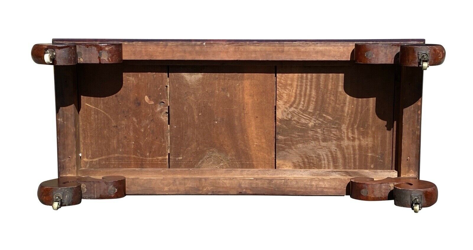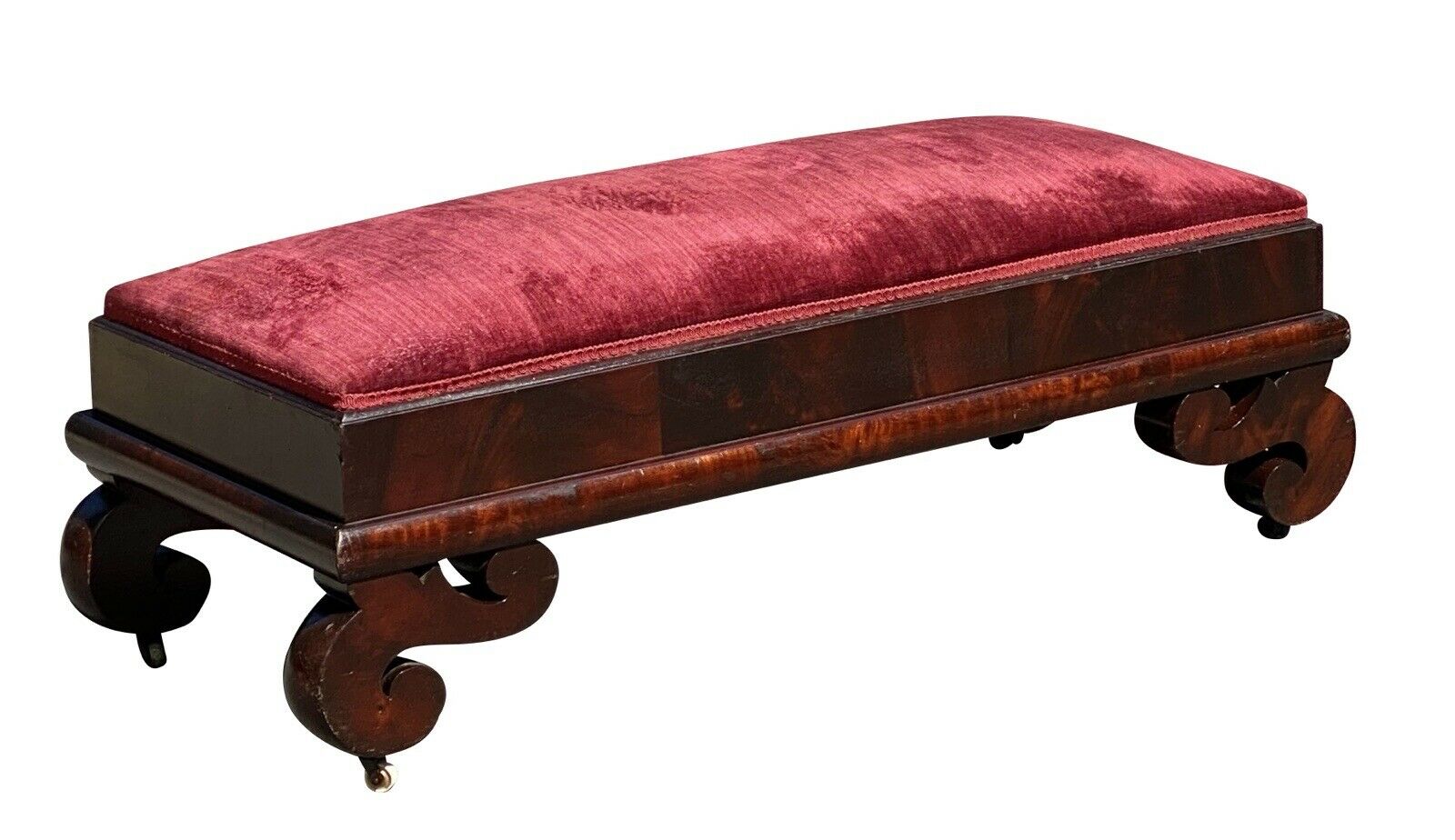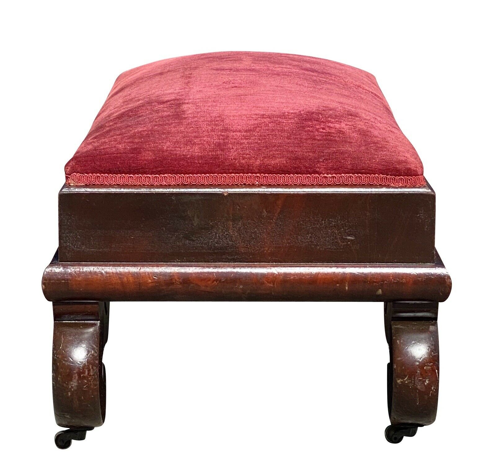 19th C Antique American Empire Mahogany Vanity Bench W/ Red Velvet Seat