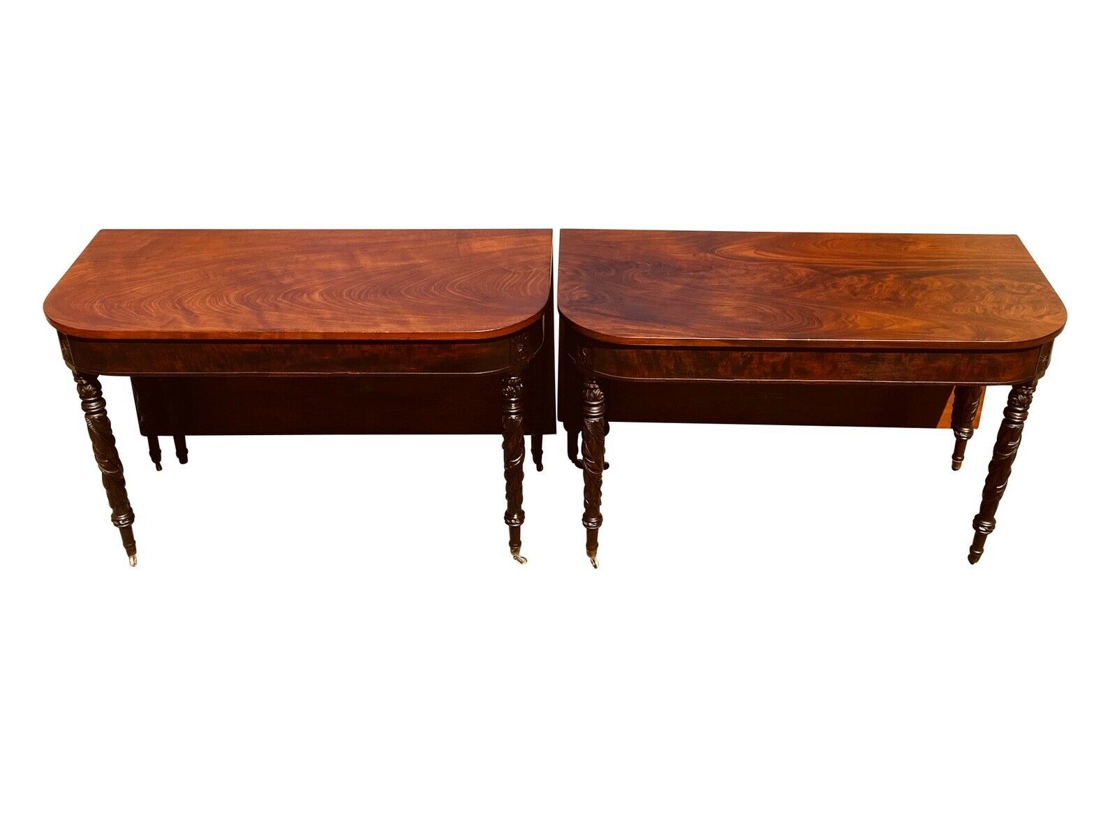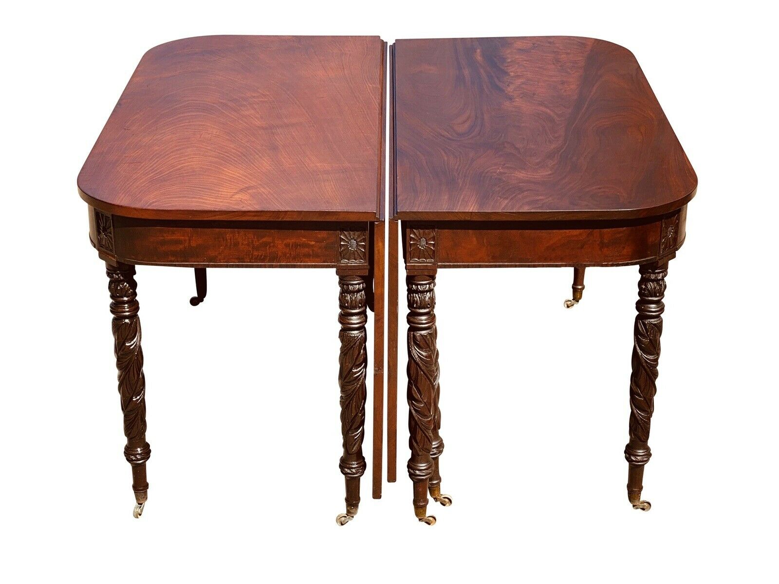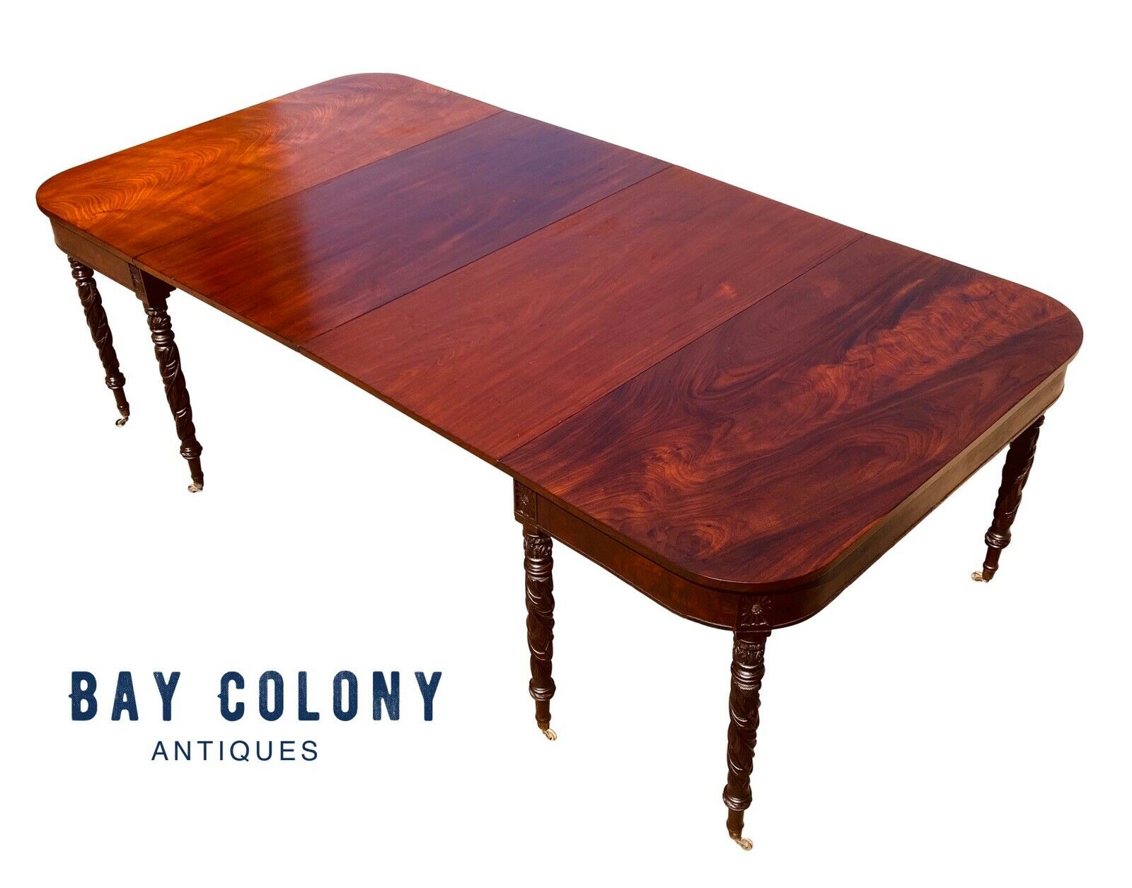 With our highest compliments we're extremely proud to offer for sale this stunning early 19th century antique Sheraton mahogany drop leaf dining table. Those who follow us understand the time, dedication & passion we invest into our practice. We continually scour the country in pursuit of top tier investment grade antiques for our discerning clients. We're always in the market for these and are ecstatic to bring this period New England table to market. This table is crafted from the absolute best grades of imported Caribbean mahogany. Examining the proportions, style, grade of lumber, top tier carving work, and a multitude of other factors we feel confident in saying this is a Salem, MA / north shore table. The table features magnificent single board tops & single board leafs. These cuts of mahogany represent the absolute best grade of imported timber and wouldn't be available outside of a major trade city like Salem, Boston, or Philadelphia. The table is in it's original surface finished in a beautiful red mahogany finish. If you attempted to have this table commissioned today it would be impossible, the wood doesn't exist anymore. Caribbean mahogany is the best in the world with special oil densities & mineral deposits that give it it's signature sheen. Caribbean mahogany was immensely popular in 18th & 19th century cabinet making and was farmed to near extinction levels. This dining table has masterfully carved acanthus formed legs with carved patterae designs along the apron. Each end of the dining table measures 48" wide x 24 1/2" deep x 29" tall when closed. When the leaves are extended and the table is completely set up it measures 48" wide x 95 3/4" long x 29" tall.
