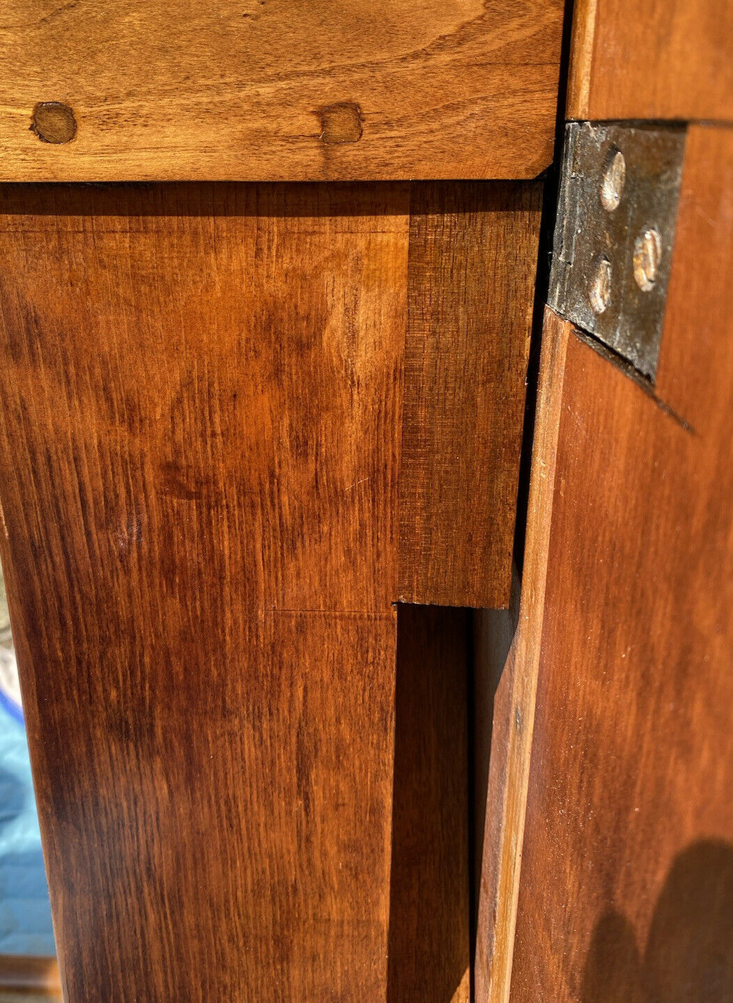 Bay Colony Antiques is proud to offer for sale this fantastic 19th century antique New England Cherry drop leaf table. This fits a good design need because most we encounter are in a darker finish. The table has a figured Cherry top with rounded corners and a flared end on each leaf. The scrolling is pretty unusual and is part of the charm that comes with country made pieces opposed to ones made in a major city like Boston. New England country cabinet makers would usually work in native woods like Cherry or Maple as Mahogany was quite expensive and often times wouldn’t make it too far past the port cities. The table is extremely well made and is in fantastic condition with our only notes being a few discolorations to the top, minor wood loss near one of the hinges at the rule joint, and minimal surface wear. The table is completely undisturbed and retains its original iron hinges and the original glue blocks are still present. The table measures 19 3/4” wide x 35 1/2” deep x 29 1/4” tall. When the leaves are locked up the top measures 46” wide x 35 1/2” deep.