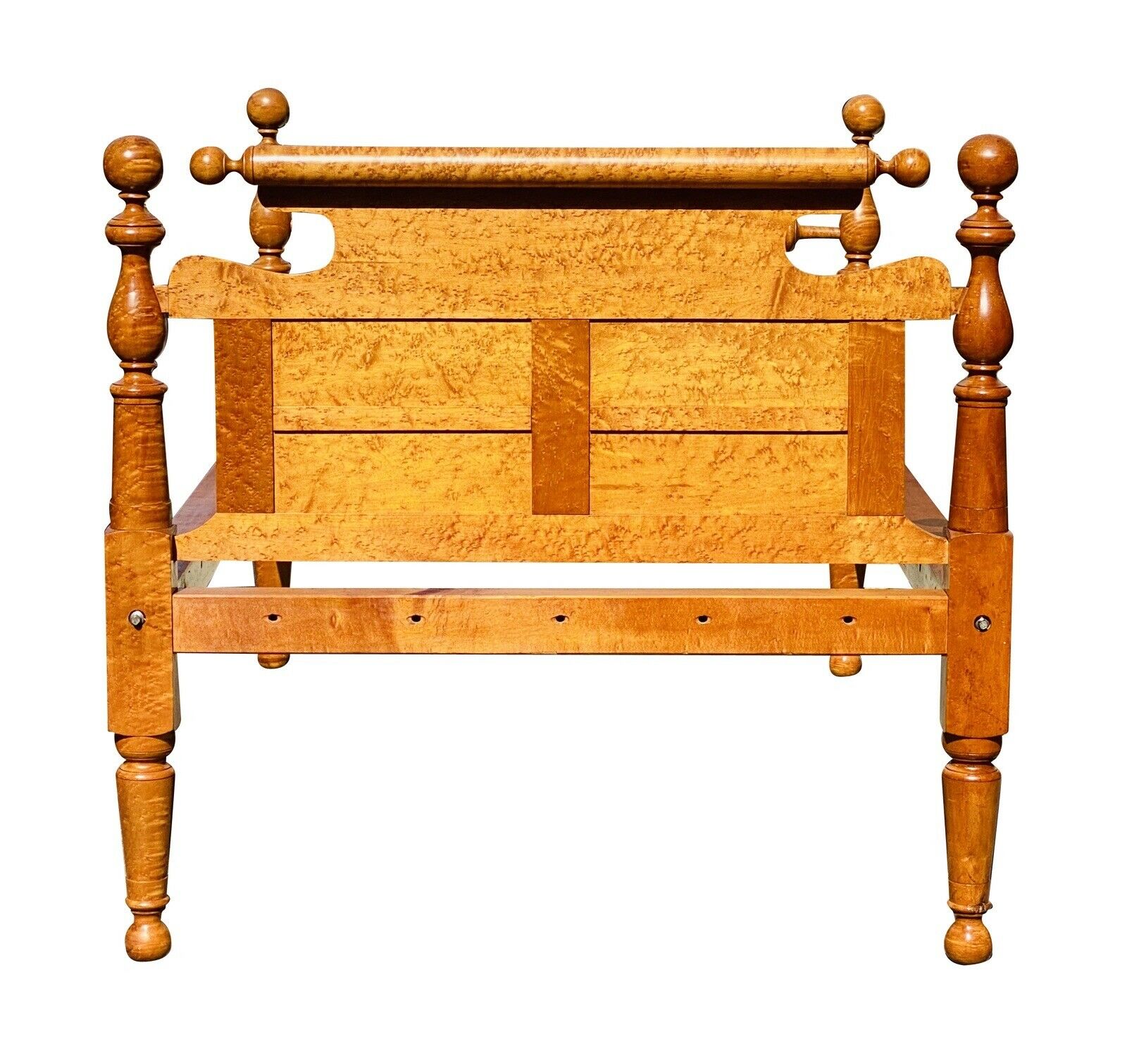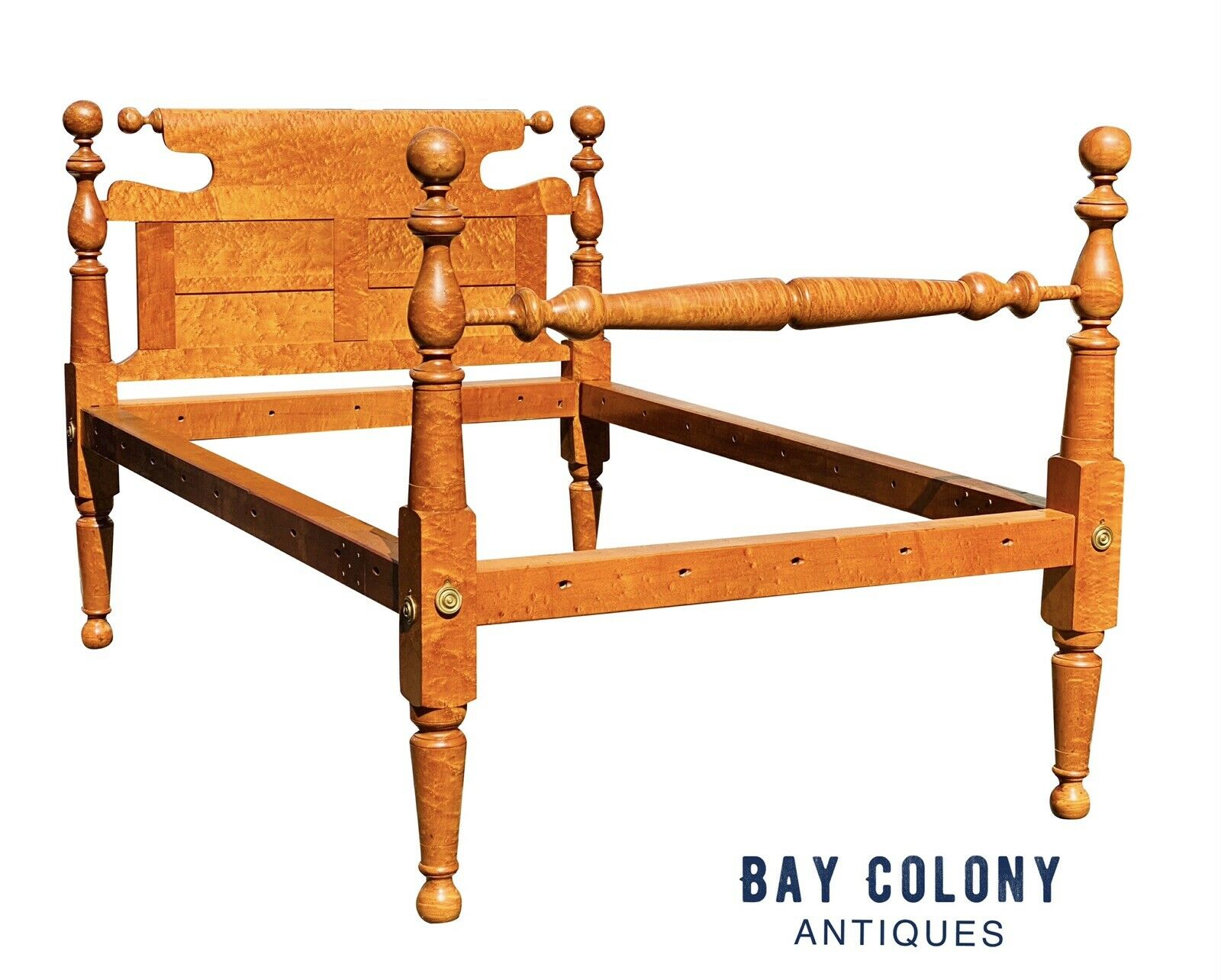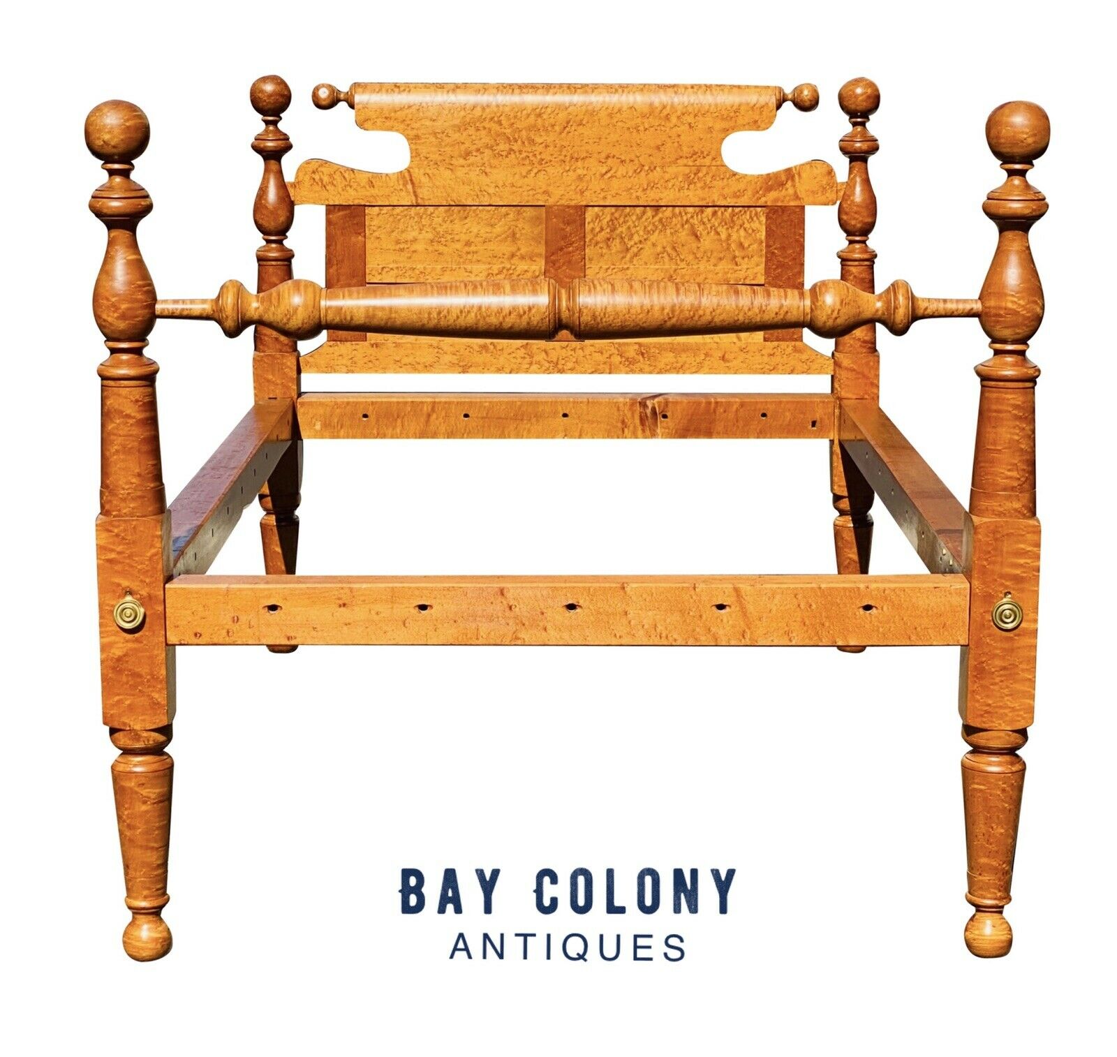 With our highest compliments and utmost honors, Bay Colony Antiques is proud to offer for sale this fantastic 19th century antique Federal Birds Eye Maple Cannonball bed. The bed is solid Birds Eye Maple and features an extremely bold grain throughout the entire piece. The bed has a paneled headboard with a curved crest rail with cannonball ends. The footboard has a Birds Eye Maple blanket rail with a wonderful turning pattern that adds character & utility to the bed. The bed measures 53 1/4" wide x 83 3/4" deep x 49 1/2" tall overall