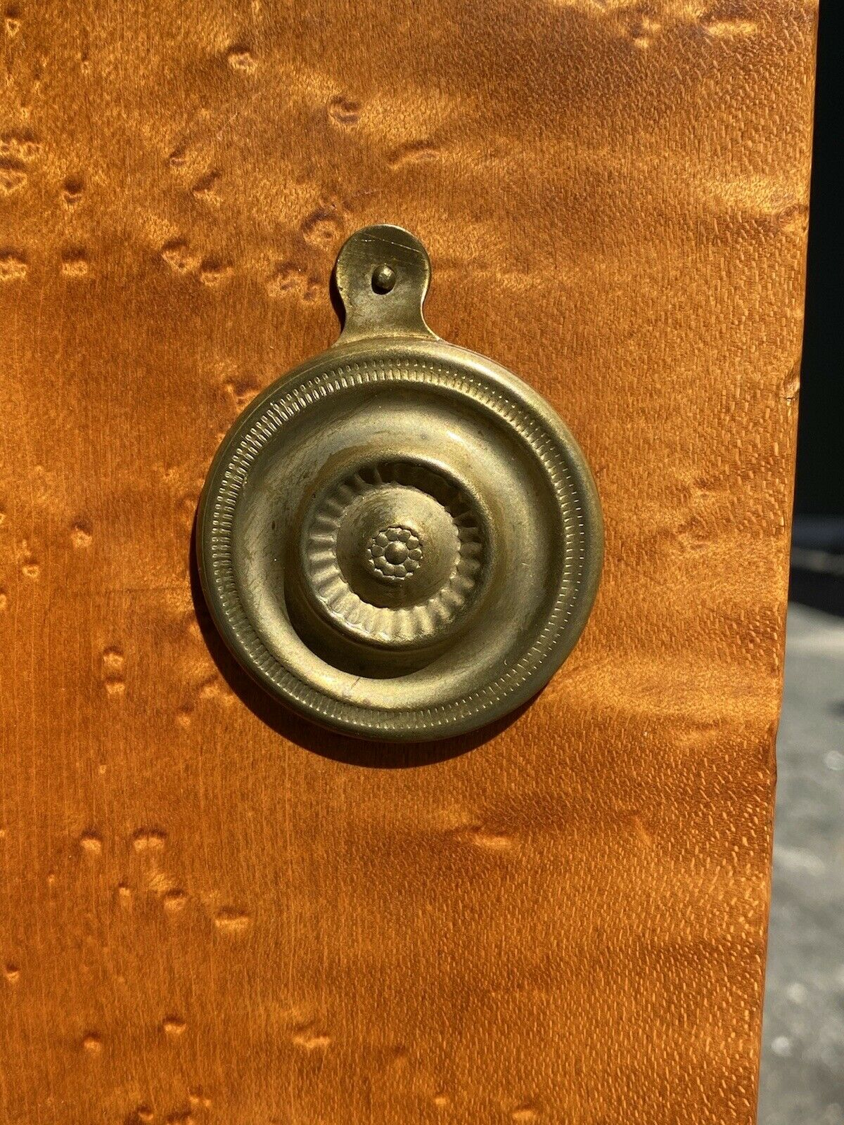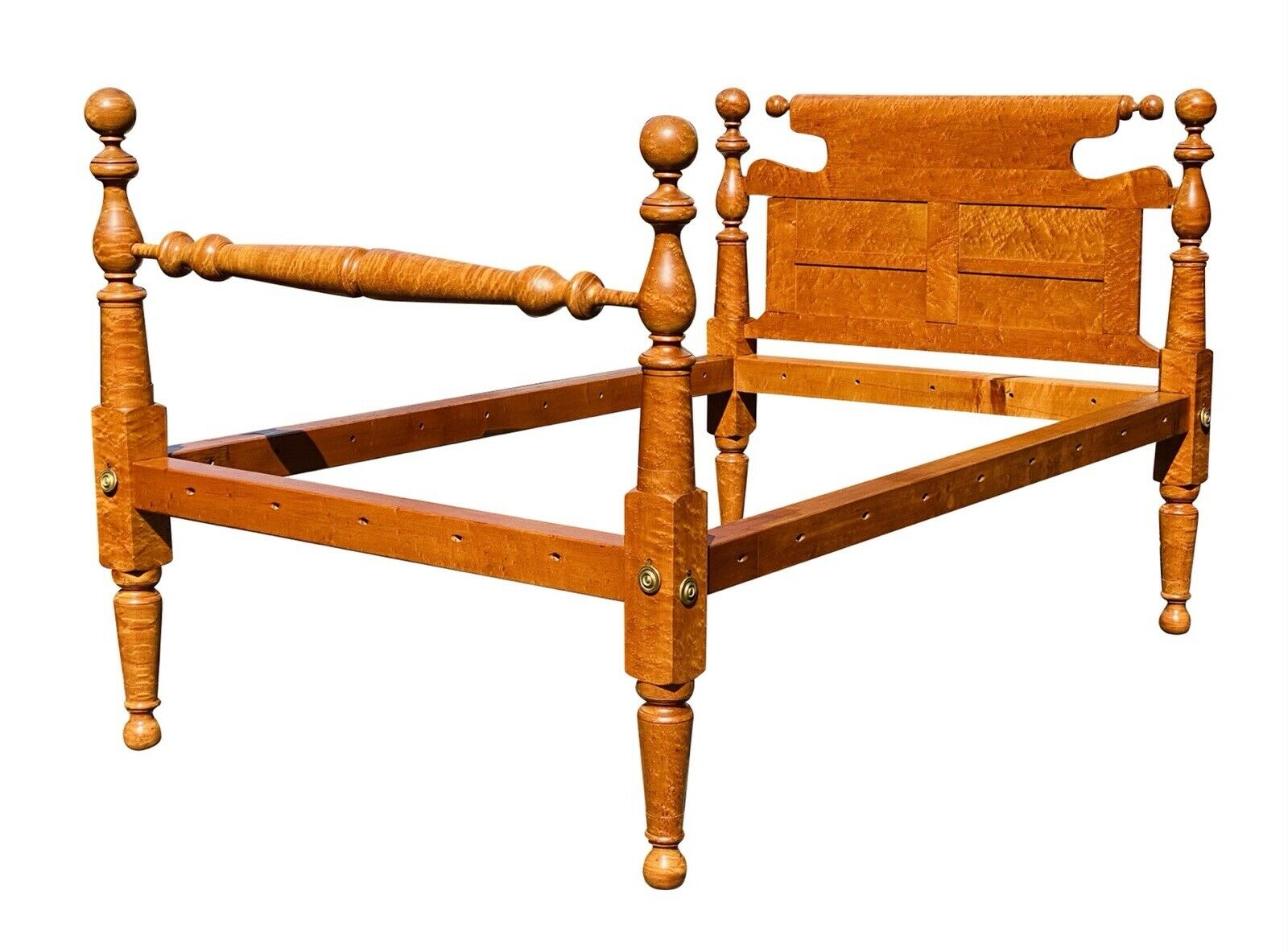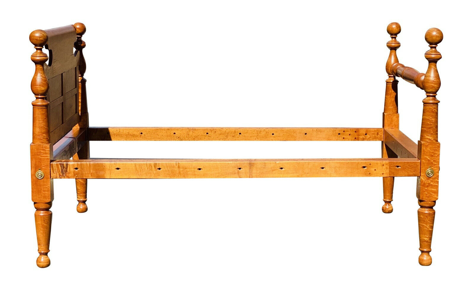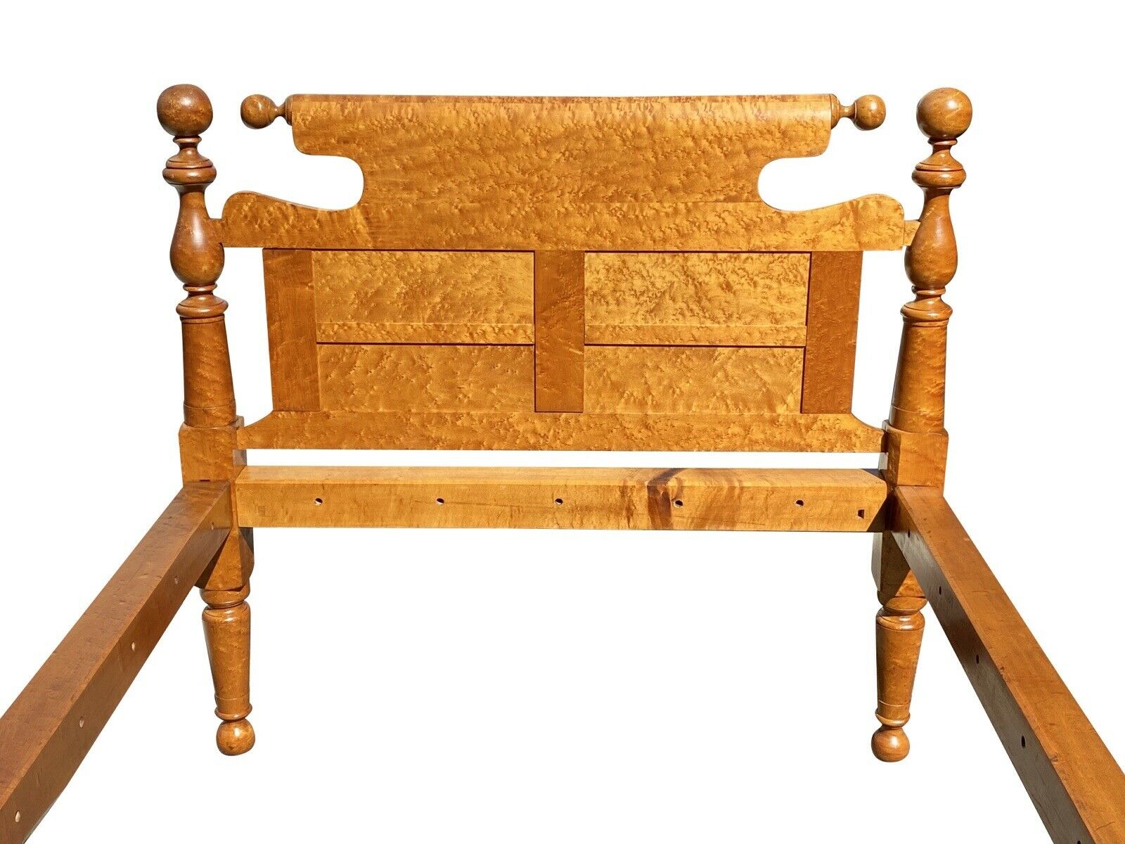 With our highest compliments and utmost honors, Bay Colony Antiques is proud to offer for sale this fantastic 19th century antique Federal Birds Eye Maple Cannonball bed. The bed is solid Birds Eye Maple and features an extremely bold grain throughout the entire piece. The bed has a paneled headboard with a curved crest rail with cannonball ends. The footboard has a Birds Eye Maple blanket rail with a wonderful turning pattern that adds character & utility to the bed. The bed measures 53 1/4" wide x 83 3/4" deep x 49 1/2" tall overall