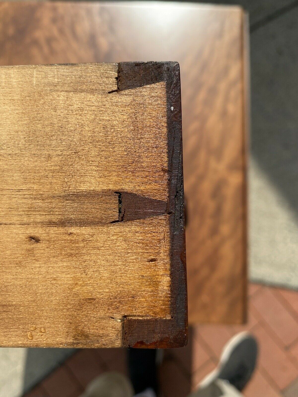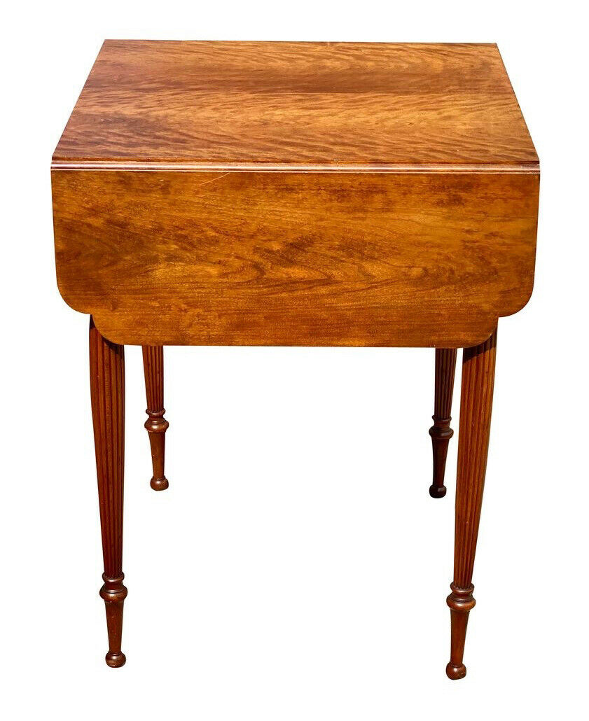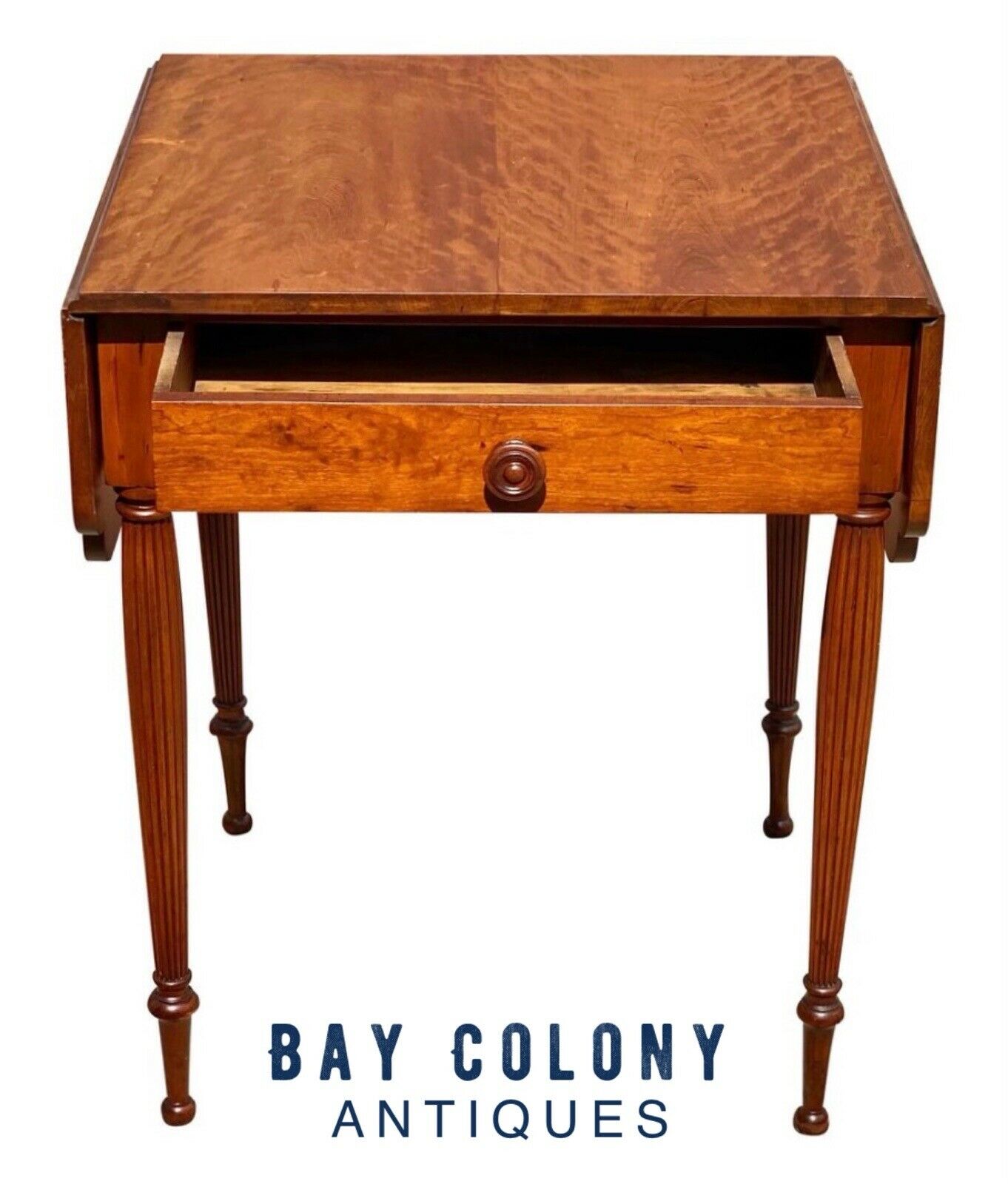 Bay Colony Antiques is delighted to offer for sale this charming 19th century antique Federal period Cherry work table / nightstand. The table possesses a vibrant curly cherry drop leaf top with pinched corners. The table has a single drawer with pine secondaries, hand cut dovetails, & hand chamfered bottoms rich with tool marks. The table has very finely formed tapered reeded legs with ringlet turnings & compressed ball feet. We have to be pretty selective with our work tables as most people don't want to spend ~$250 to ship a $500 table across the country. Aside from the table's exceptional form and utilitarianism, the rare curly cherry set this right off the charts for us. Roughly 200 years ago when this table was made it wouldn't have been as desirable of a piece as the same table made from imported Mahogany. It's funny how things change as today the opposite is true. The stand measures 23" wide x 22" deep x 27 3/4" tall. When the leaves are extended there's a generous work surface measuring 39 1/4" wide x 22" deep.