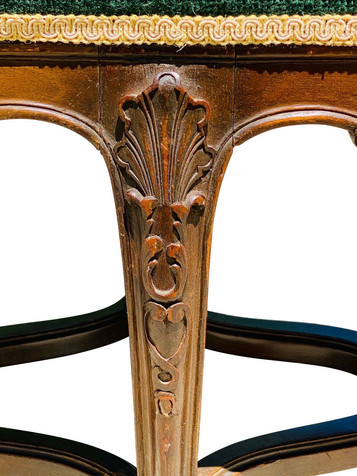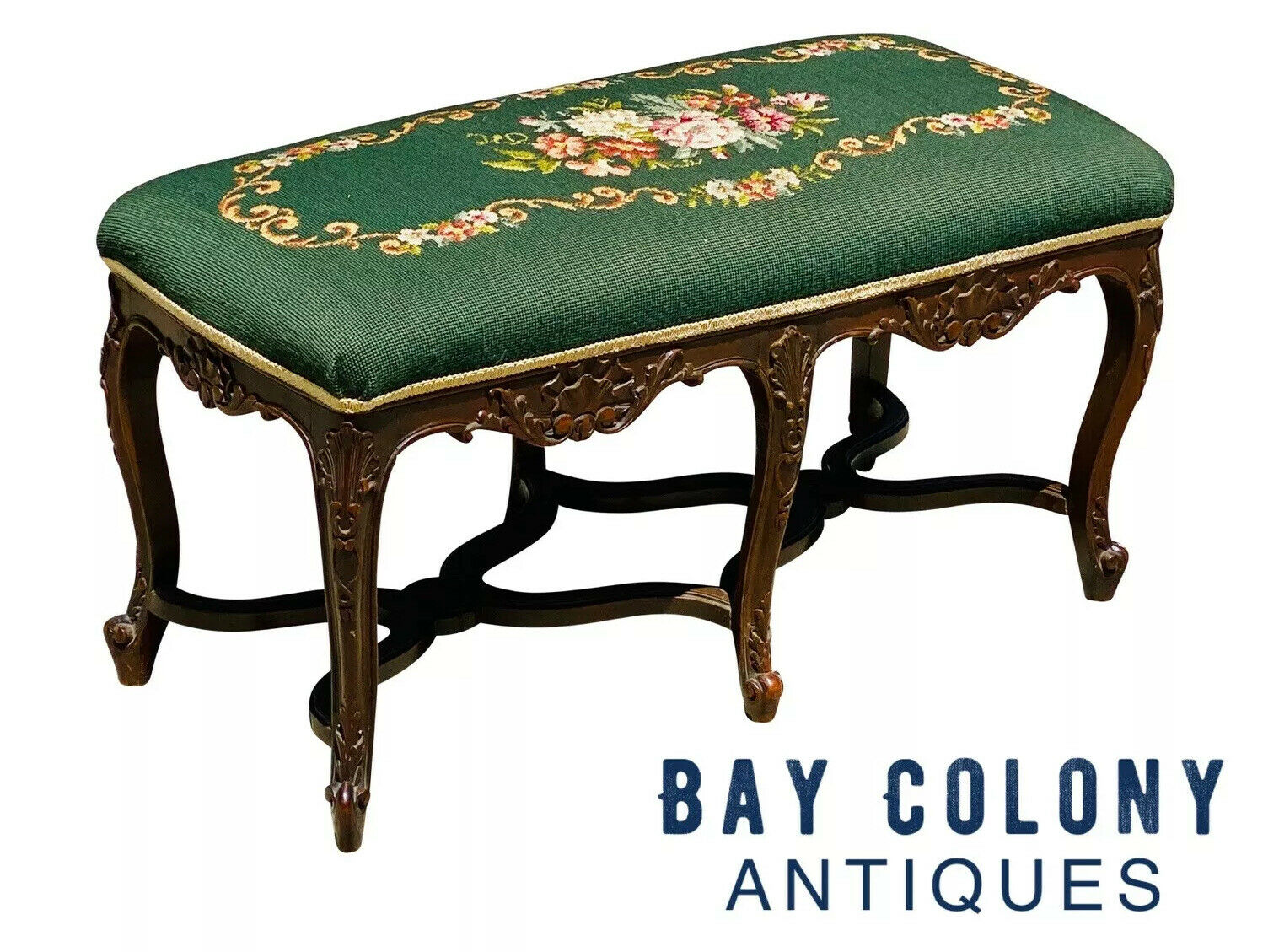 We're delighted to offer for sale this wonderful 19th century antique French walnut window / vanity bench. We have a little trouble keeping these in stock because they're so highly sought after and quickly purchased. The bench has a nice molded frame with shallow shell carvings throughout the body and finely formed cabriole legs with Rococo style whorl feet. These work really well in bedrooms, with vanities, as window benches etc.. The needlepoint seat is decorated with a beautiful multi color floral pattern with floral border amid a forest green field. This bench has 6 legs and an elaborate base stretcher making this solid as a rock. The bench measures 35" wide x 16" deep x 19" tall.
