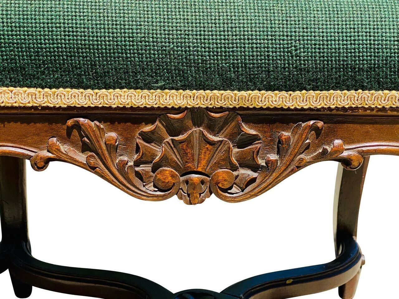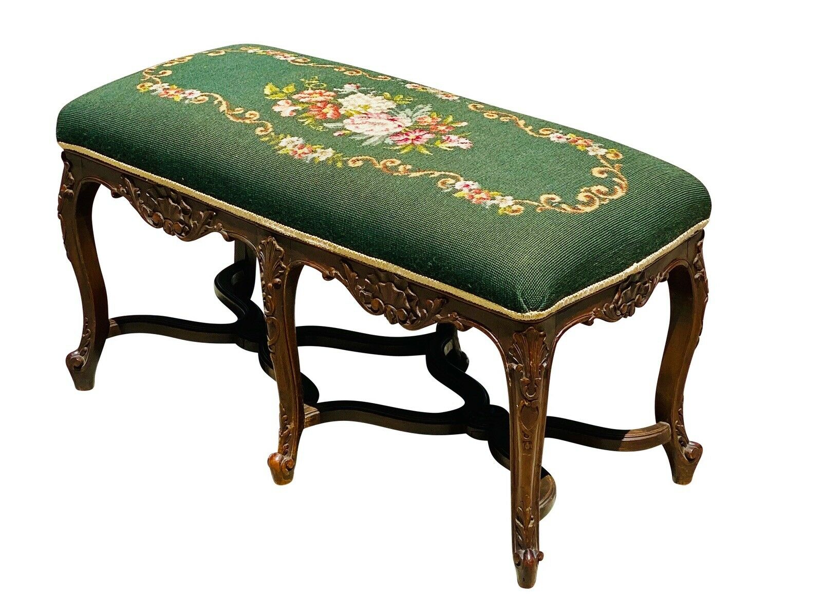 19TH CENTURY ANTIQUE FRENCH WALNUT WINDOW / VANITY BENCH WITH GREEN FLORAL DESIGN NEEDLEPOINT SEAT