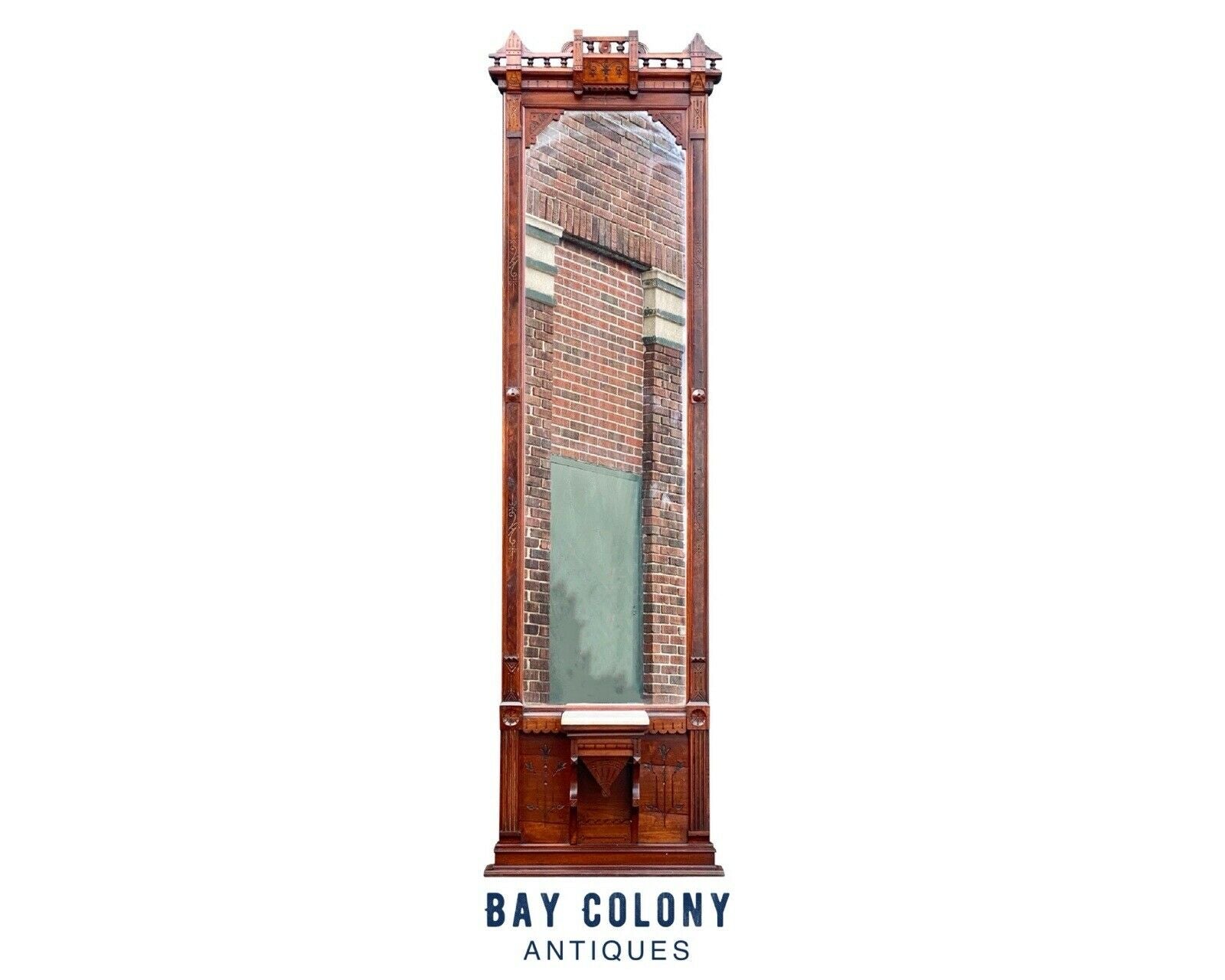 Bay Colony Antiques is delighted to offer for sale this exceptional 19th antique Victorian Walnut pier mirror. What a beauty this is and we really enjoy the slender scale as it doesn’t command too much wall space. The mirror has shallow incised carvings with some nice floral elements towards the base and other geometric carvings throughout the piece. The mirror has a small marble shelf and a very nice cornice with turned balusters, geometric designs, and a floral carving at the center. The vertical stiles have beautiful burled Walnut panels that didn’t photograph too well but are very attractive. The mirror is in wonderful condition with our only notes being a few old stable age splits at the base panel & some slight veneer lifting on the right stile but no loss to the veneers. We’ll likely end up delivering this if it sells to the east coast but if you’d like it in Texas, California, or anywhere in between we’ve shipped hundreds of these throughout our careers and the slender proportions of this one makes it that much easier to handle. The mirror measures 28” wide x 10 deep x 100” (8’ 4”) tall.