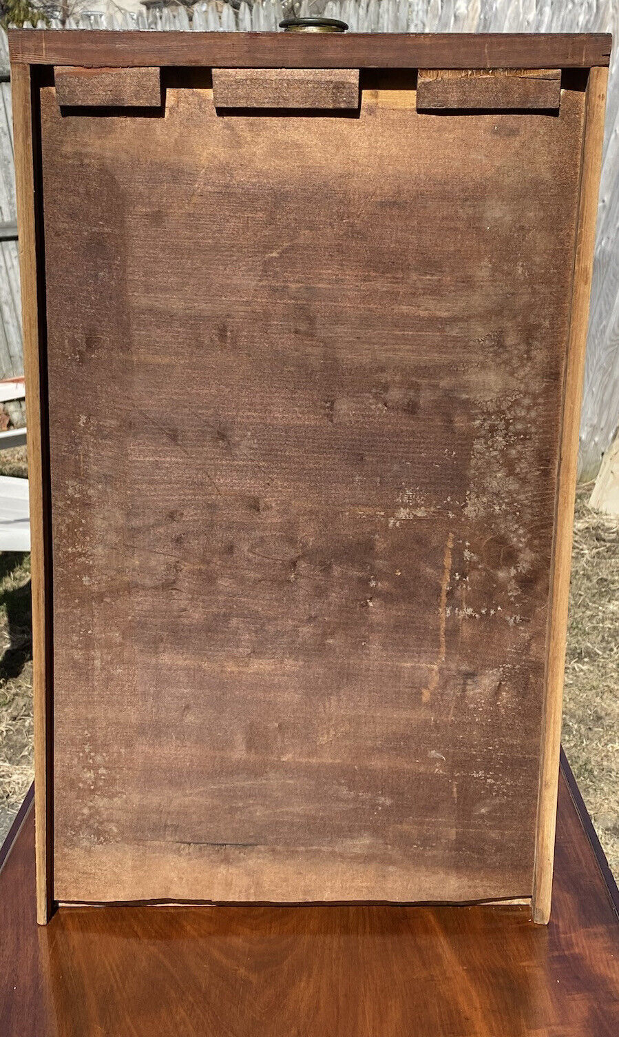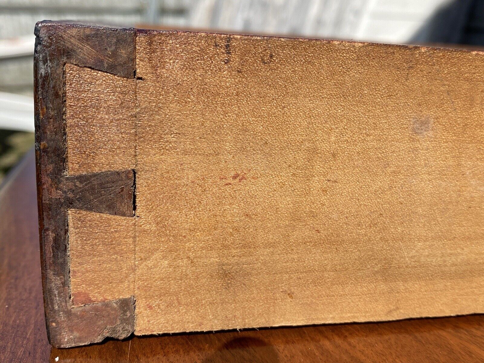 Bay Colony Antiques is proud to offer for sale this wonderful early 19th century antique Federal period Mahogany Pembroke table. The Mahogany selected for the top has a beautiful grain pattern and a nice luster caused by the naturally occurring oil density of the wood. The table has a variegated wood inlay around the drawer and along the skirt. The table has a single drawer with a round brass ring pull and a faux drawer with a matching pull on the back side of the table. The brass pull is stamped “HJ” on the bail which lets us know these were imported from England and were made by Hands & Jenkins. The drawer is extra-long (13 1/4” wide x 22” deep) and is constructed with hand cut dovetails and a hand chamfered panel. There are a couple of small scratches on the drawer face and an old, well-done repair on the right side of the drawer face. There’s a shadow from an overhead power line that can be seen on our top-down photos but this is just a shadow, not a dark diagonal mark on the table. The table is in very good condition with our only notes being minor surface wear, but certainly nothing that would warrant a refinishing. When the leaves are down the table measures 19” wide x 35 3/4” deep x 28 1/4” tall. When the leaves are locked up the top measures 36 1/2” wide x 35 3/4” deep.