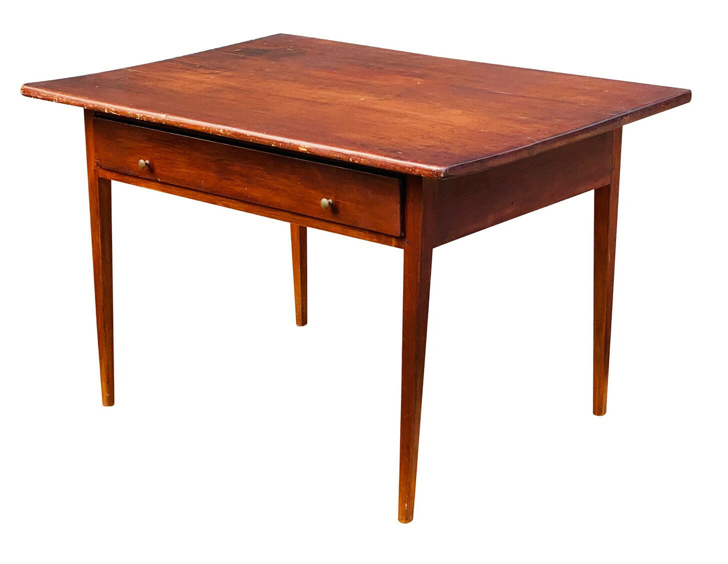 Bay Colony Antiques is spirited to offer for sale this wonderful 19th century antique New Hampshire Hepplewhite pine tavern table. The table has 1 large drawer and retains all of it's original charm and integrity with pegged construction, hand cut dovetail drawer with scribe marks, hand chamfered drawer bottom, & remnants of the original red wash that can be seen on the underside of the table. The table measures 42" wide x 29 1/2" deep x 27" tall. The drawer is a generous 29 3/4" wide x 21" deep with a useable height of 3". The table has 20" of leg space measured from the floor to the bottom of the apron.