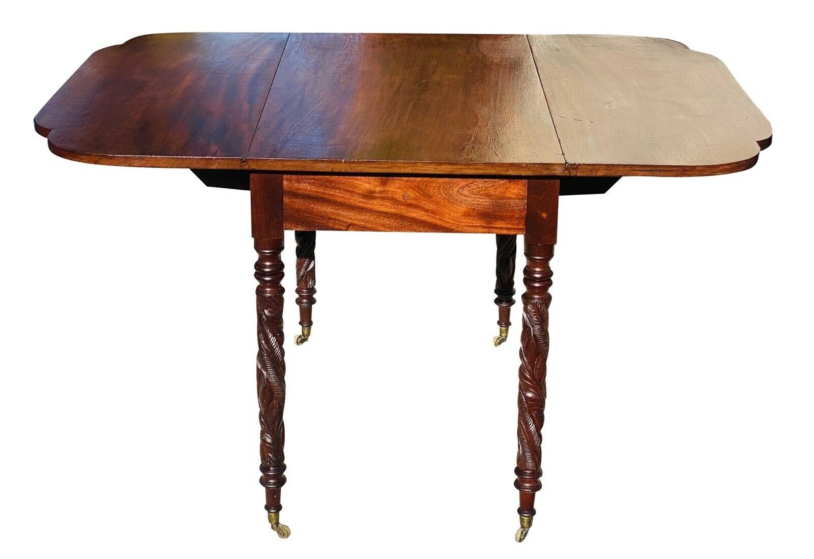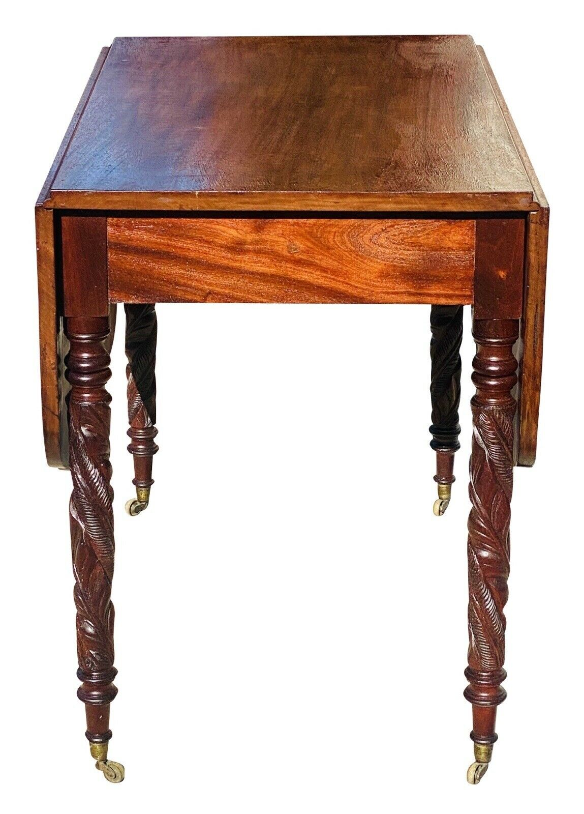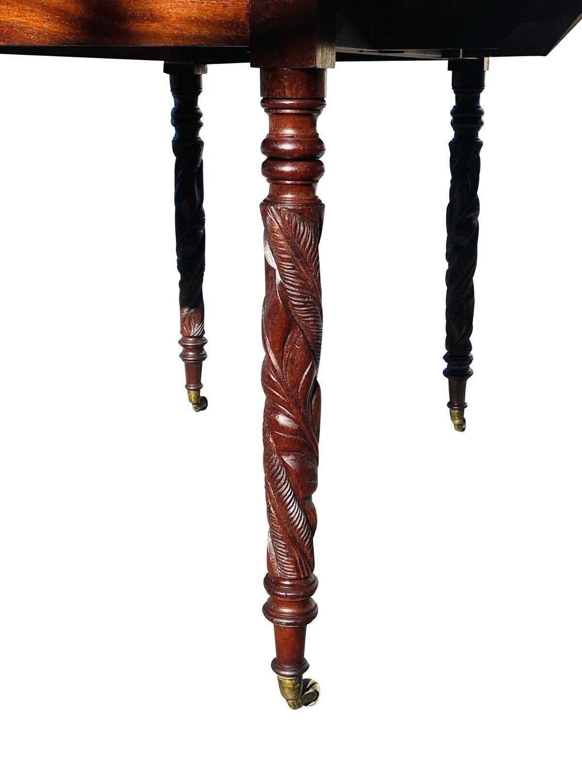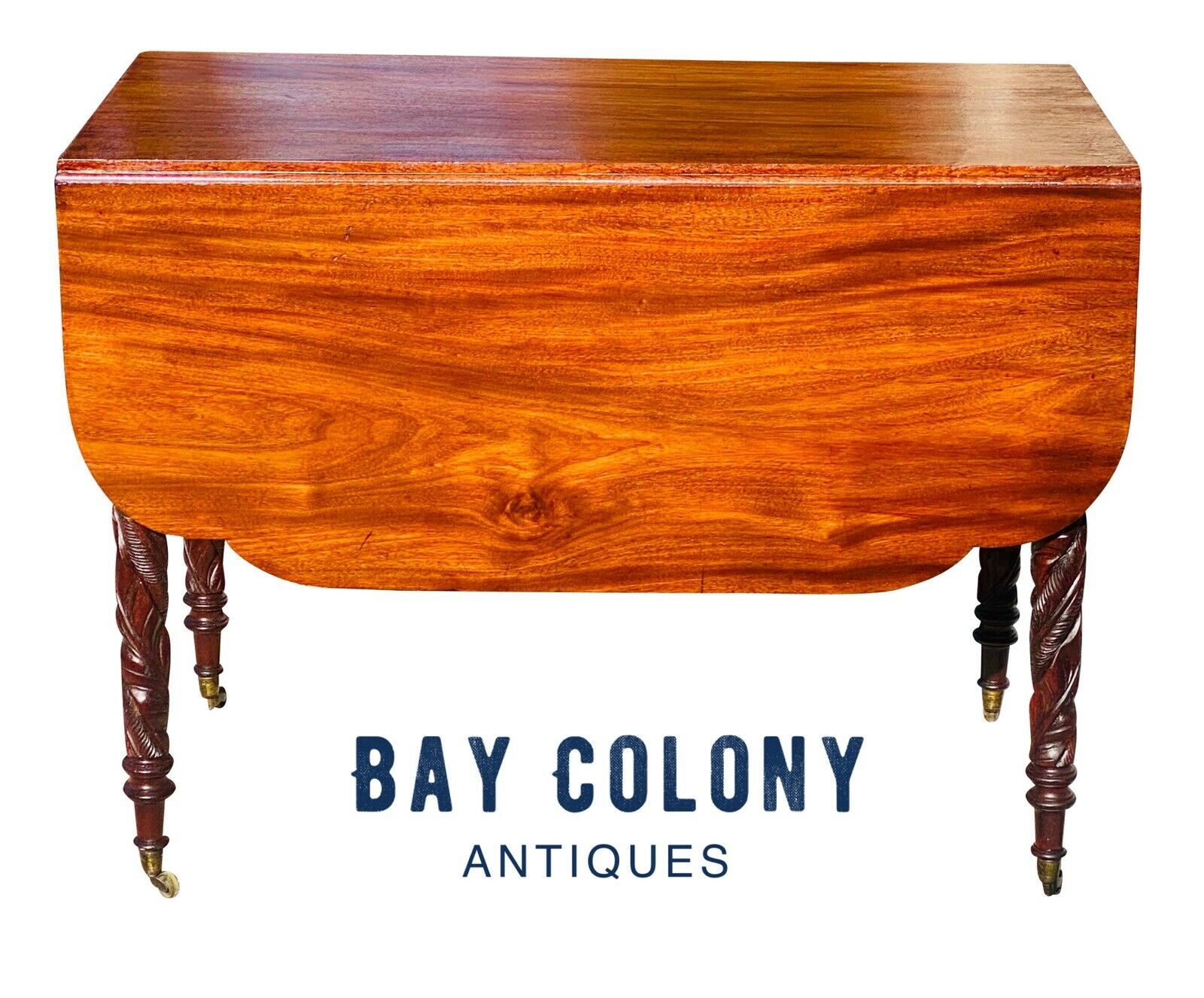 Bay Colony Antiques is proud to offer for sale this fantastic early 19th century antique New York Sheraton Mahogany drop leaf table. The table is crafted from old growth Caribbean Mahogany with an exceptional grain pattern and rich oil density that give the wood its signature sheen. The acanthus carved legs are typical of an early 19th century New York cabinet shop and are well executed with crisp carvings, tight ringlets, and capped with brass caster wheels. The table measures 21 3/4” wide x 38” deep x 28 1/2” tall. When the leaves are locked up the top measures 51” wide x 38” deep.