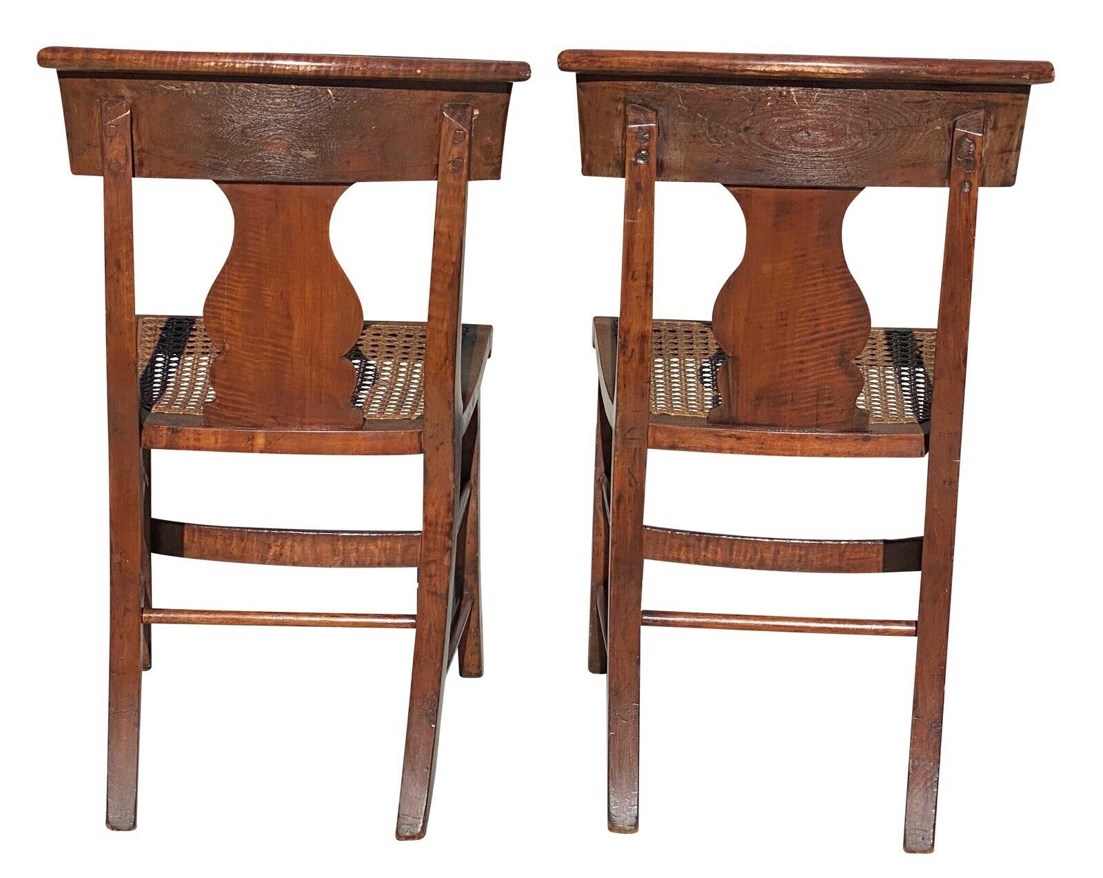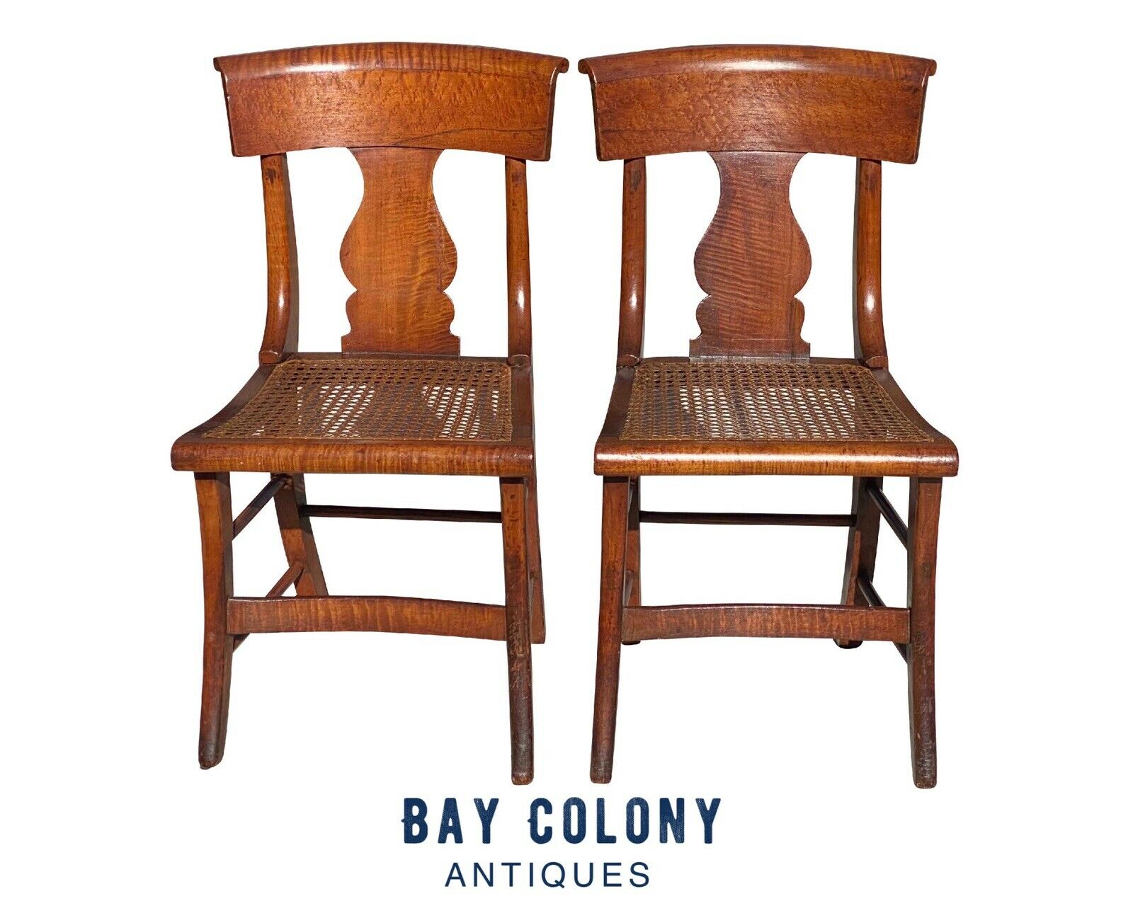 Bay Colony Antiques is pleased to offer for sale this fantastic pair of 19th century antique Federal period Tiger Maple & Birds Eye Maple Sabre legs chairs. The front legs & rear stiles feature horizontal running tiger maple with the grain on the top of the crest, seat rail & curved stretcher deliberately running perpendicular. The splat and crest are well formed with good use of negative space. The chairs have Birds Eye Maple crests with a very desirable figuring. Dendrologists are still not 100% certain on what causes this strange birds eye figuring in the grain and we've heard every theory from fungal infections to genetic mutations, but the best answer is; we don't quite know yet. We've had to purchase birds eye stock for restorations in the past and it's becoming increasingly expensive. The best examples are cut into veneers and used for luxury automobiles, instrument making, and custom cabinetry. Our pictures came out a little dark because it was cloudy the day we photographed these. We would love to have waited for a sunnier day but we have so much new inventory built up we’re just trying to get everything up for sale. The cane seats are free of damage and the chairs are in wonderful condition with our only notes being minor surface wear but nothing that would warrant a refinishing. The chairs measure 17 1/2" wide x 18 1/2" deep x 34 1/2" tall with a seat height of 18 1/2".