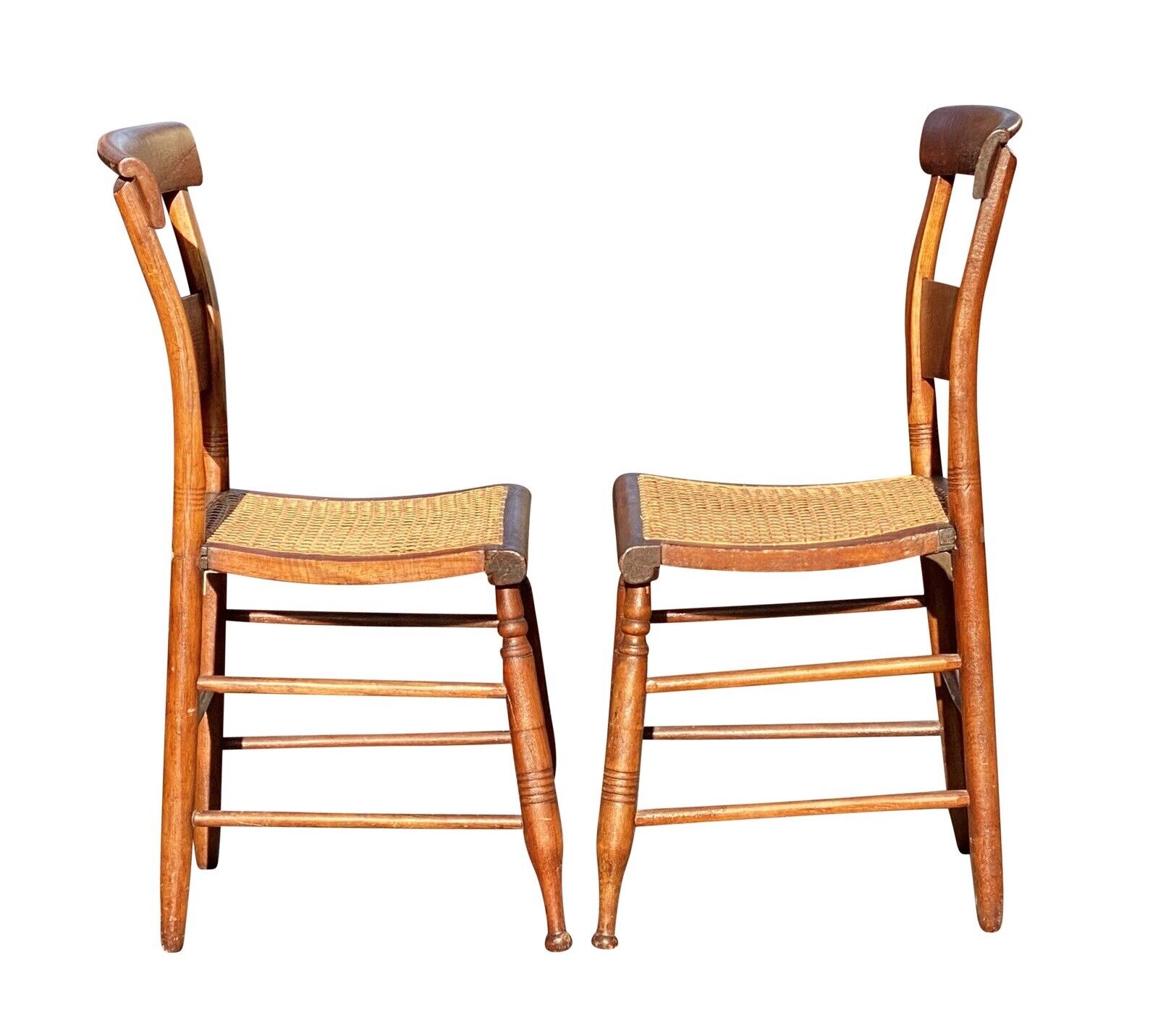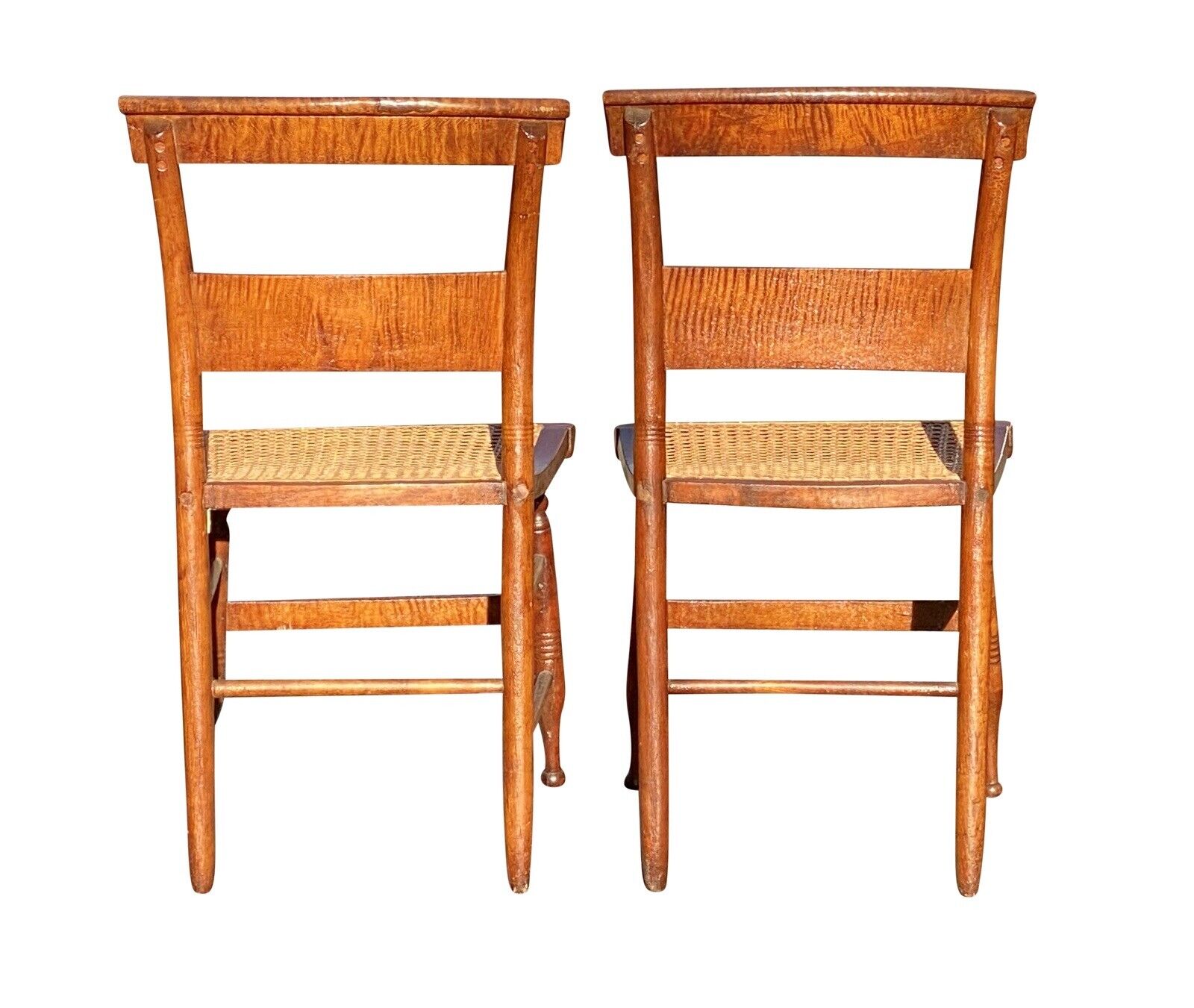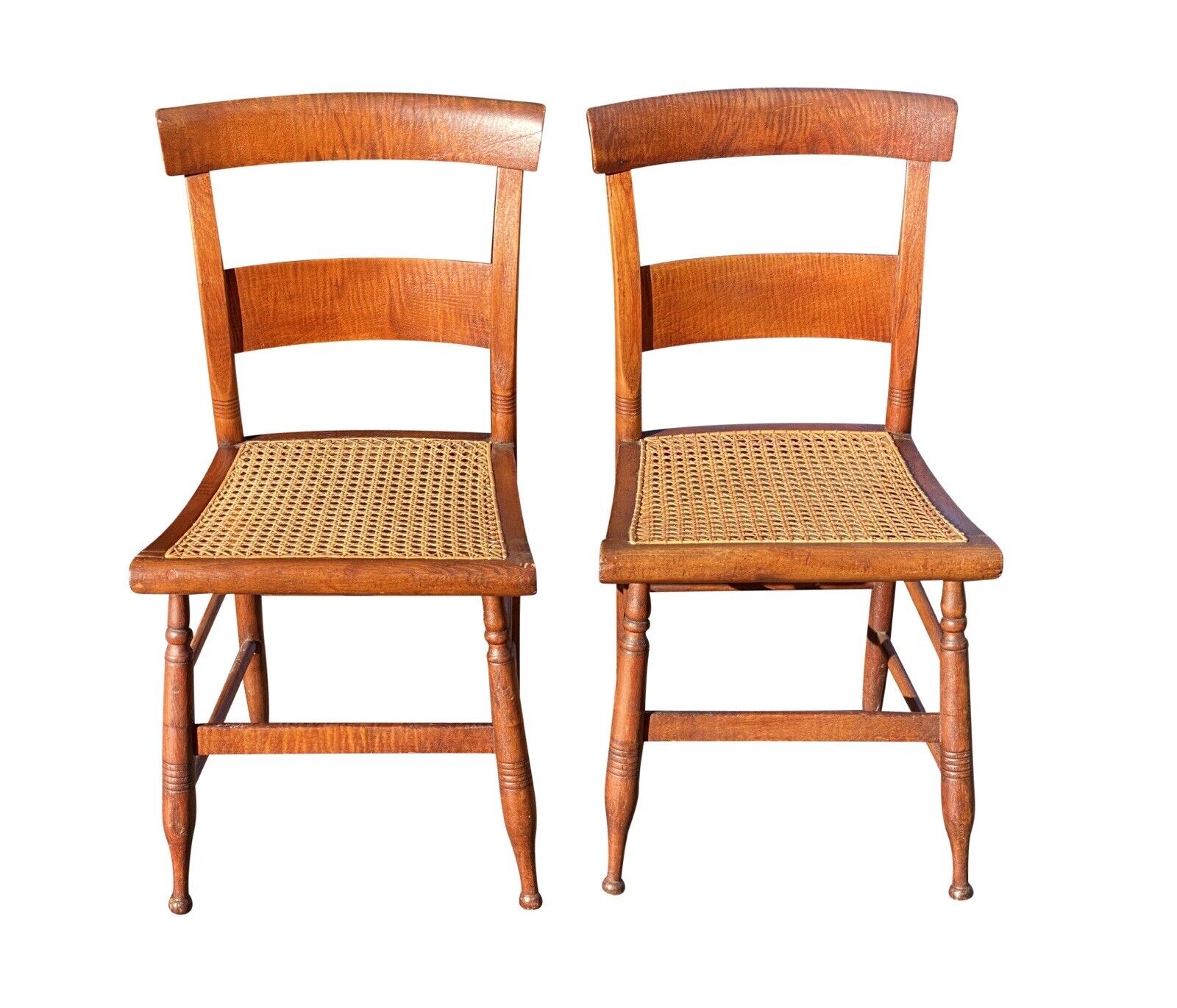 19th C Antique Pair of Tiger Maple Side Chairs With Cane Seats