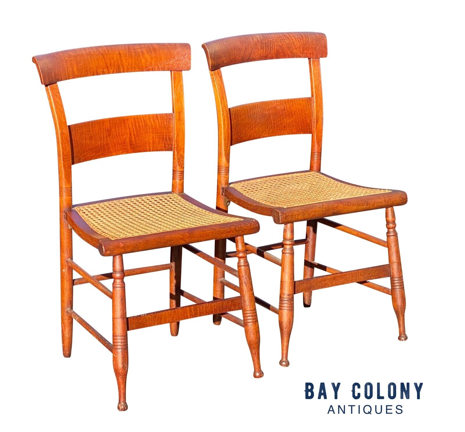 Bay Colony Antiques is proud to offer for sale this fantastic pair of antique Federal Tiger Maple side chairs. The chairs were crafted from bold grain Curly Maple and have cane seats that are free of any damage. The best cuts of Tiger Maple were used for the crest & splat with heavy figuring in the grain. The crest and splat are curved which make the chairs comfortable & they have generous proportions which make the chairs nice & sturdy. The stiles transition from flat to round with a series of ringlet carvings right below the transition. The rear legs are continued from the stiles and the front legs feature a more sophisticated turning pattern with matching ringlet carvings & small button feet. The chairs are in very good condition with our only notes being minor surface wear & metal brackets were added to the rear legs to further strengthen the chairs. The chairs measure 18” wide x 17” deep x 34” tall with a 17 1/2” seat height.