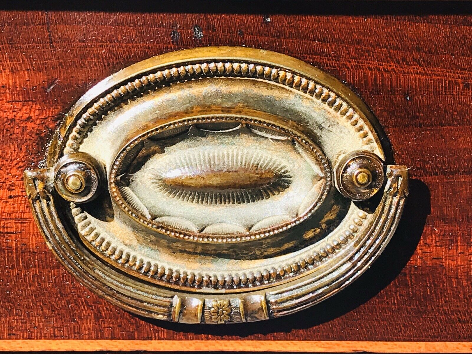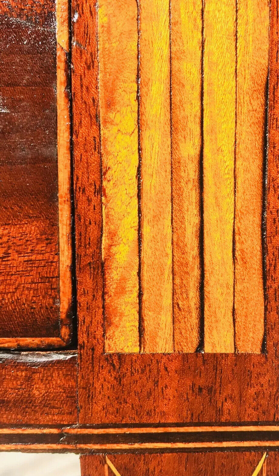 William Lloyd & Pelatiah Bliss are among the earliest known Springfield cabinet makers & the best documented. They're known for using local hardwoods, mainly cherry and used an icicle inlay indicative of the area. This table is crafted from some of the finest cuts of imported Caribbean Mahogany. Caribbean mahogany is the best in the world with it's signature luster achieved by a special oil density present in the wood. This table is especially significant considering the quality of wood stock used. This mahogany would be impossible to find in Western MA and surely made it's way to Bliss' hands as a special order from the port of Boston. We've had this in our personal collection for the longest time but would like to now offer this to our clients. The inlay is masterfully executed and the table retains it's original brass hardware. We don't have a photo of the back shown but the back of the table is fully finished & inlaid like the front and has an identical brass on a faux drawer. The table has shaped leaves with a double string inlay along the edge. & extensive string inlay along the legs & inlaid cuffs. These seldom come to market but when they do they generally fall right below 5 figures. The last one we saw sell at a prominent New England Auction realized ~ 9K after buyers premium and frankly wasn't as nice as this one. We note minimal age expected tear out near the hinges at the rule joint and that's the absolute worst we can say. The table measures 32 1/2" long x 21 1/2" wide x 28 3/4" tall. When the leaves are locked up the width goes from 21 1/2" to 40 1/4".