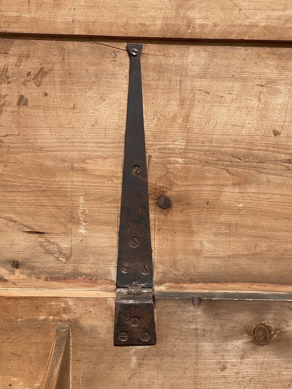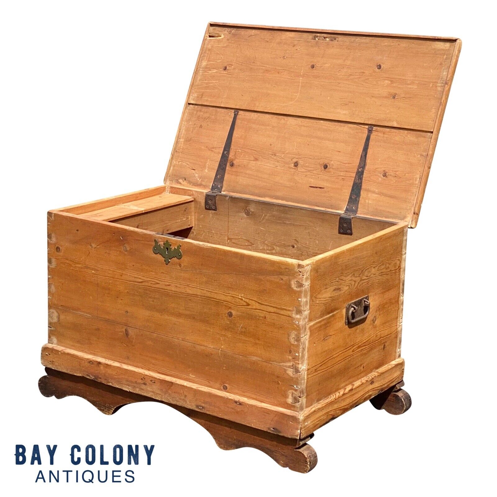 Bay Colony Antiques is Proud to offer for sale this charming 19th century antique Queen Anne style Pine blanket chest. We purchased this from a Newburyport home right on the waterfront on Plum Island. The chest retains its original iron strap hinges and lock, but the side handles and brass escutcheon plate were later additions. The chest is extremely well made and because it’s made from Pine it would have probably been painted or finished with a red wash. It’s not uncommon to find these scrubbed out like this because when an illness would run through a community the homes would be thoroughly cleaned, including the furniture. The interior has a small candle till that measures 3 1/2” wide x 19 1/4” deep x 2 3/4” tall. The primary cavity has useable dimensions of 31 1/4” wide x 19 1/4” deep x 16 7/8” tall. The overall dimensions of the chest are 35 3/4” wide x 21 1/2” deep x 22 1/4” tall. When the lid is fully open the height is 42 1/2” tall.