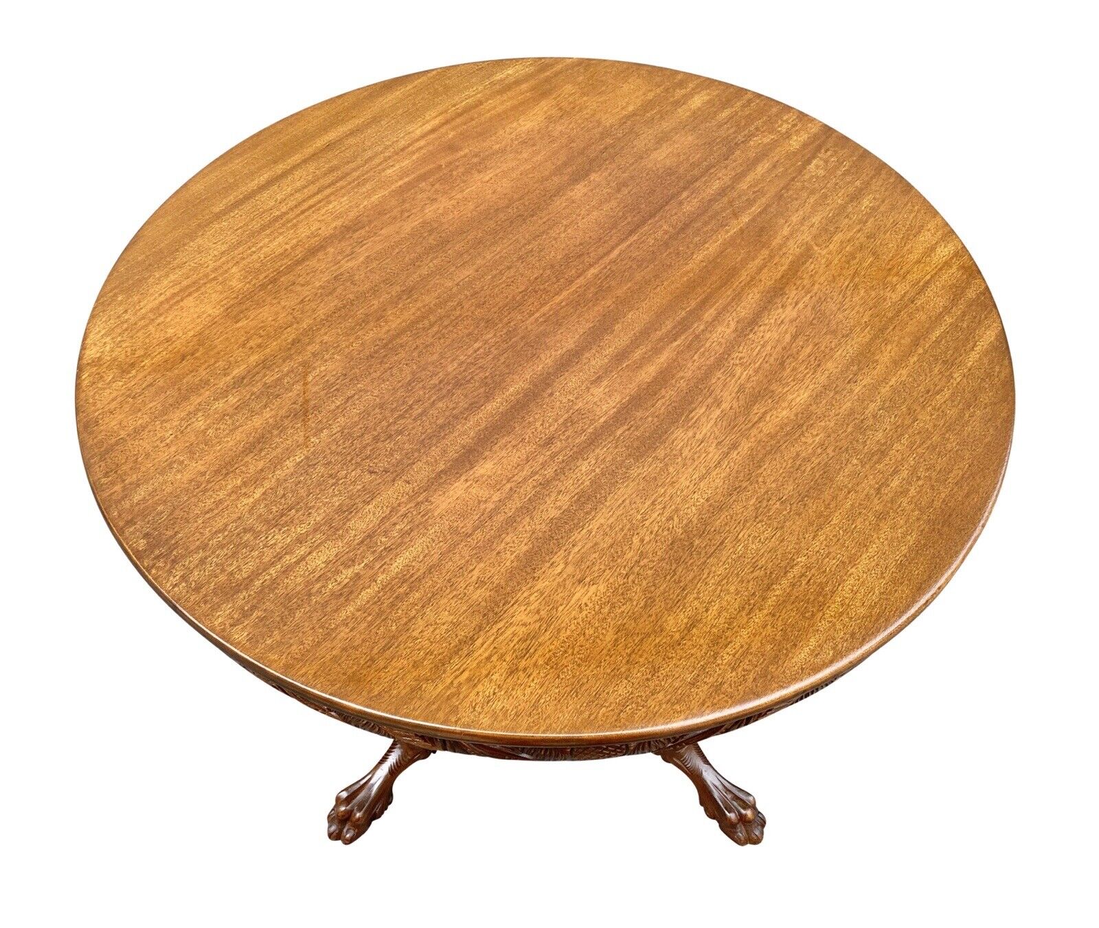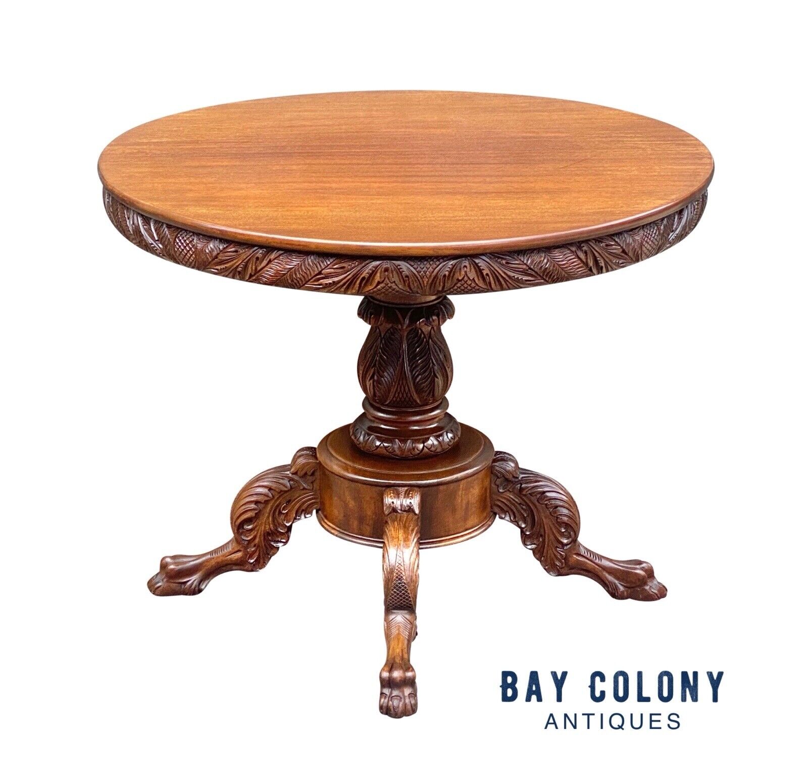 Bay Colony Antiques is proud to offer for sale this beautiful 19th century antique Mahogany parlor table. The table was made in the Neo-Classical style that was popular in the early 19th century but was made towards the end of the 19th century and is what we refer to as second period. The design might have been revisited around the centennial celebration or may have just been a custom order as even today classical style furniture is very popular. The table has a large Mahogany top with carved Acanthus leaves and cross hatched carvings on the apron. The table has 4 carved lion paw feet with additional Acanthus leaf carvings and shallow hatch carvings on the upper edge. The table is in very good condition with our only notes being minor surface wear to the top and a very small piece of carving work missing from one leg that can be seen in our standalone photo. The table has a 36” diameter and stands 28 3/4” tall with 25 5/8” of clearance under the apron of the table.
